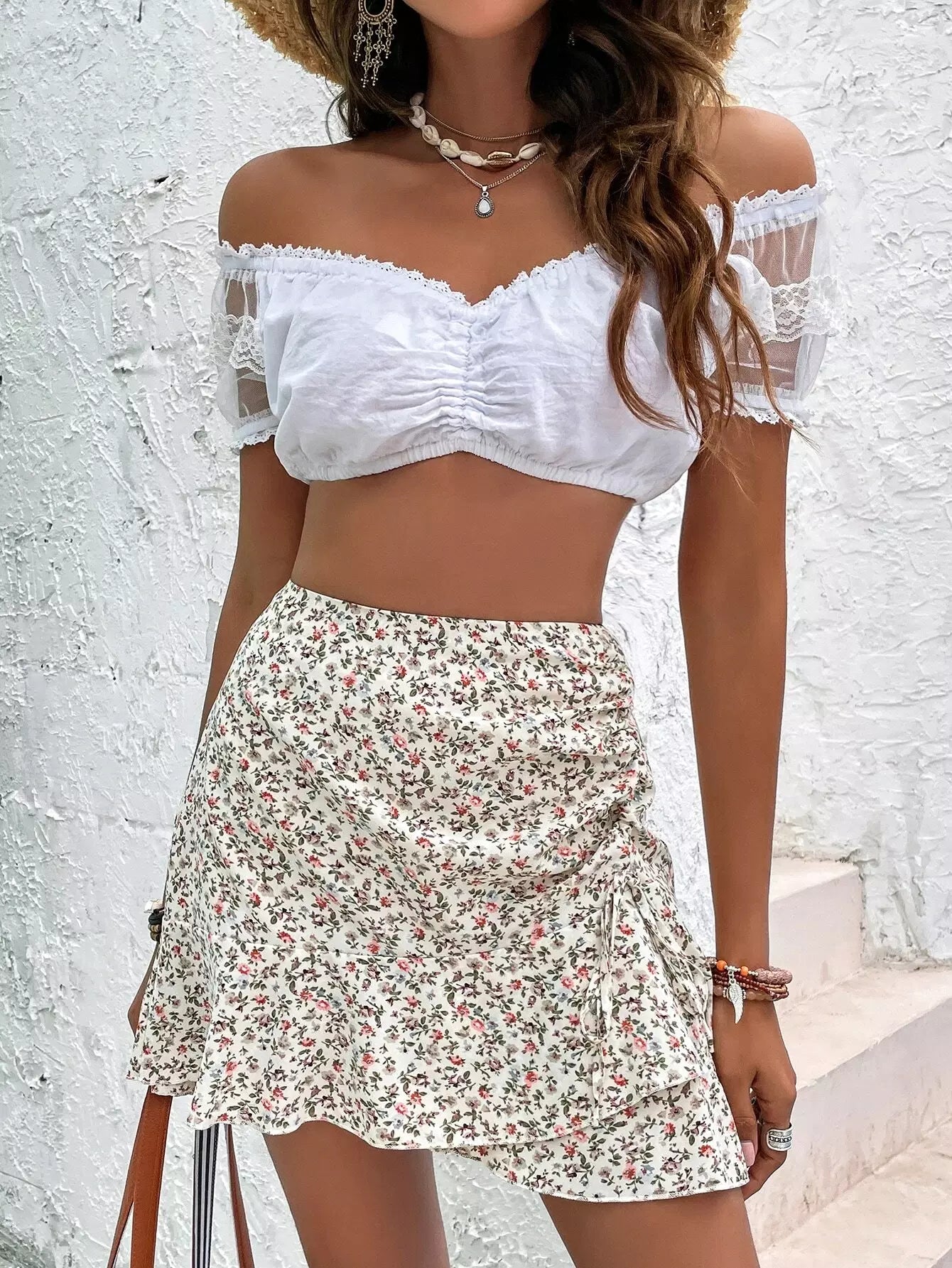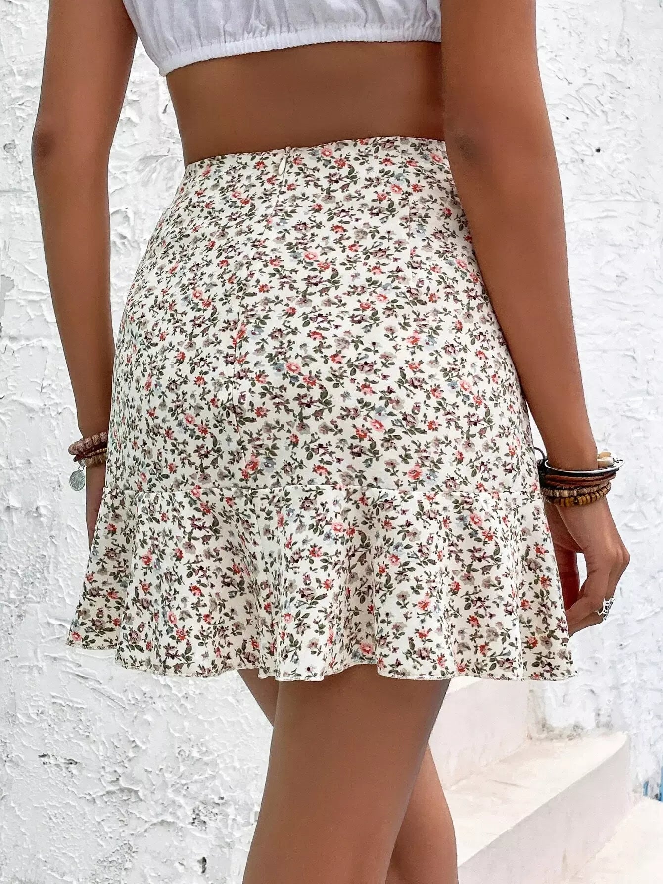 فستان كشكش بحافة كشكش أمامي برباط أمامي مزين بالورود