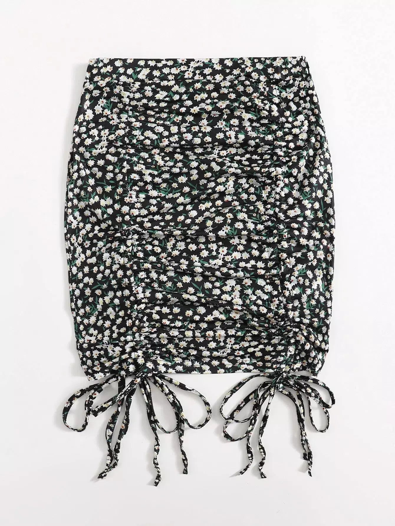 تنورة ضيقة مزينة بنقشة زهور صغيرة مع رباط وتفاصيل مجعدة
