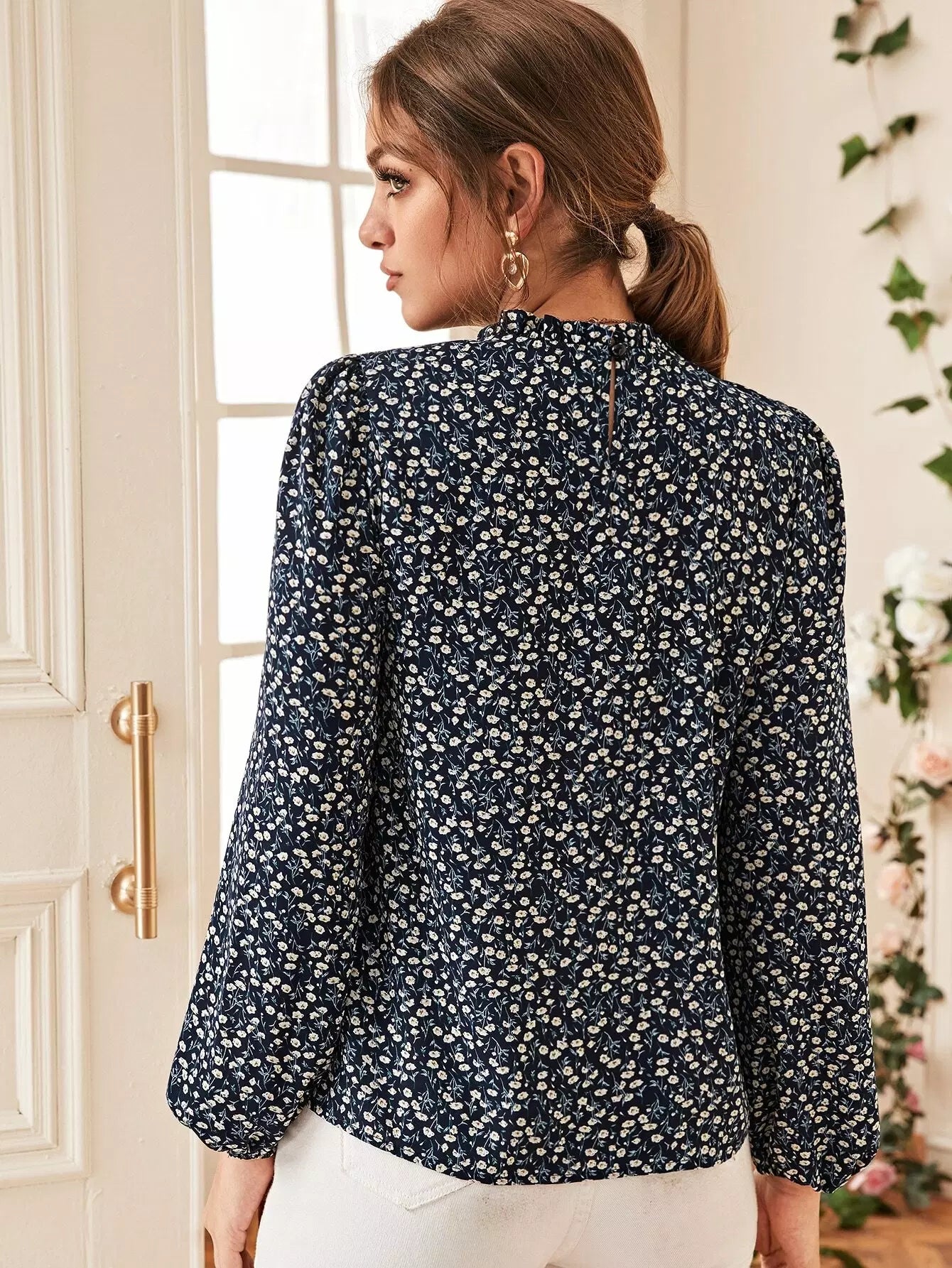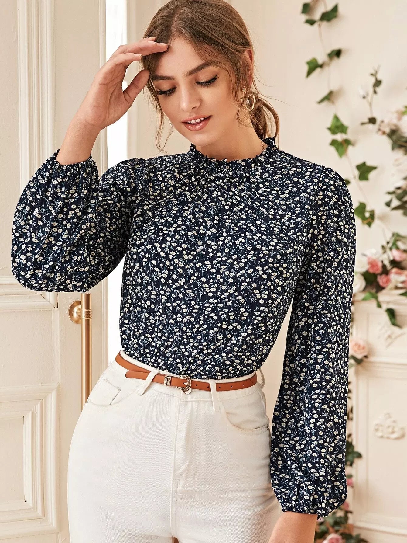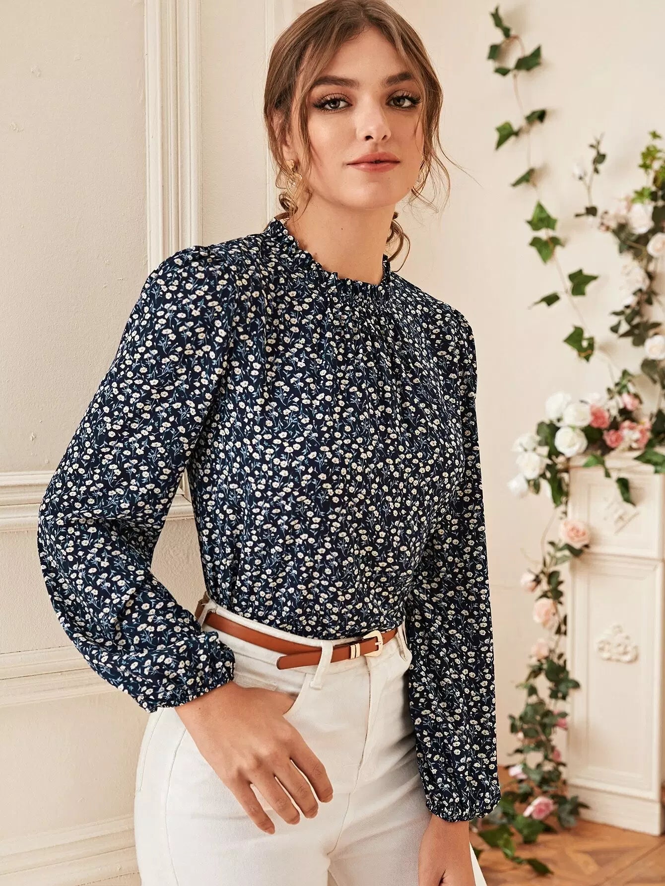 بلوزة برقبة كشكش مزينة بالورود المزركشة