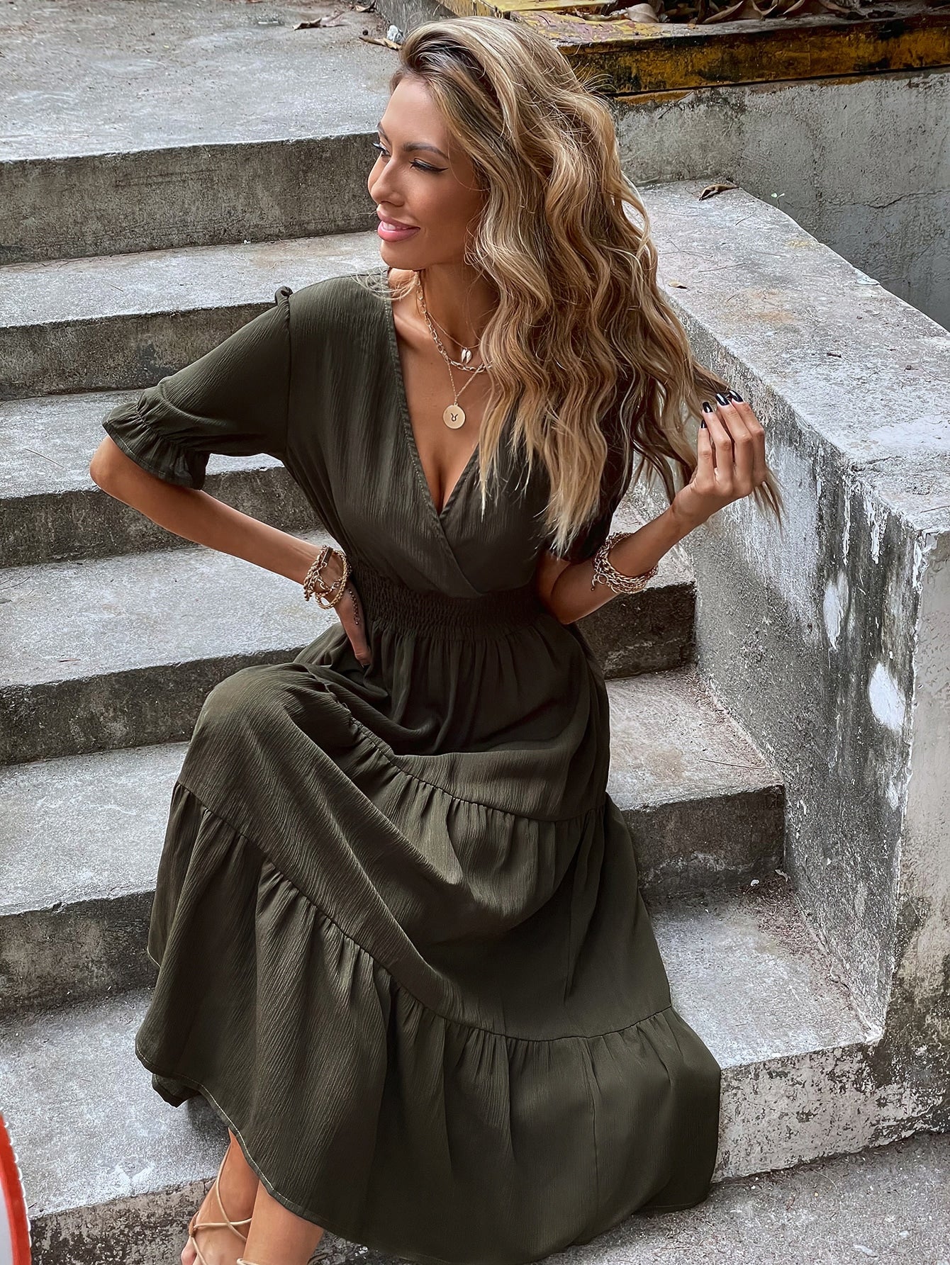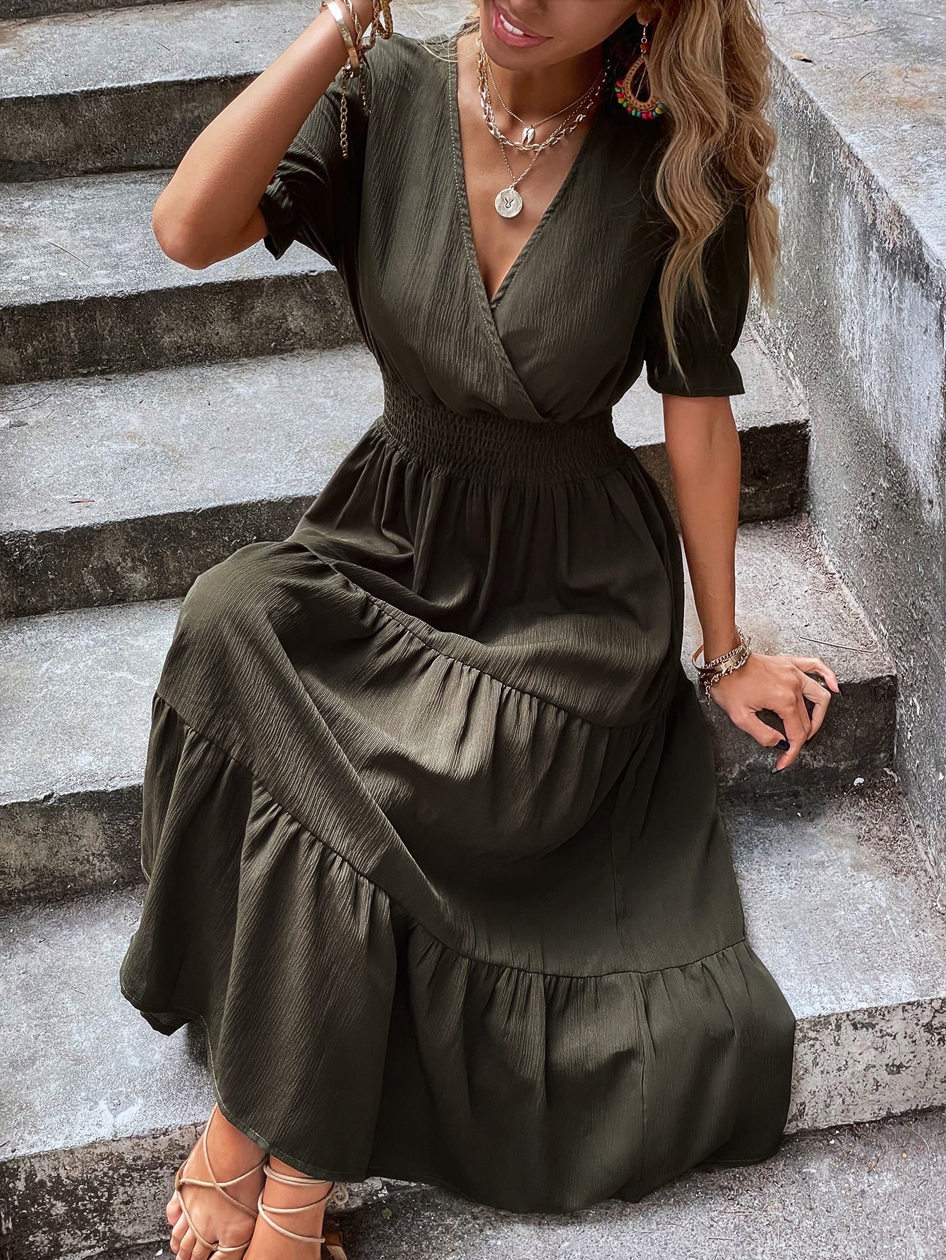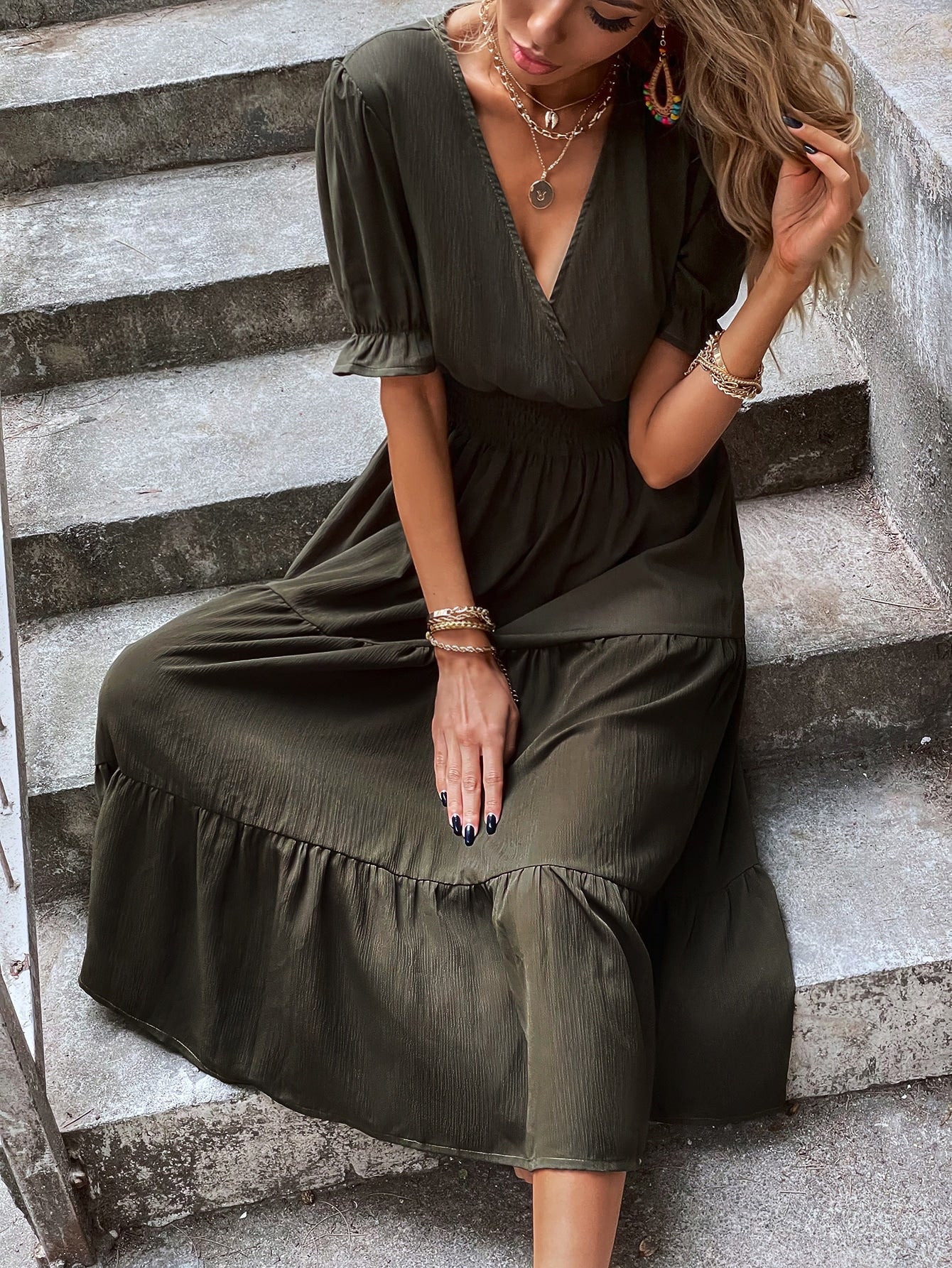 Shirred Waist Ruffle Hem Surplice Dress
