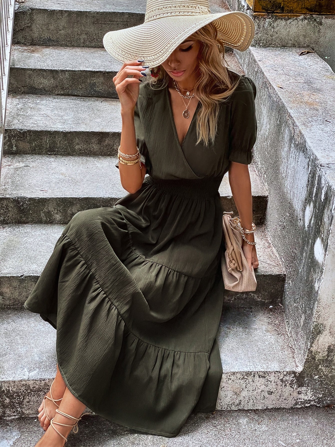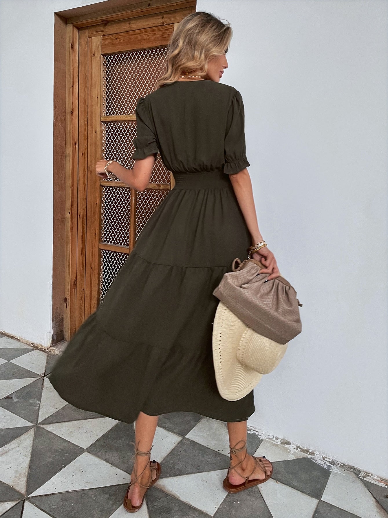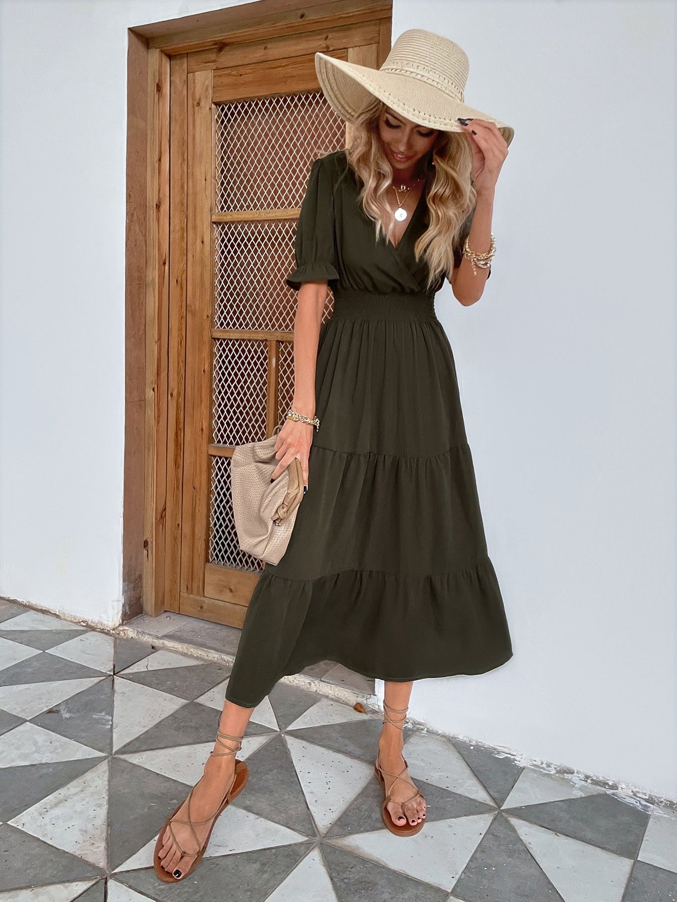 Shirred Waist Ruffle Hem Surplice Dress