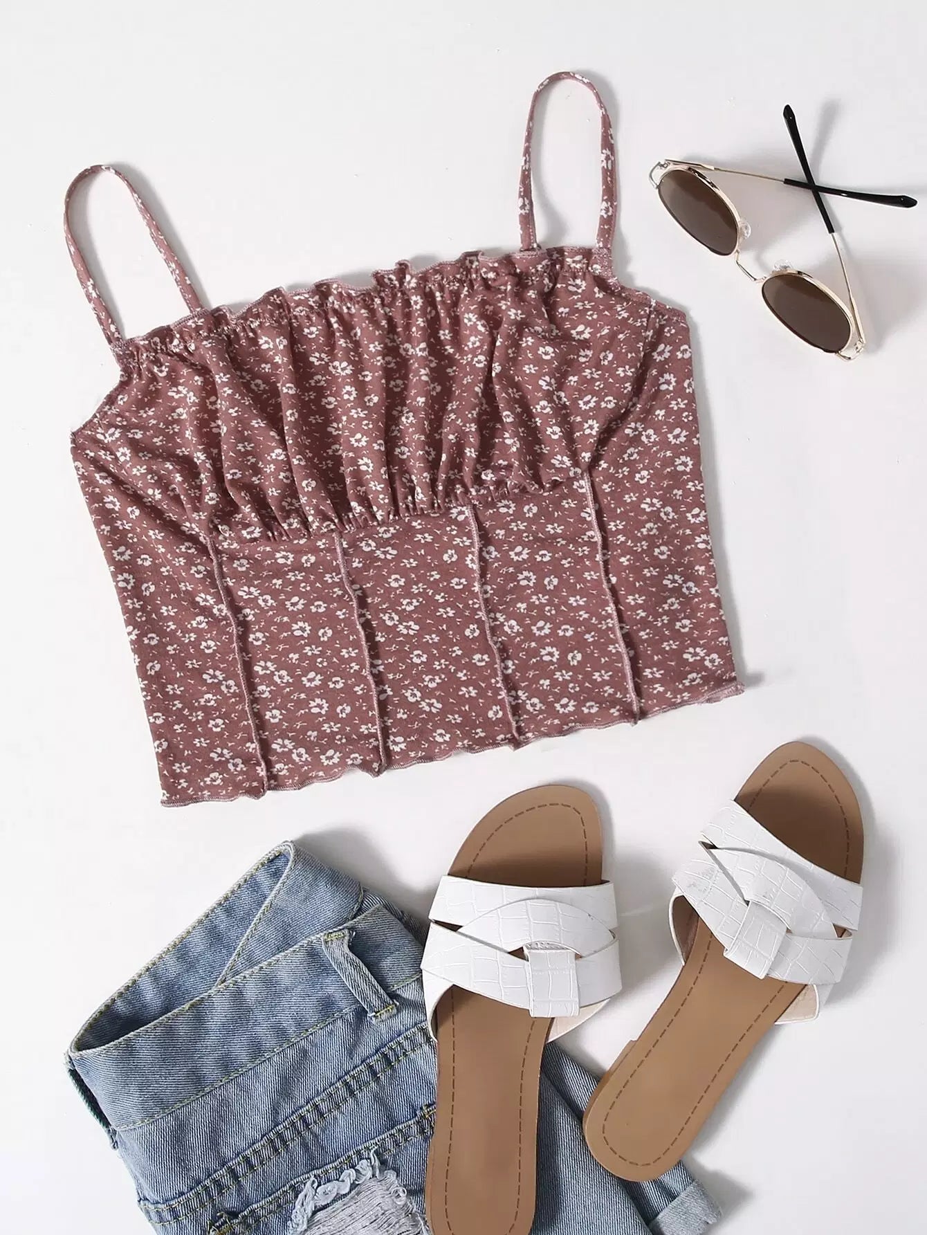 قميص قصير مكشكش مزين بنقوش الزهور على الصدر بحواف من الخس