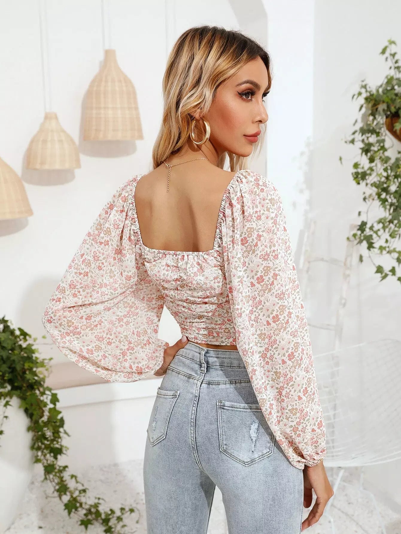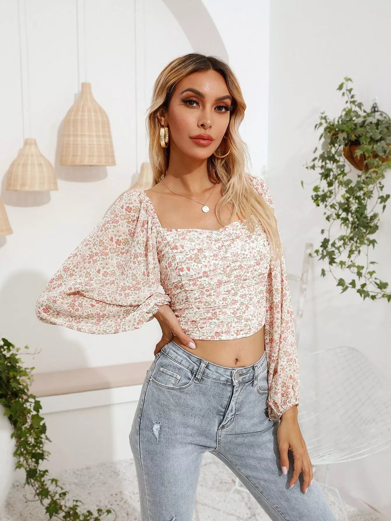 بلوزة قصيرة مكشكشة مزينة بالورود ذات أزهار ديتسي