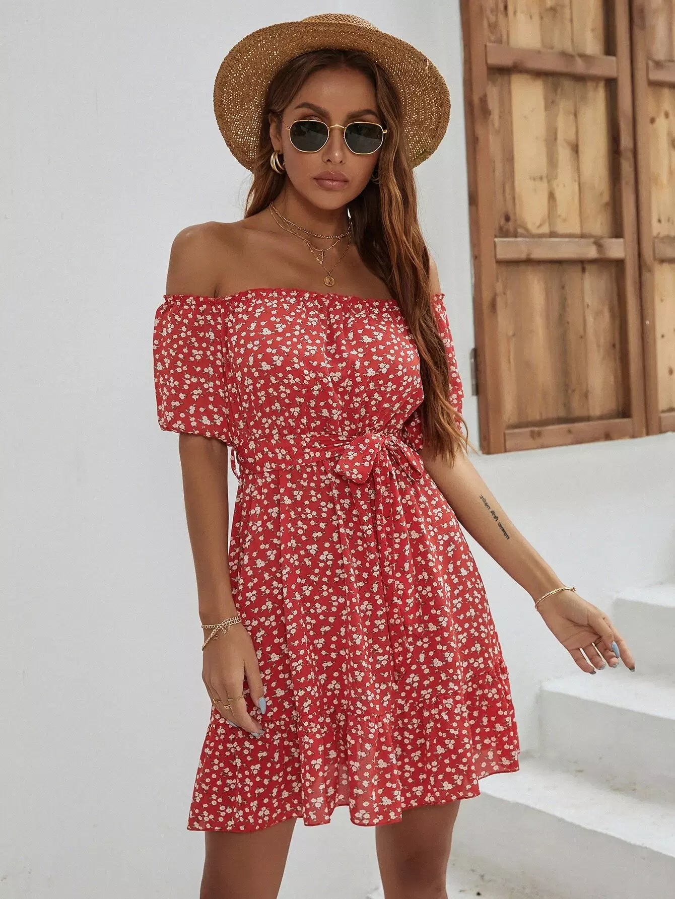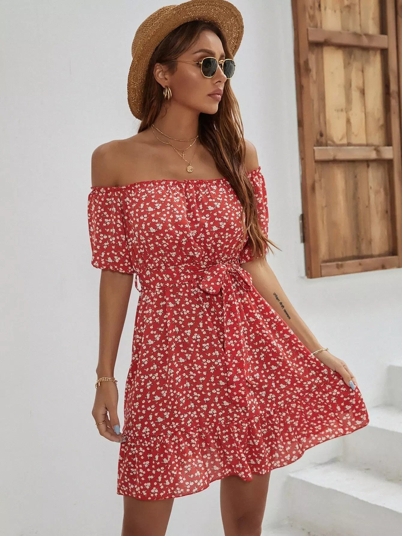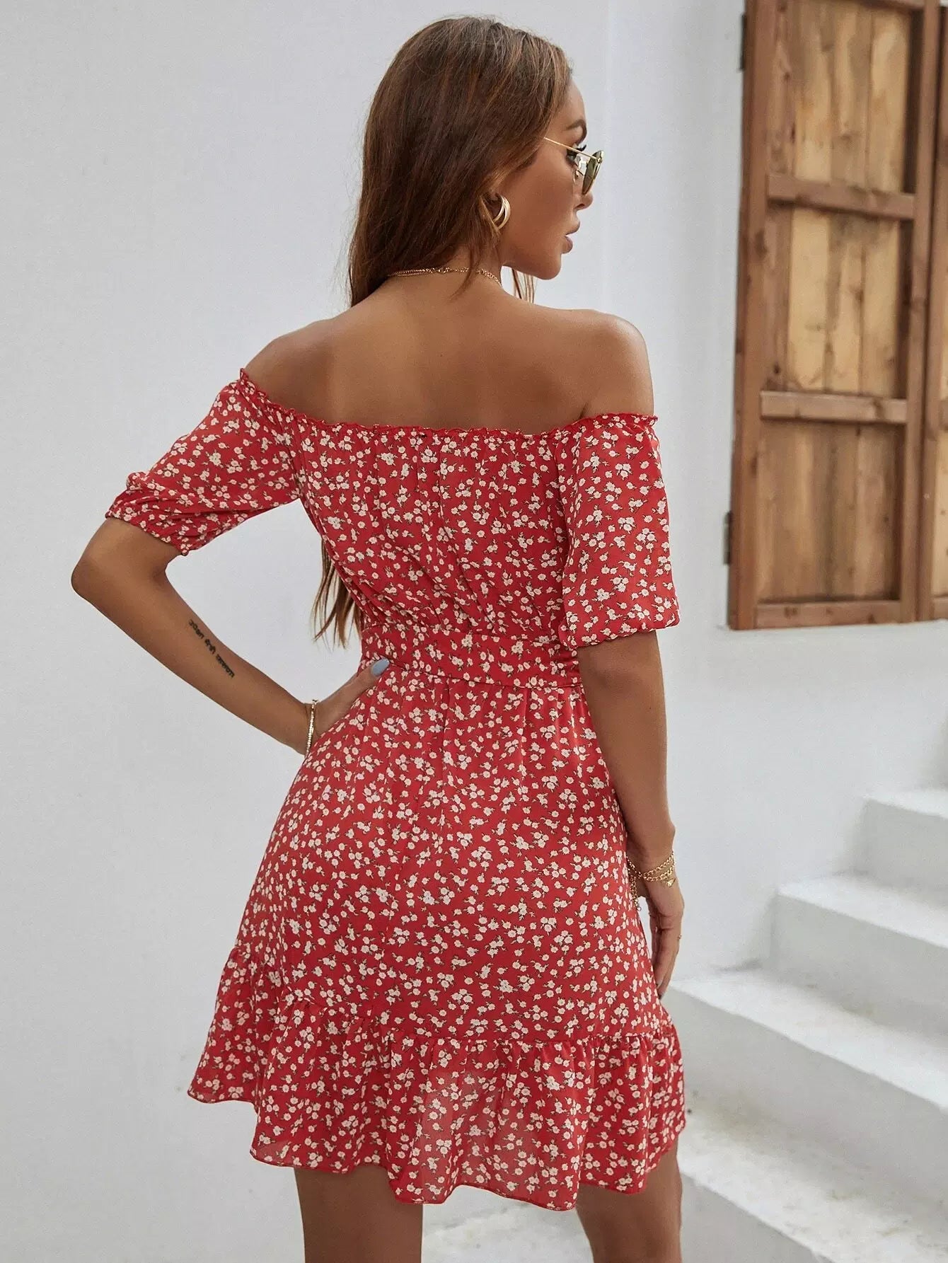 فستان على شكل حرف A بحاشية مكشكشة مزهّرة من Ditsy بدون حزام