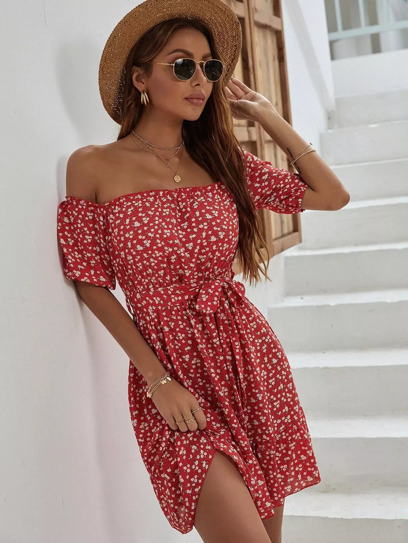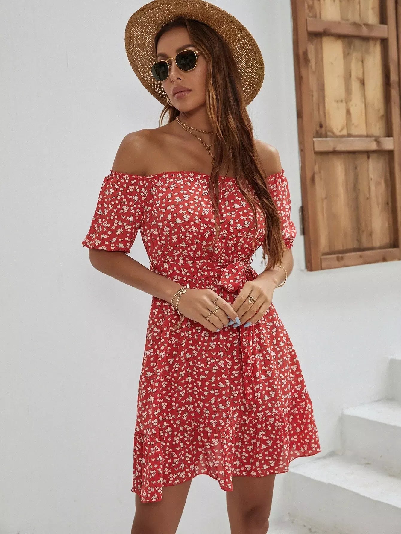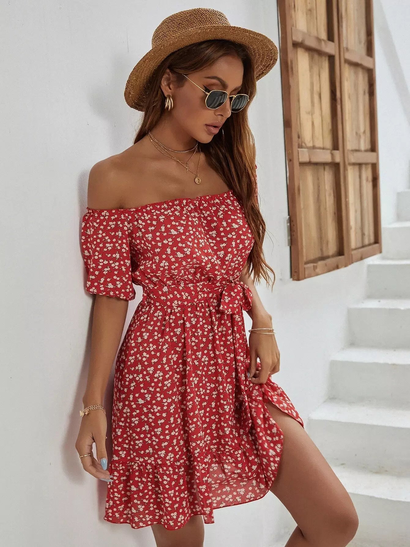 فستان على شكل حرف A بحاشية مكشكشة مزهّرة من Ditsy بدون حزام