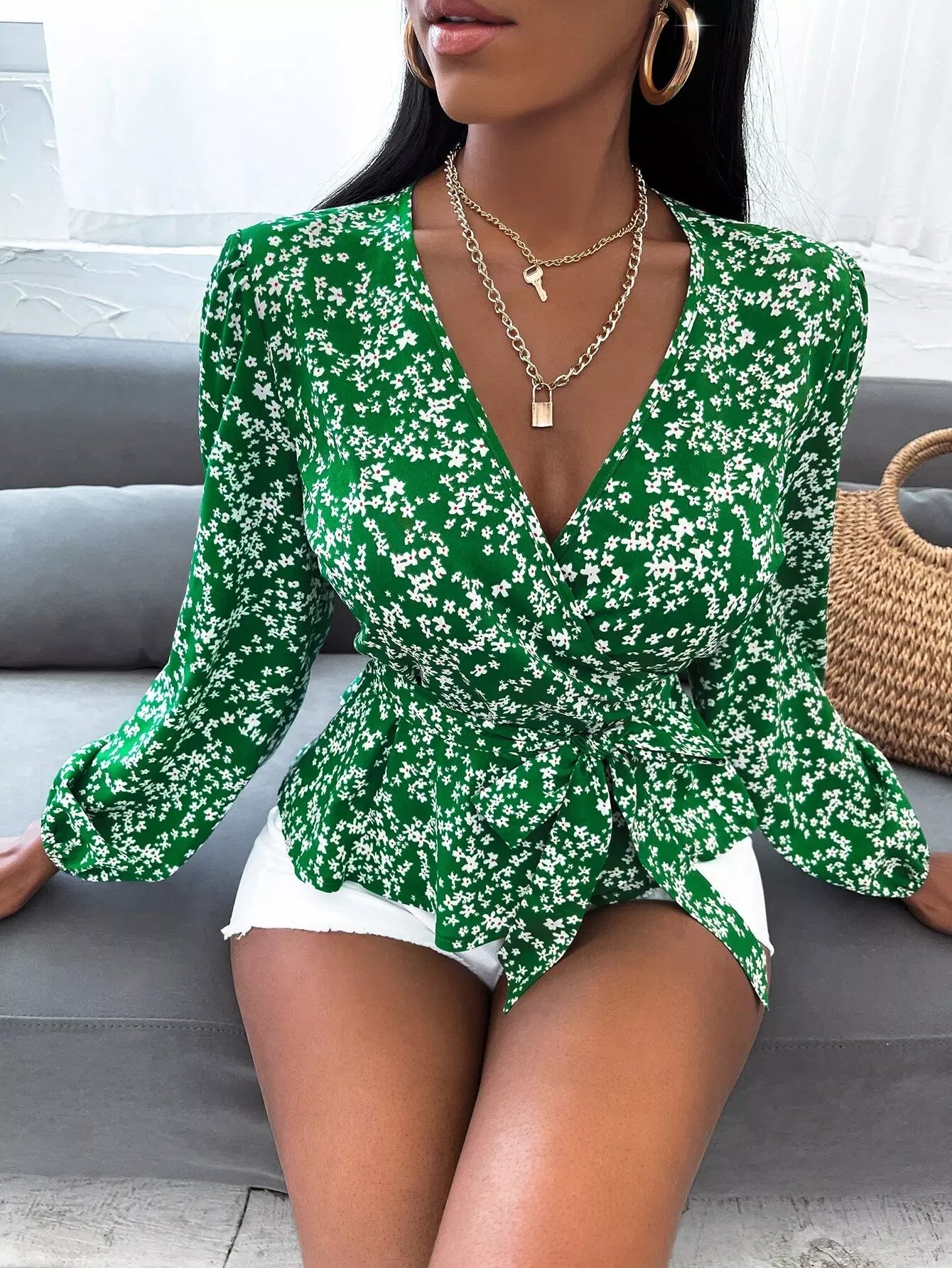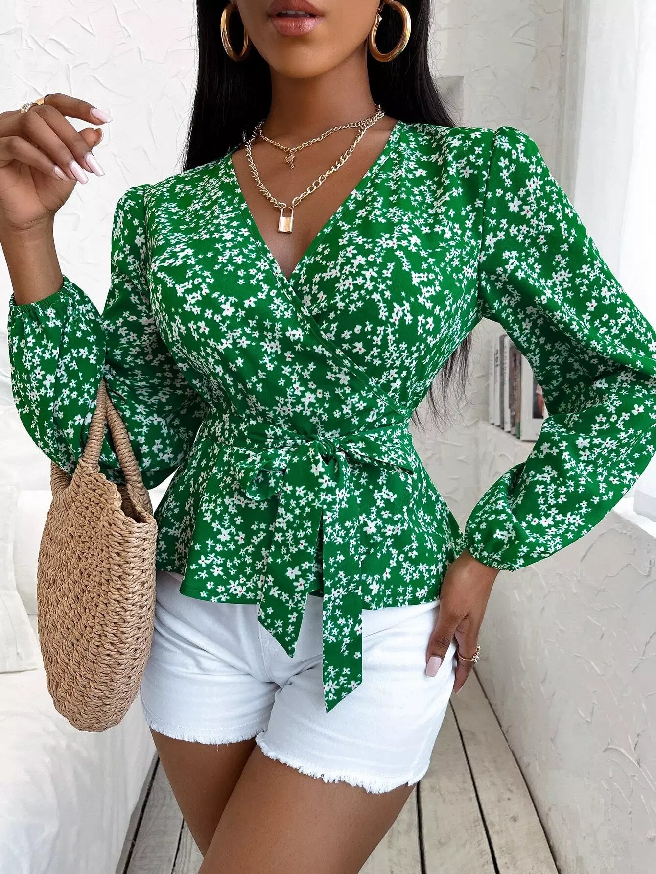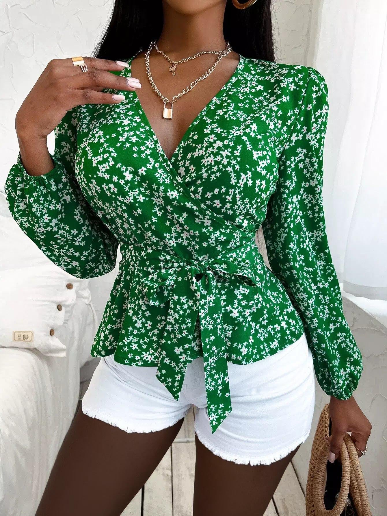 بلوزة ديتسي ذات أكمام منتفخة ورقبة على شكل زهور بدون حزام