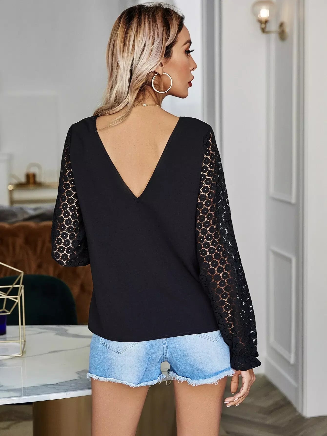 بلوزة دانتيل بياقة مزدوجة على شكل V بياقة على شكل V وأزرار فوق الرقبة على شكل V