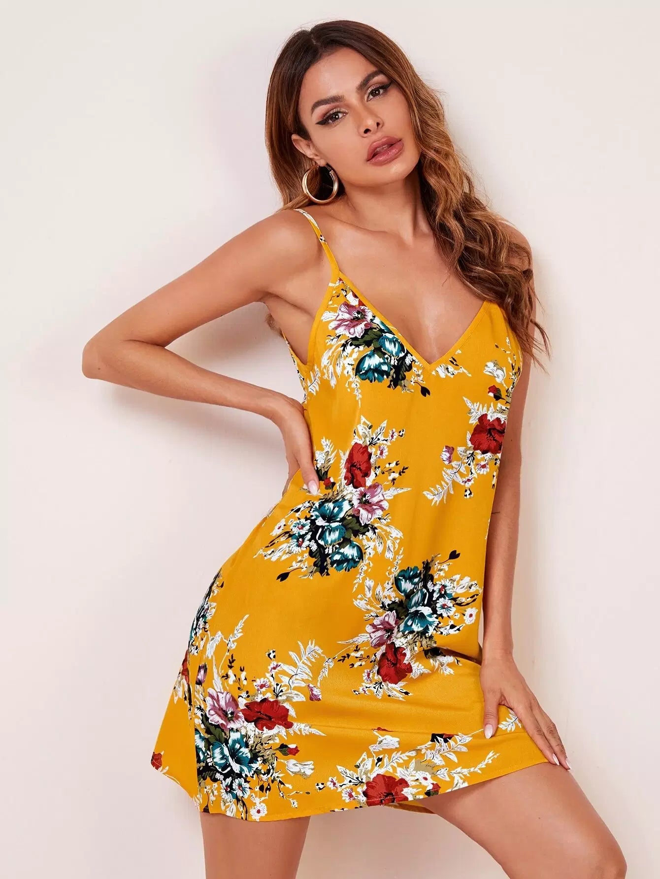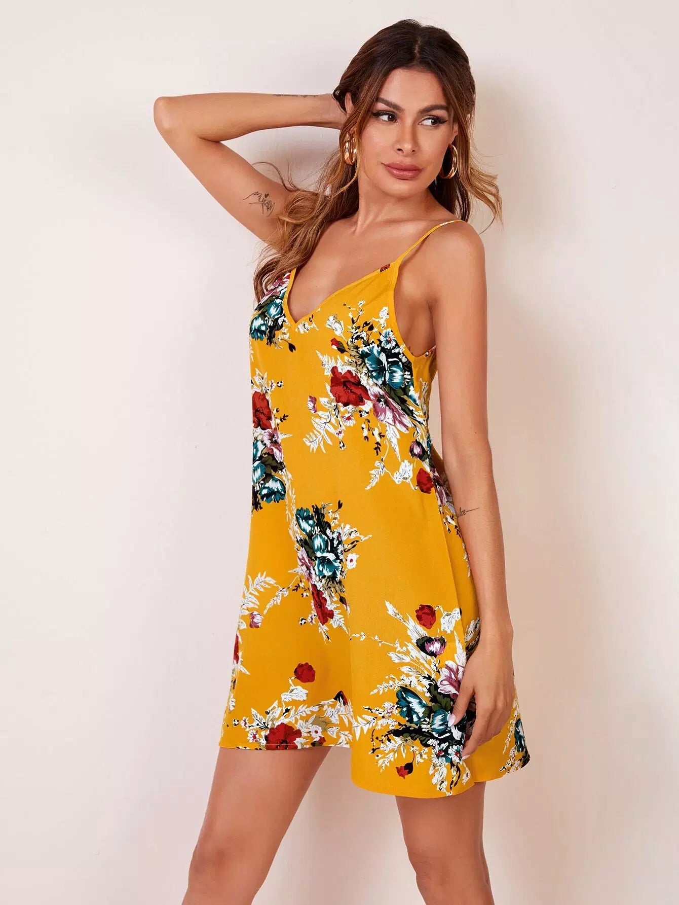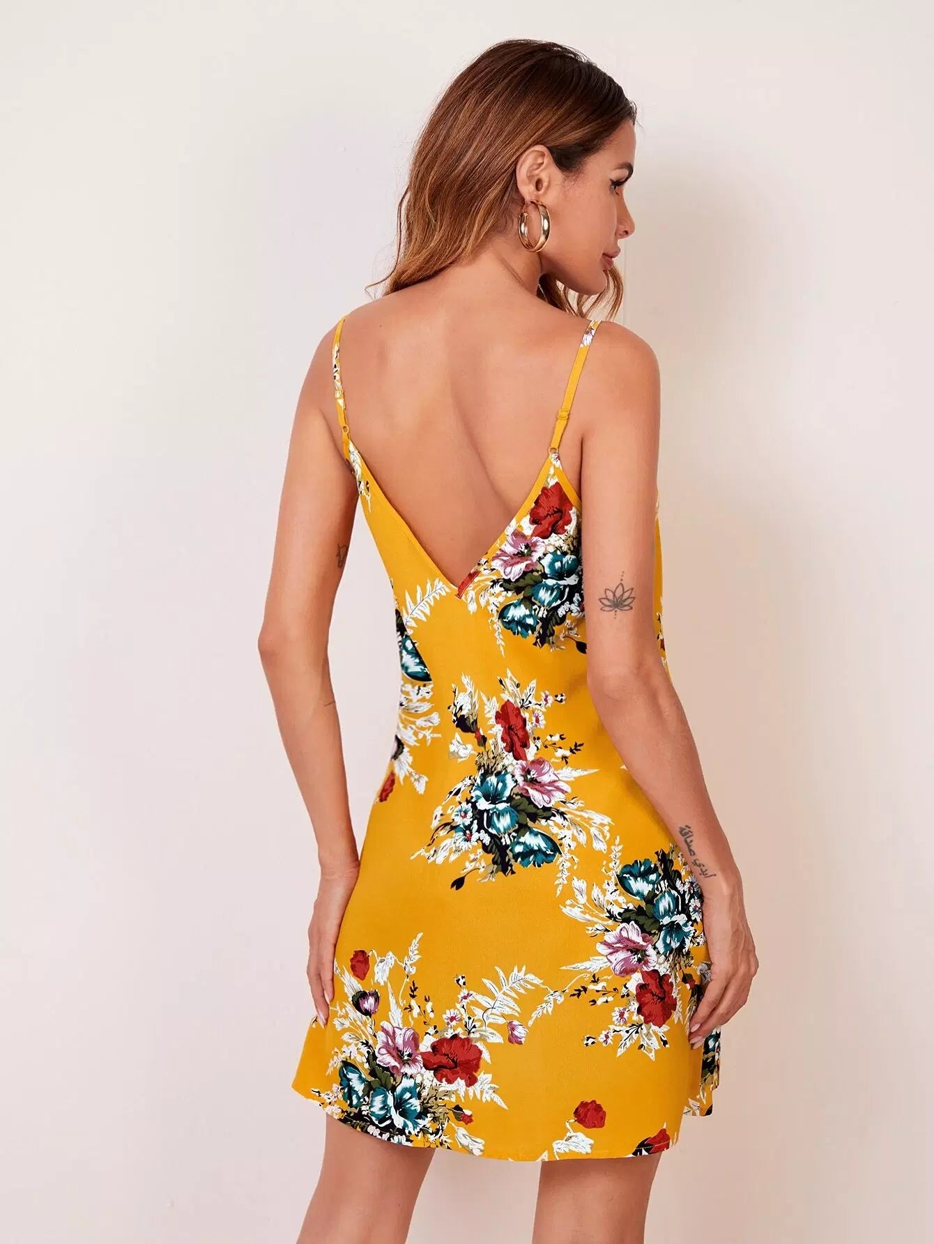 فستان كامي برقبة مزدوجة على شكل حرف V مطبوع بالزهور