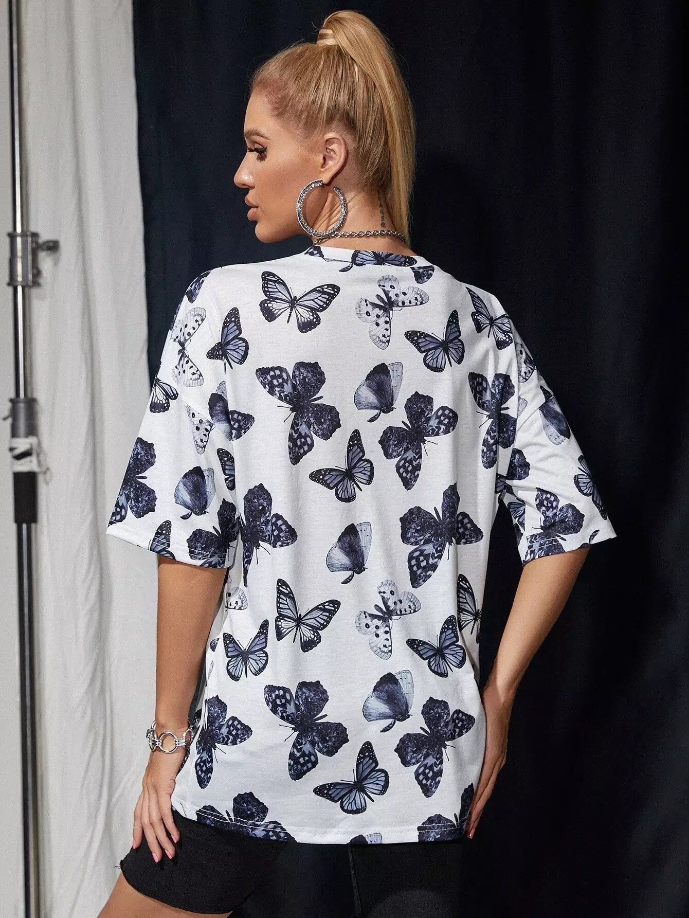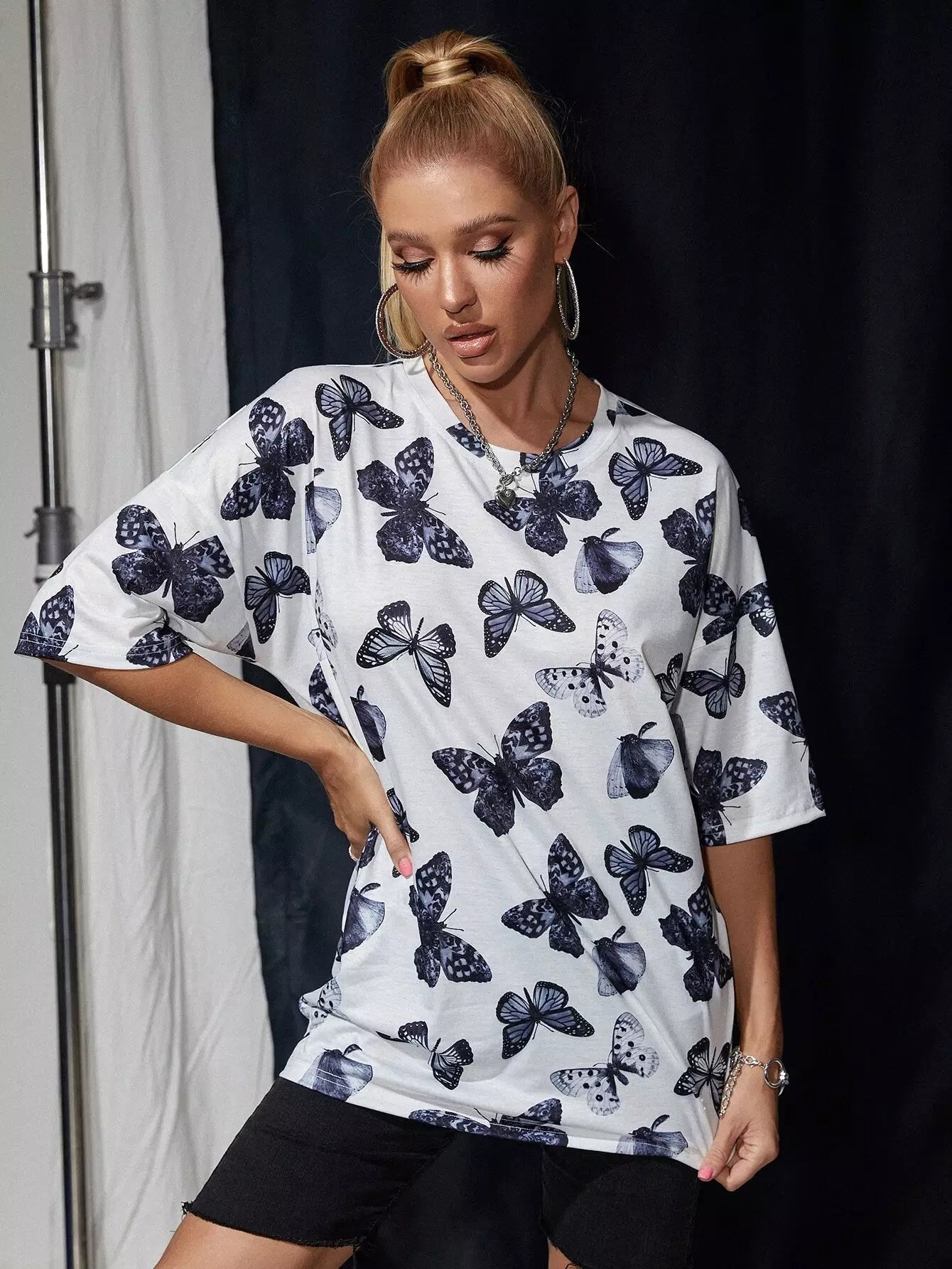 تي شيرت طويل بطبعة فراشات وأكتاف منسدلة