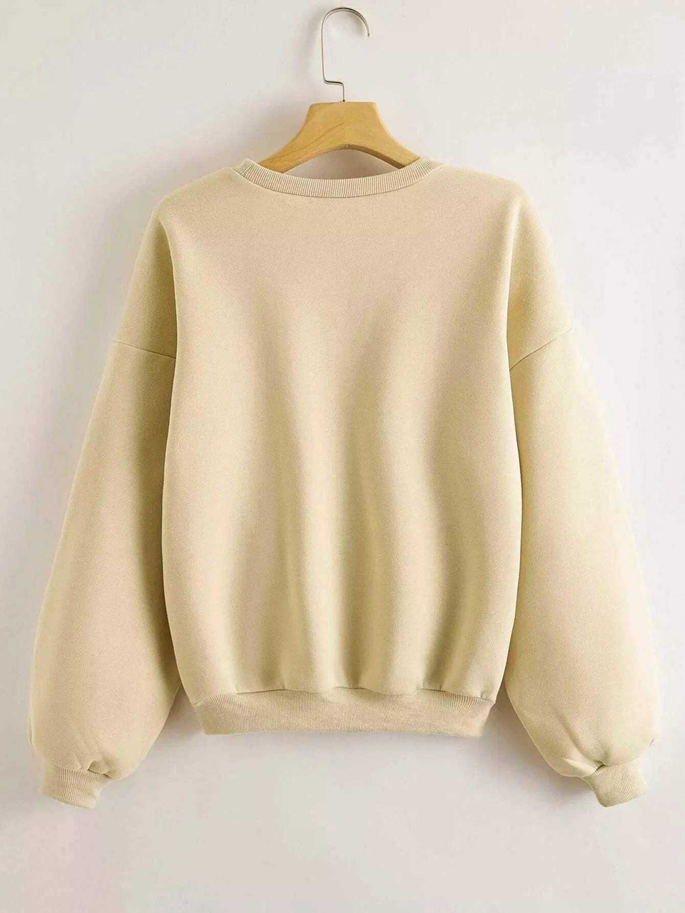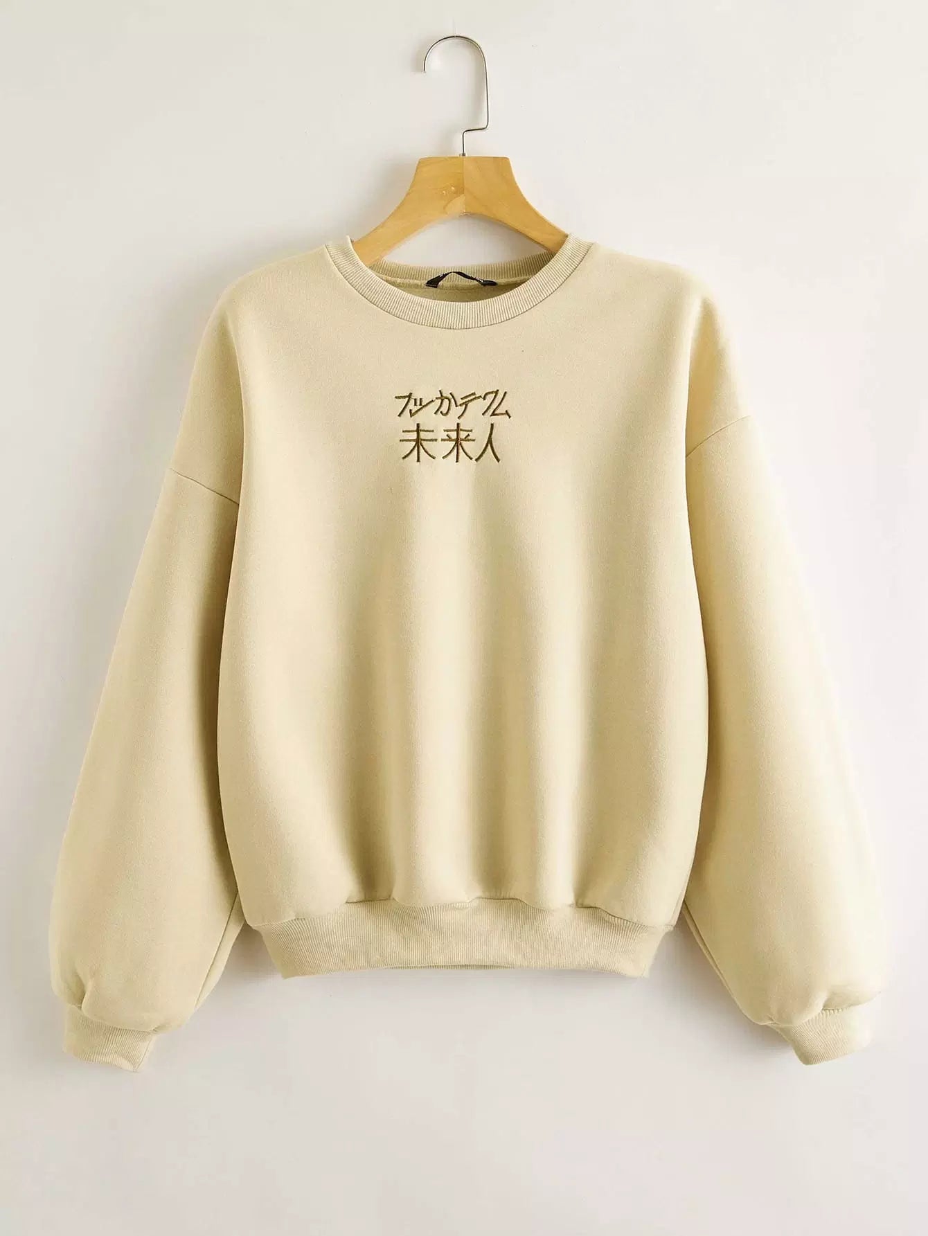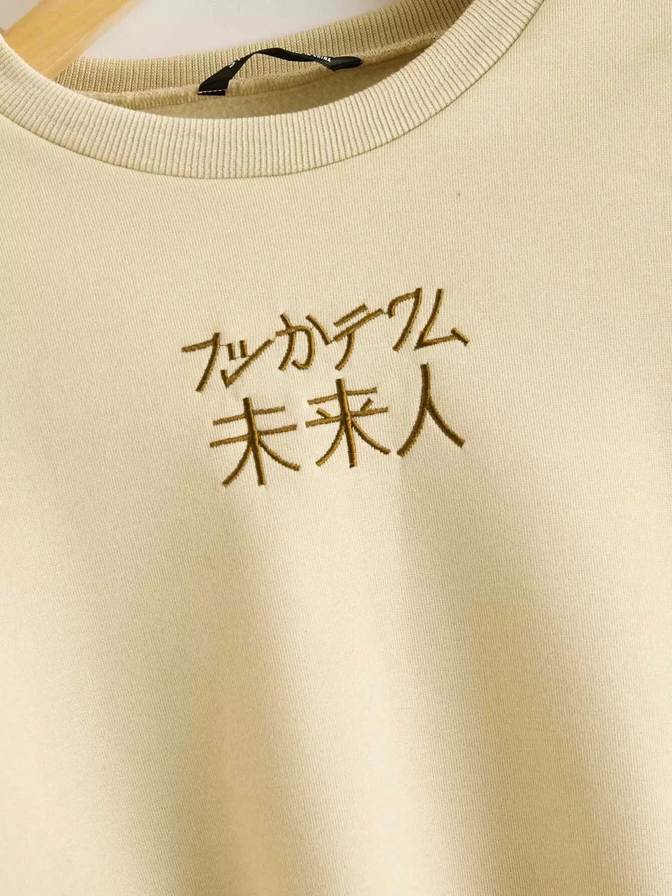 للنساء - بلوفر مطرز بحروف صينية ويابانية بأكتاف منسدلة