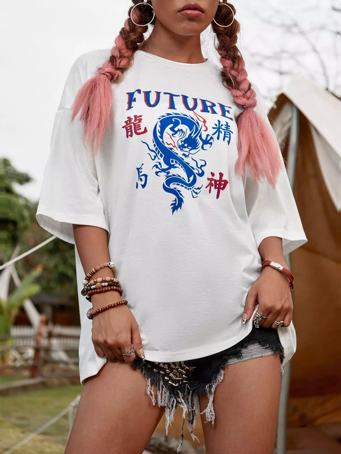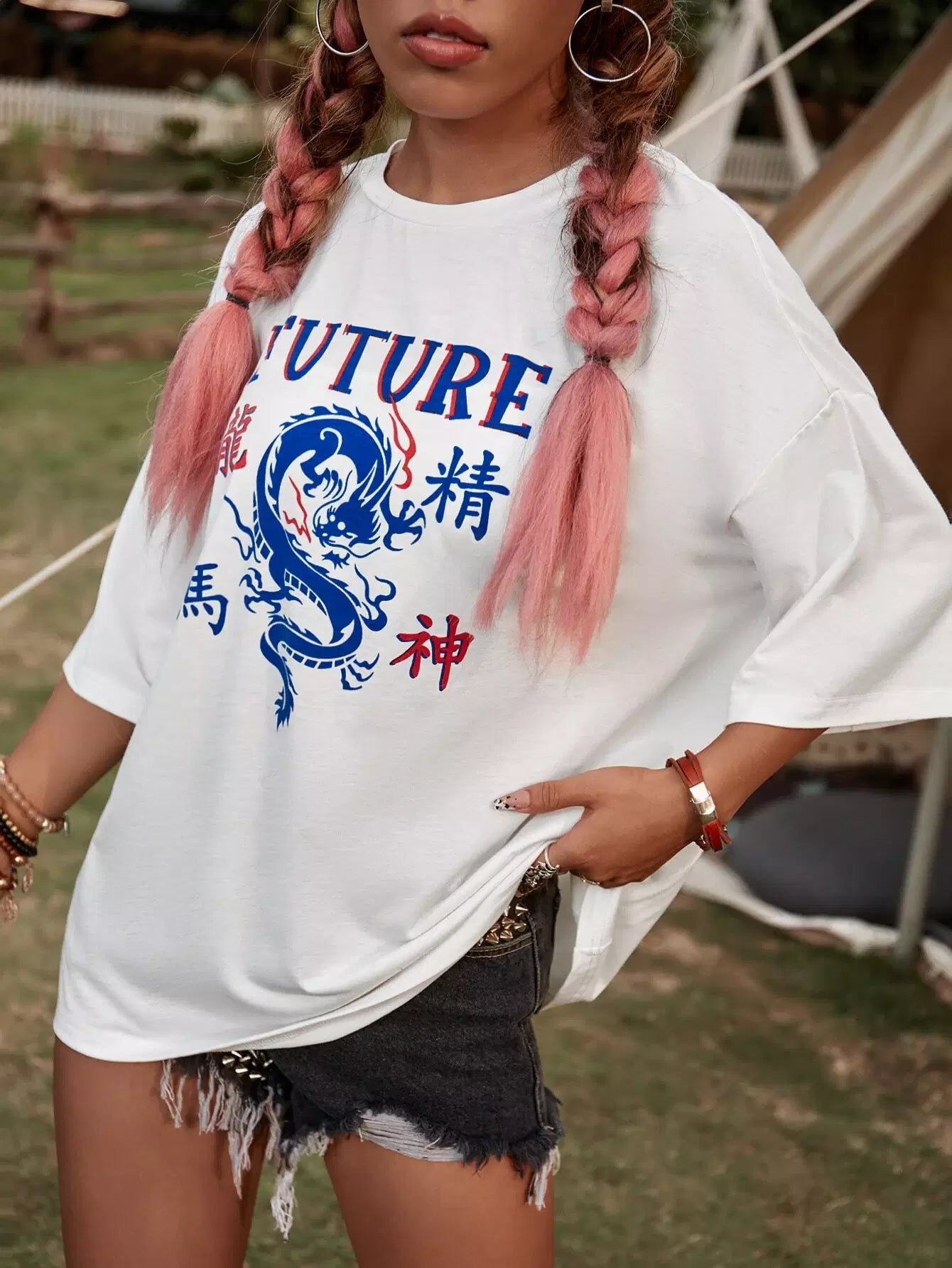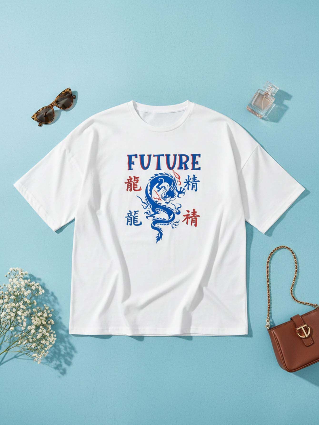 تي شيرت بحرف صيني منسدل على الكتفين ورسومات تنين صيني