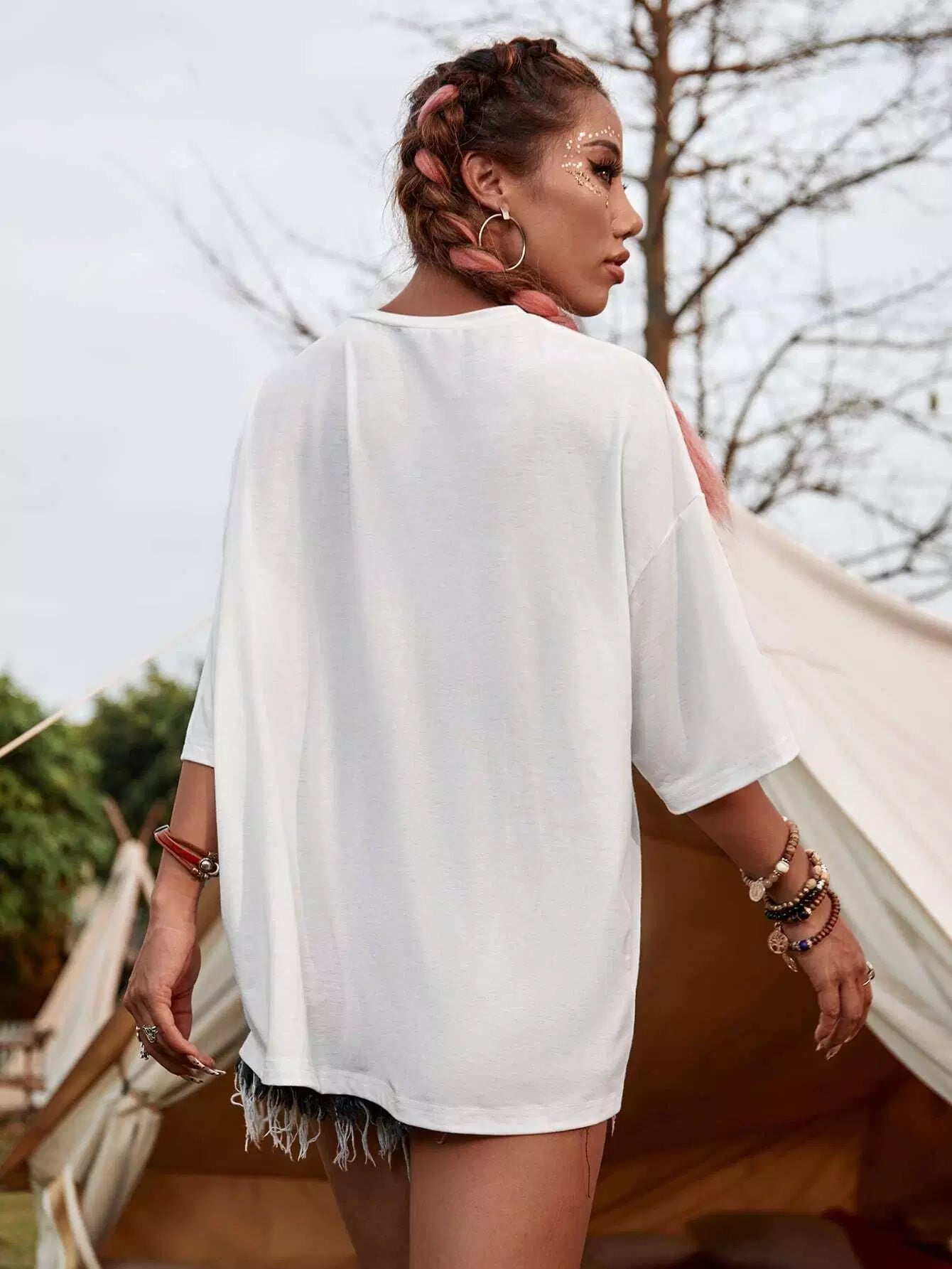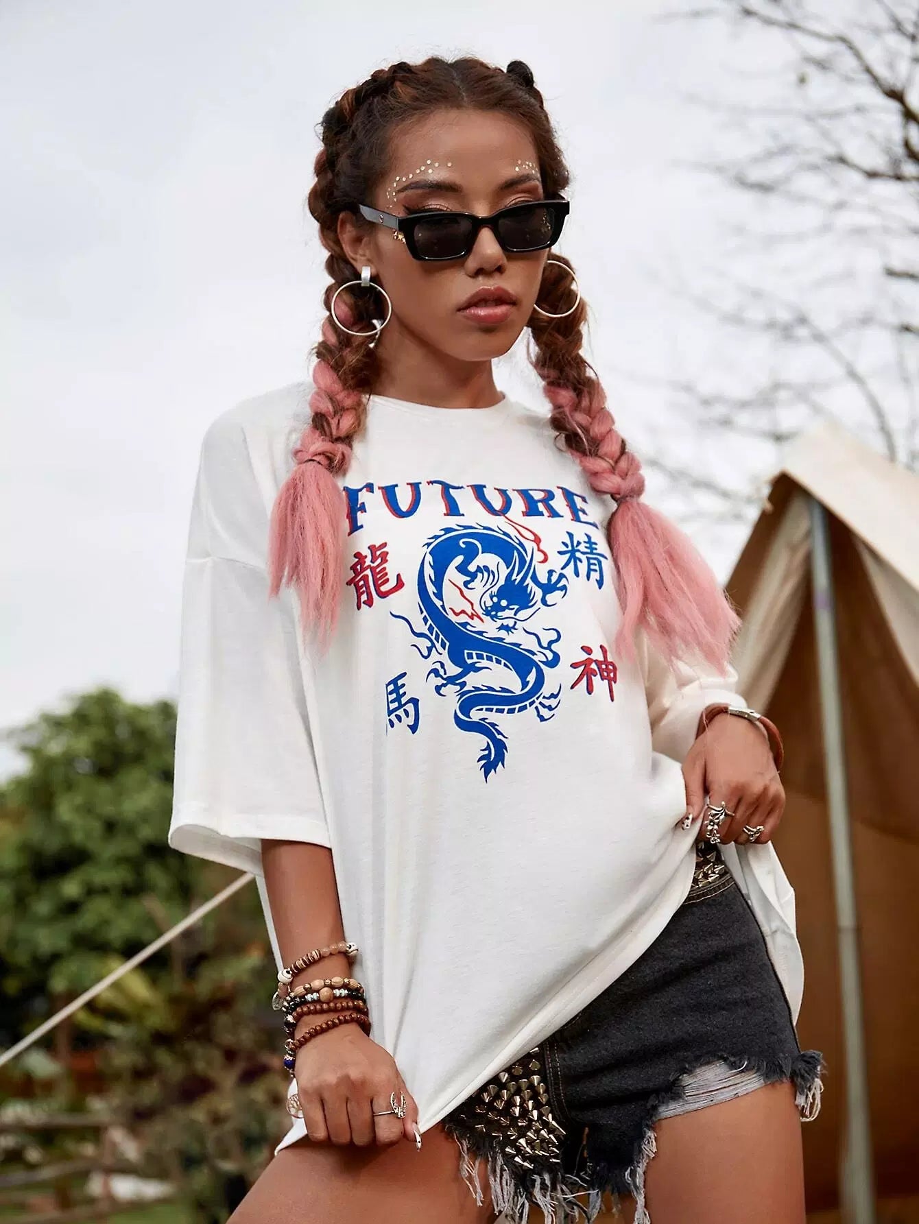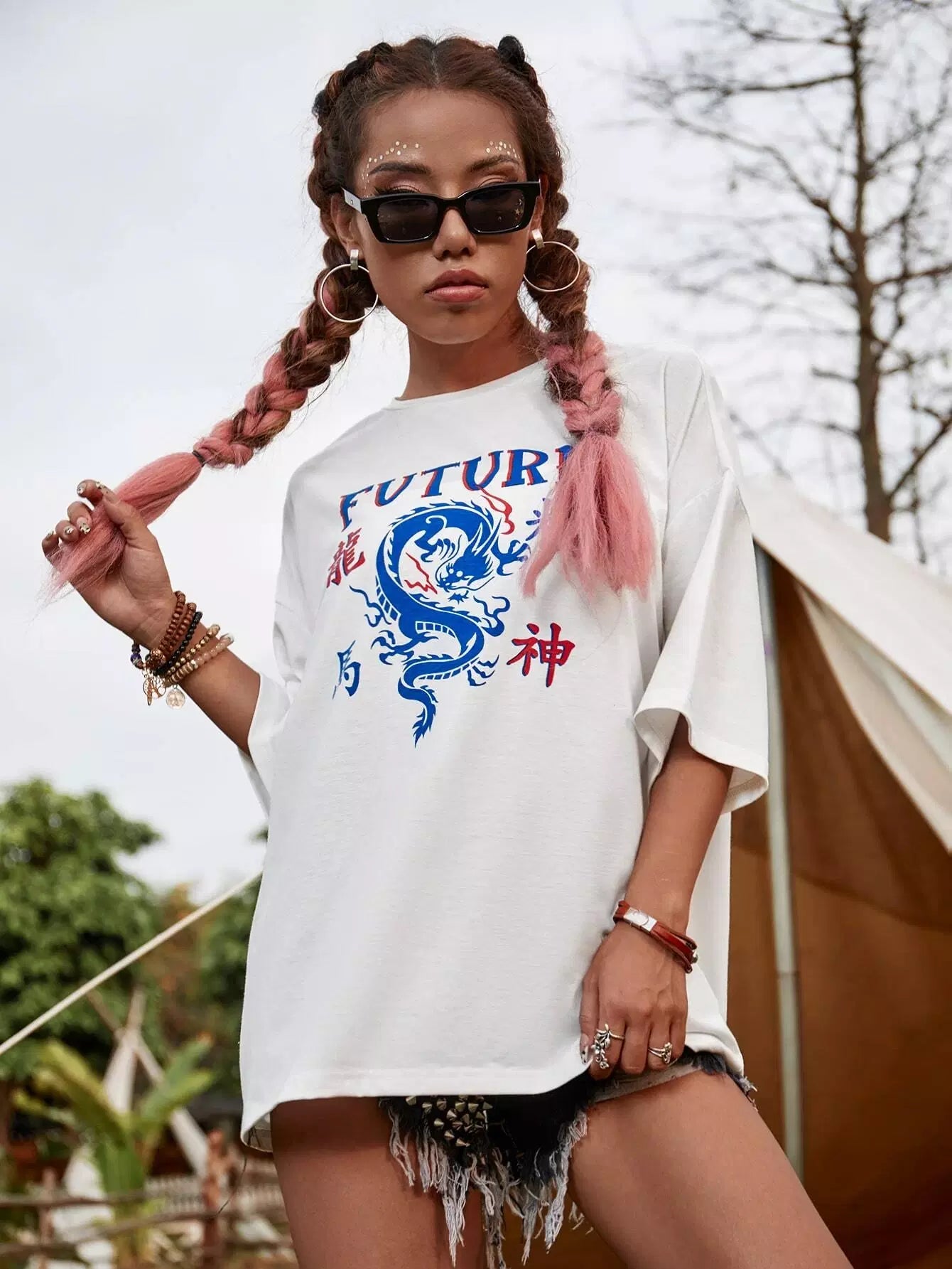 تي شيرت بحرف صيني منسدل على الكتفين ورسومات تنين صيني
