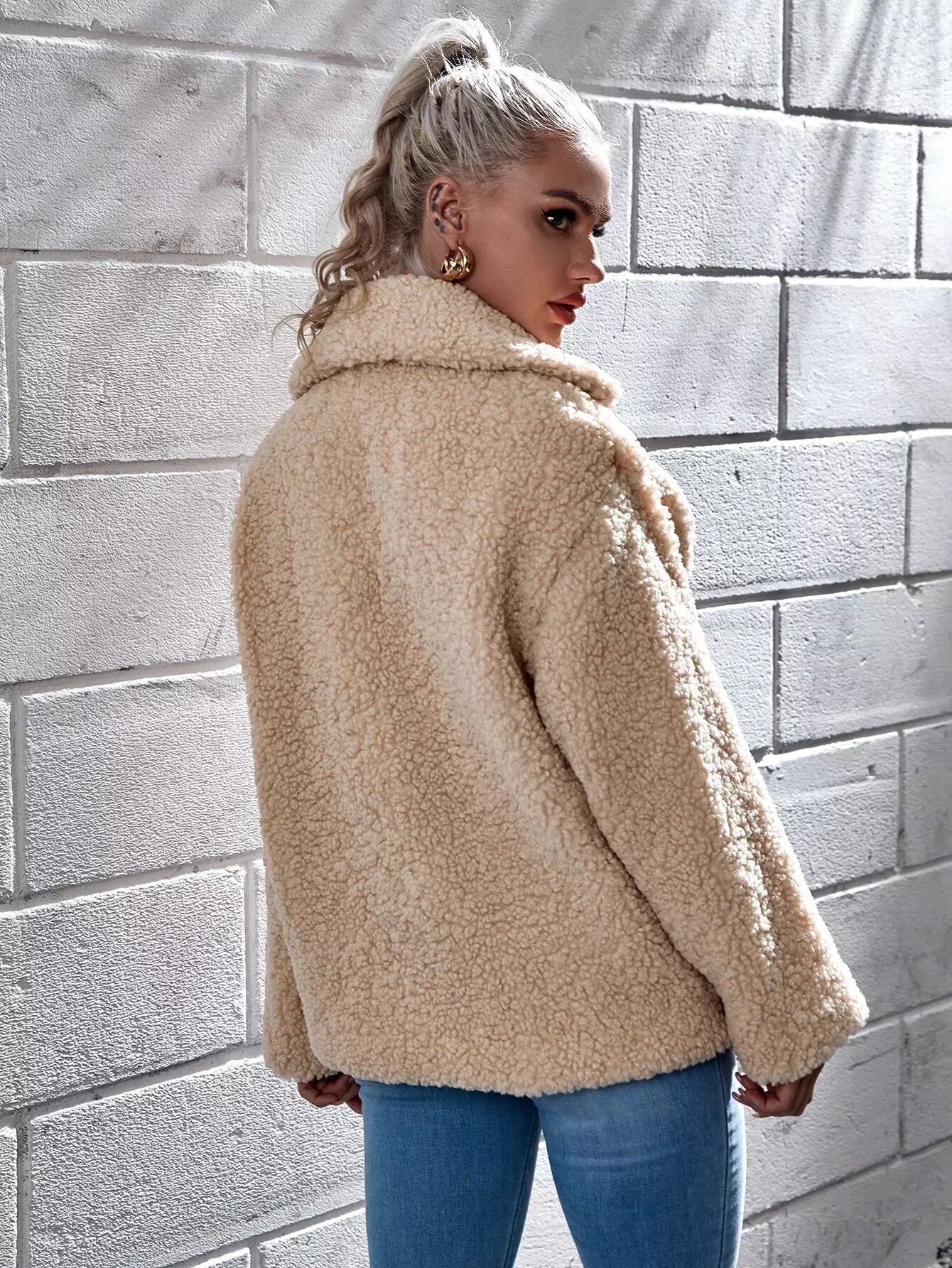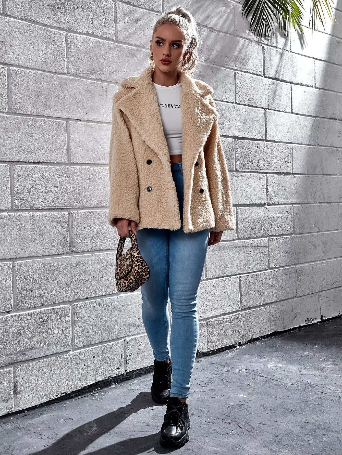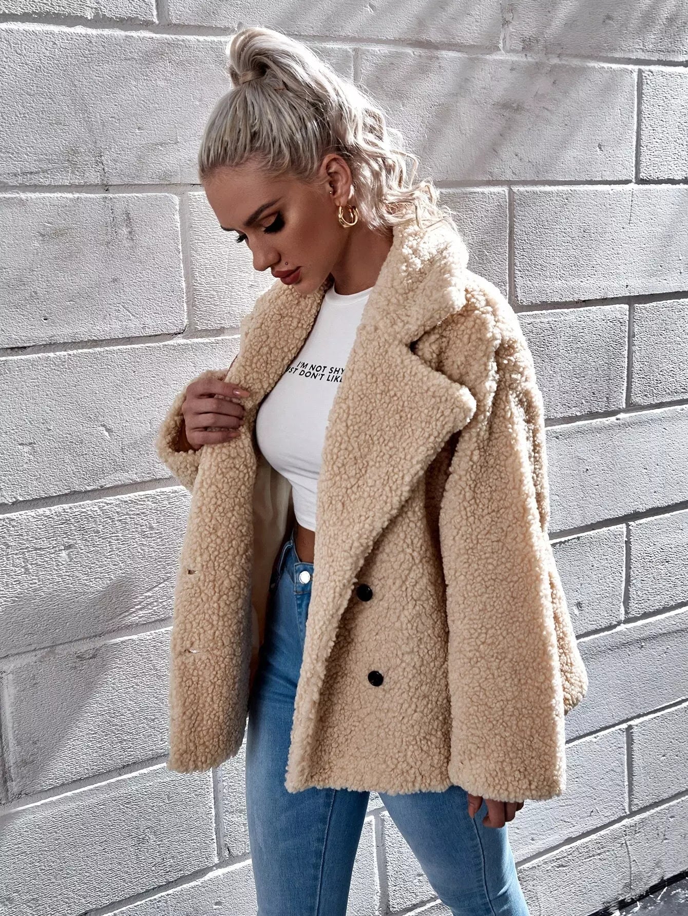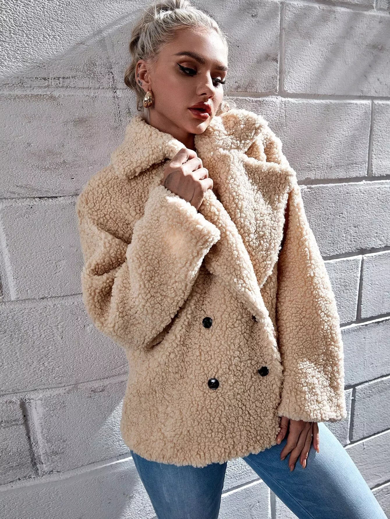 معطف تيدي مزدوج الصدر مع أكتاف منسدلة