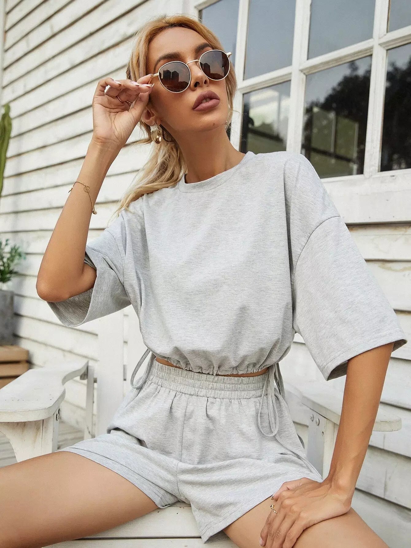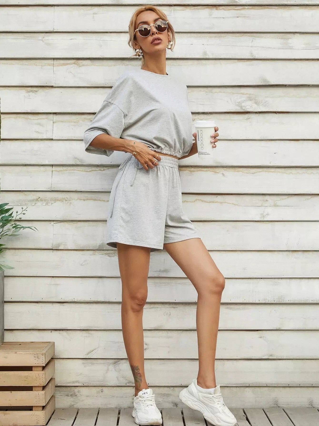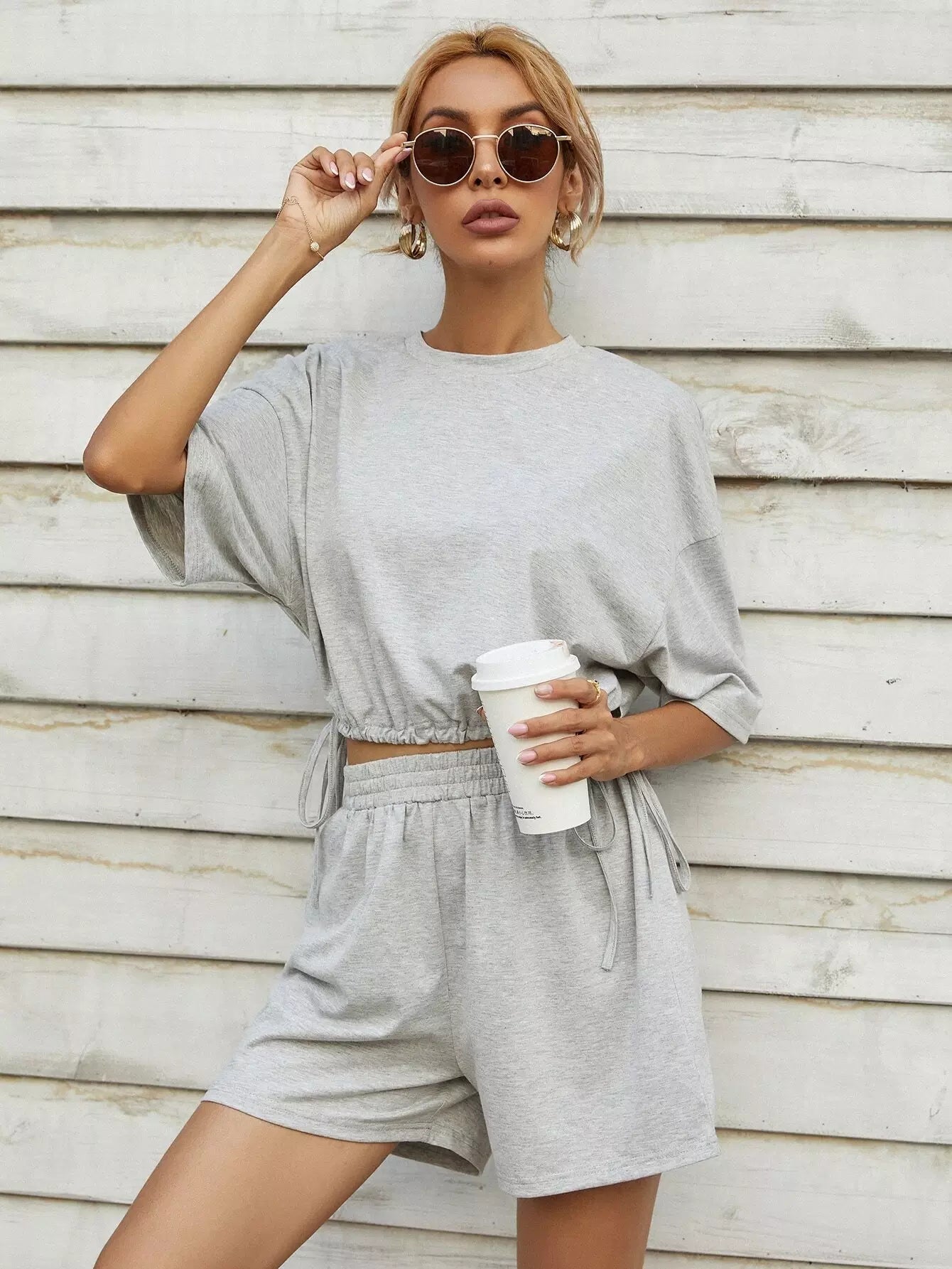 تي شيرت بحاشية رباط منسدل على الكتف مع شورت رياضي قصير