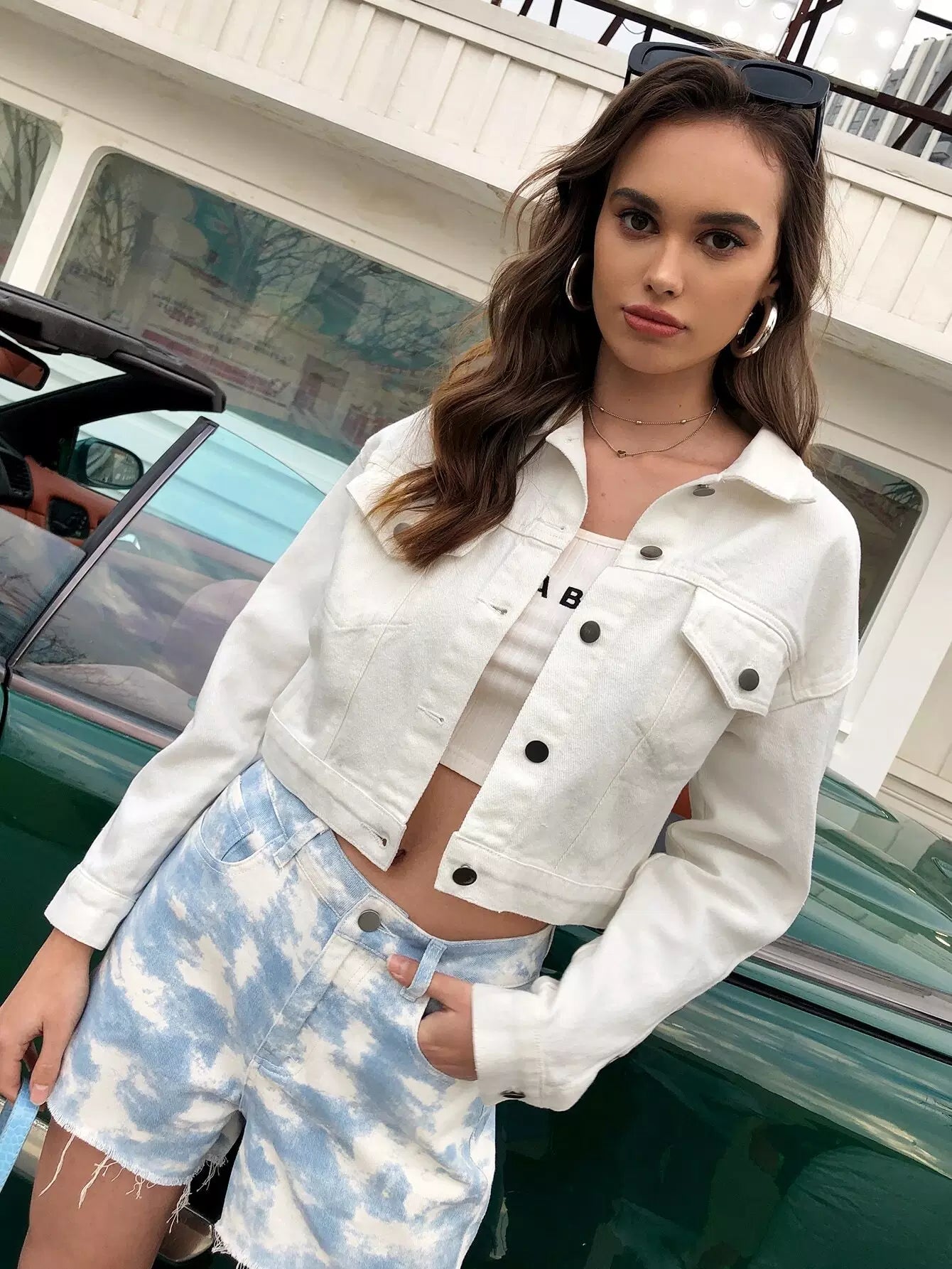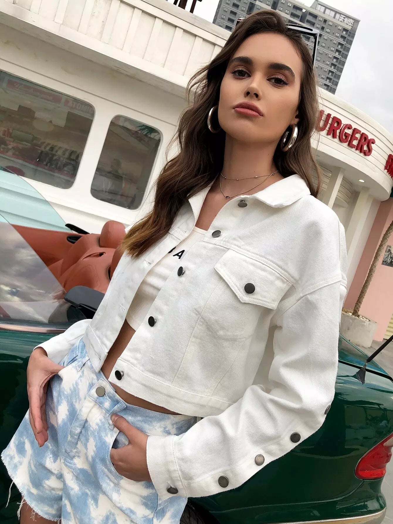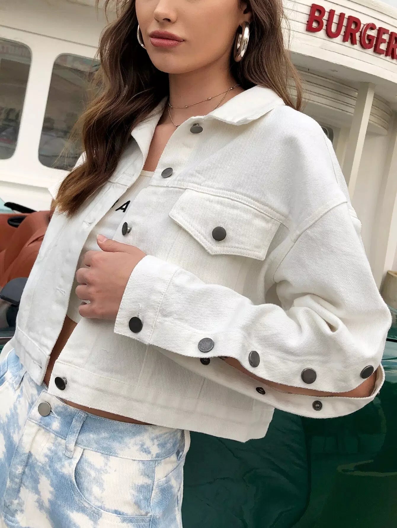 سترة جينز قصيرة بكتف منسدلة وجيب