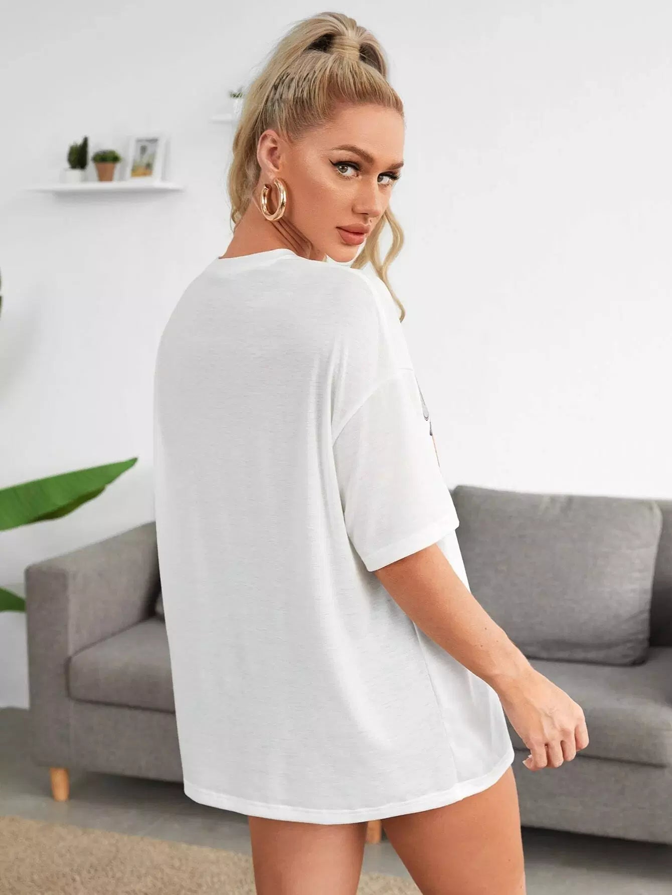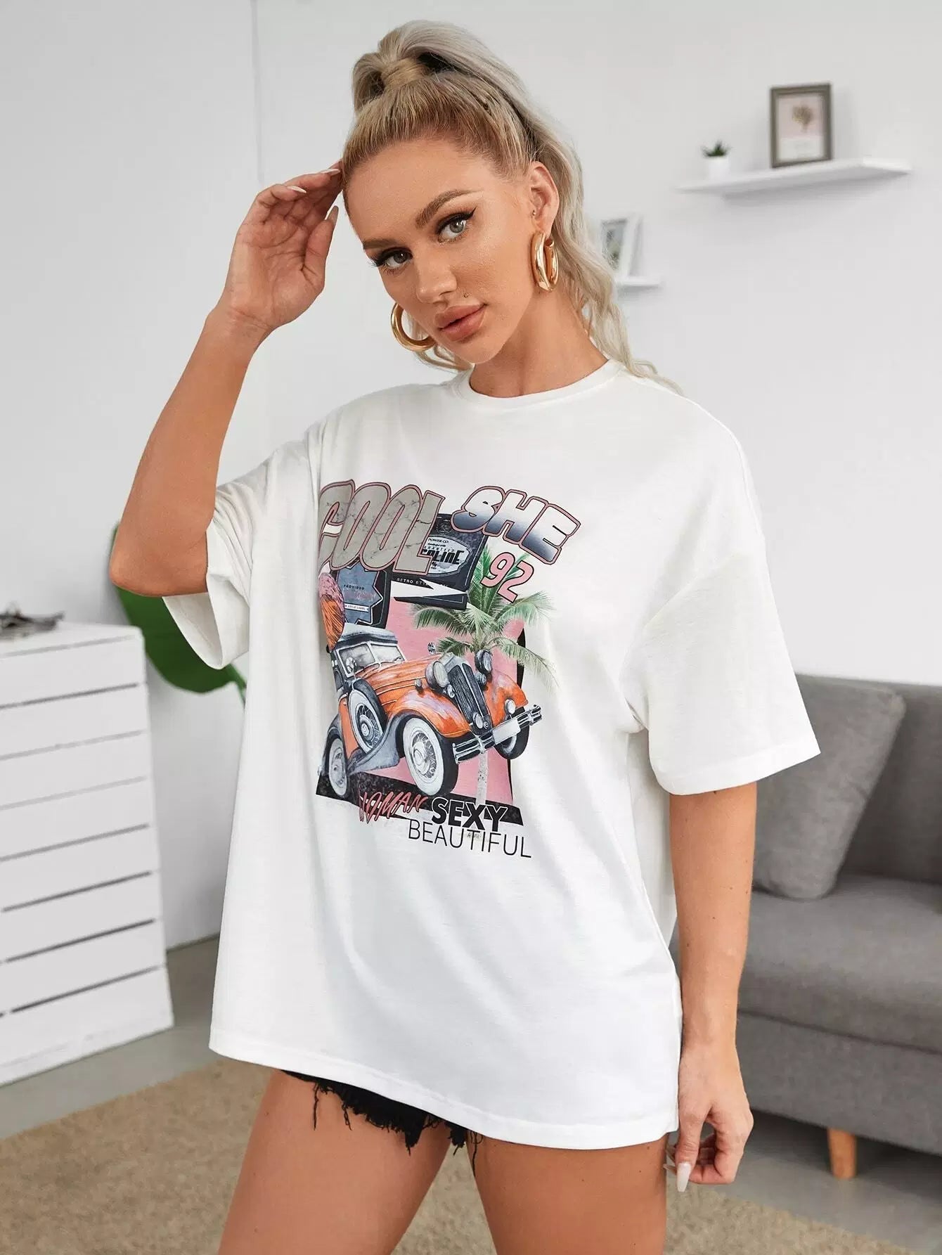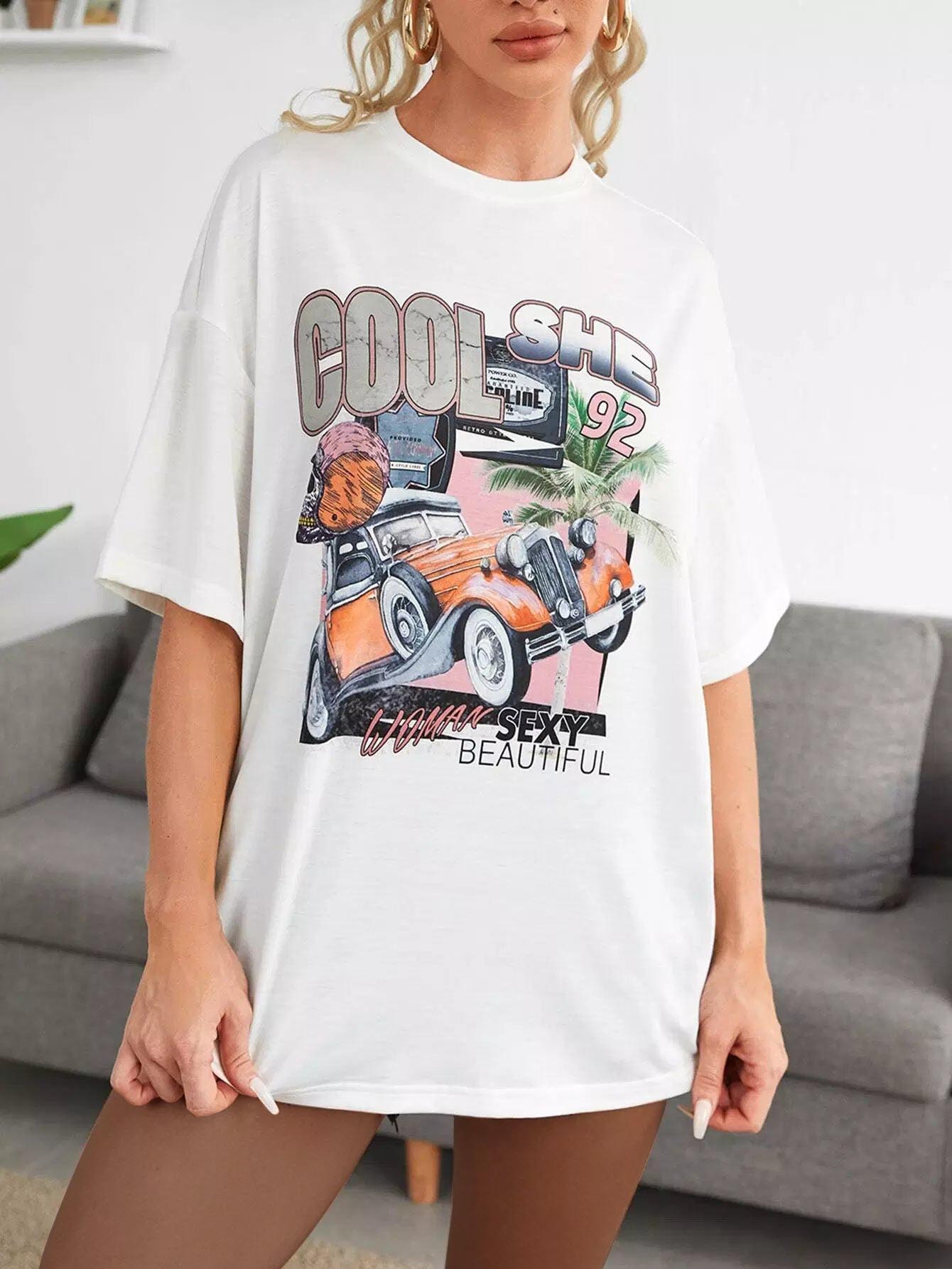 تي شيرت منسدل الكتفين مطبوع عليه حروف وسيارة كبيرة الحجم