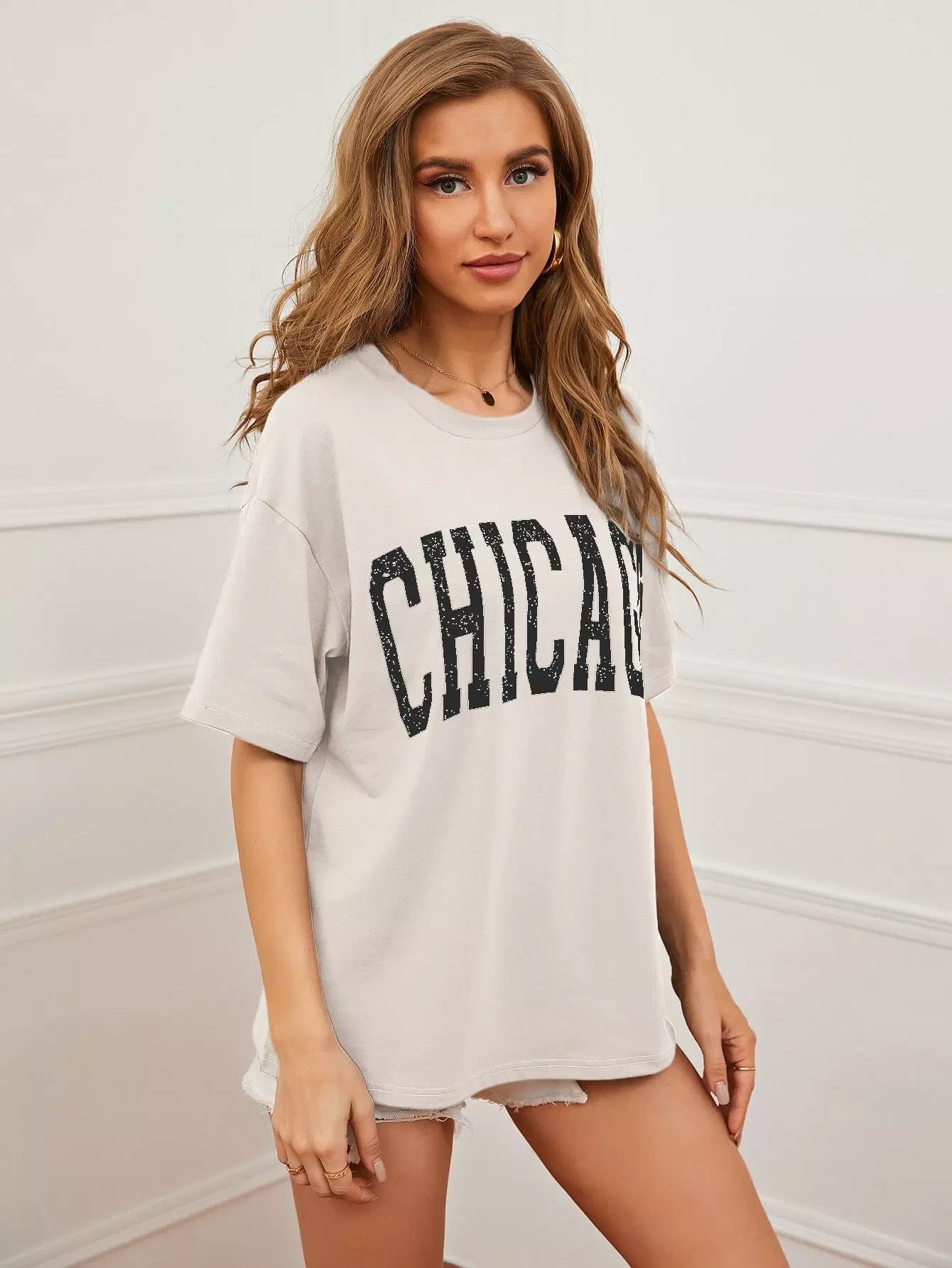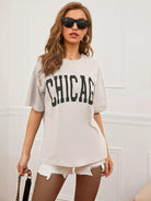 تي شيرت بتصميم منسدل الكتفين برسومات على شكل حرف