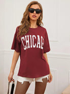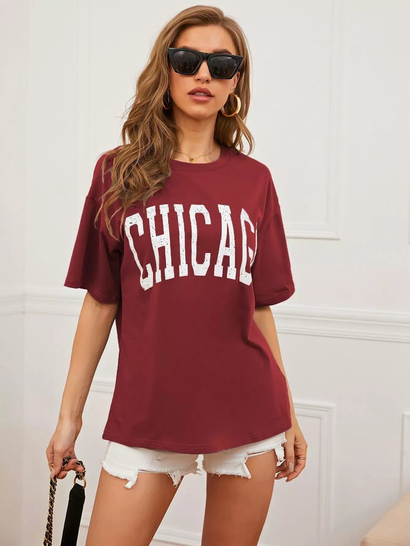 تي شيرت بتصميم منسدل الكتفين برسومات على شكل حرف