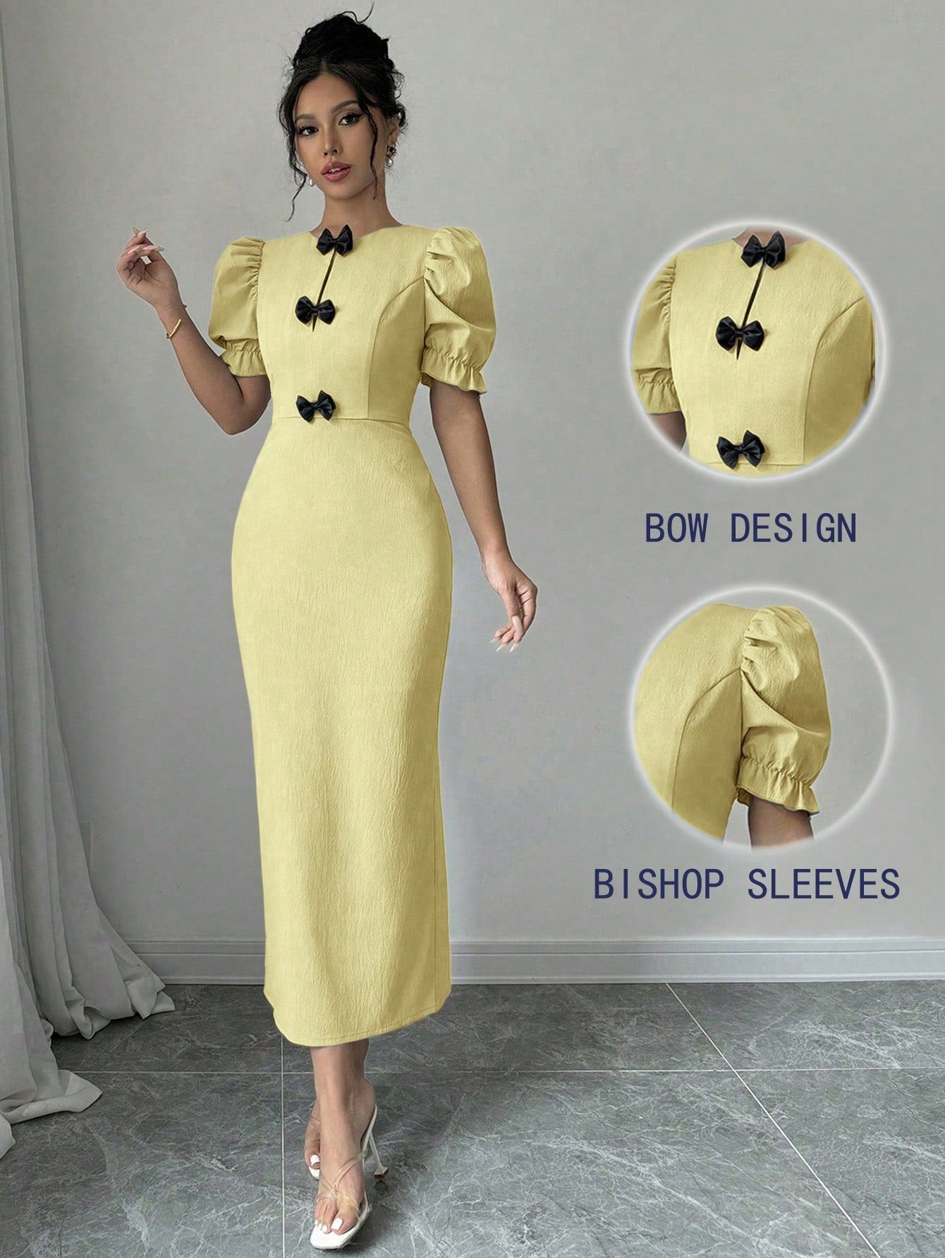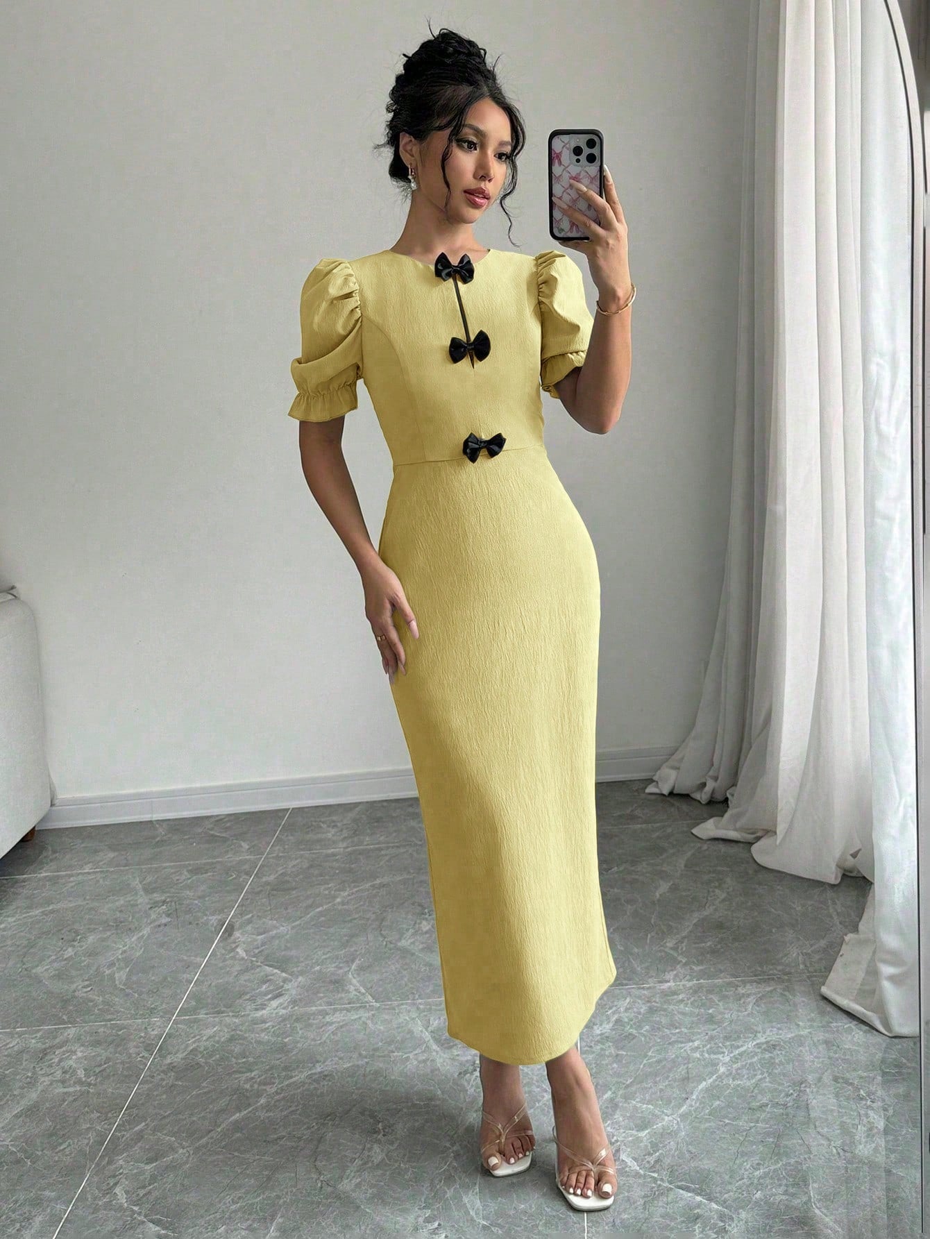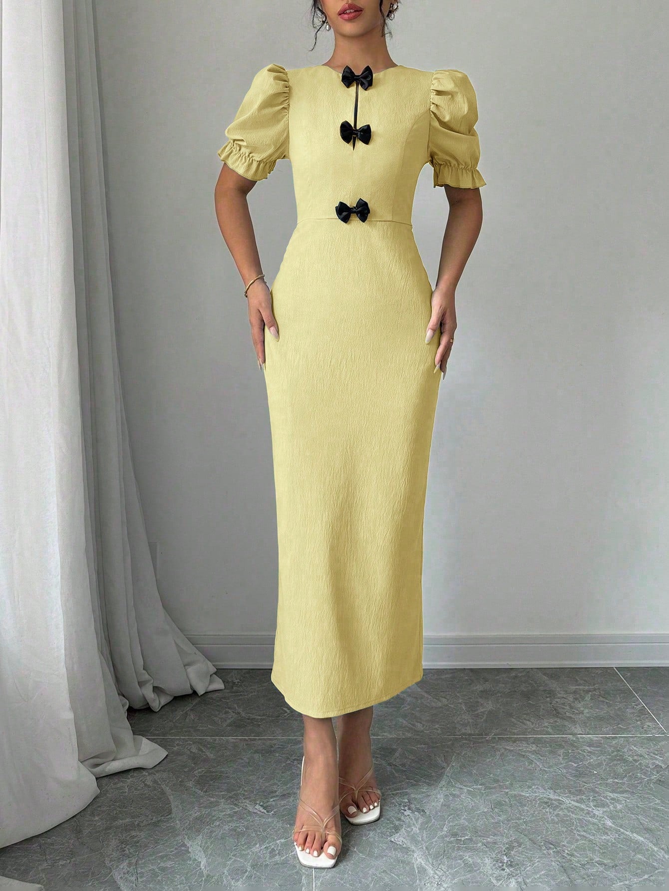 women Elenzga Elegant Puff Sleeve Bow Tied Slit Dress Maxi Women Outfit
