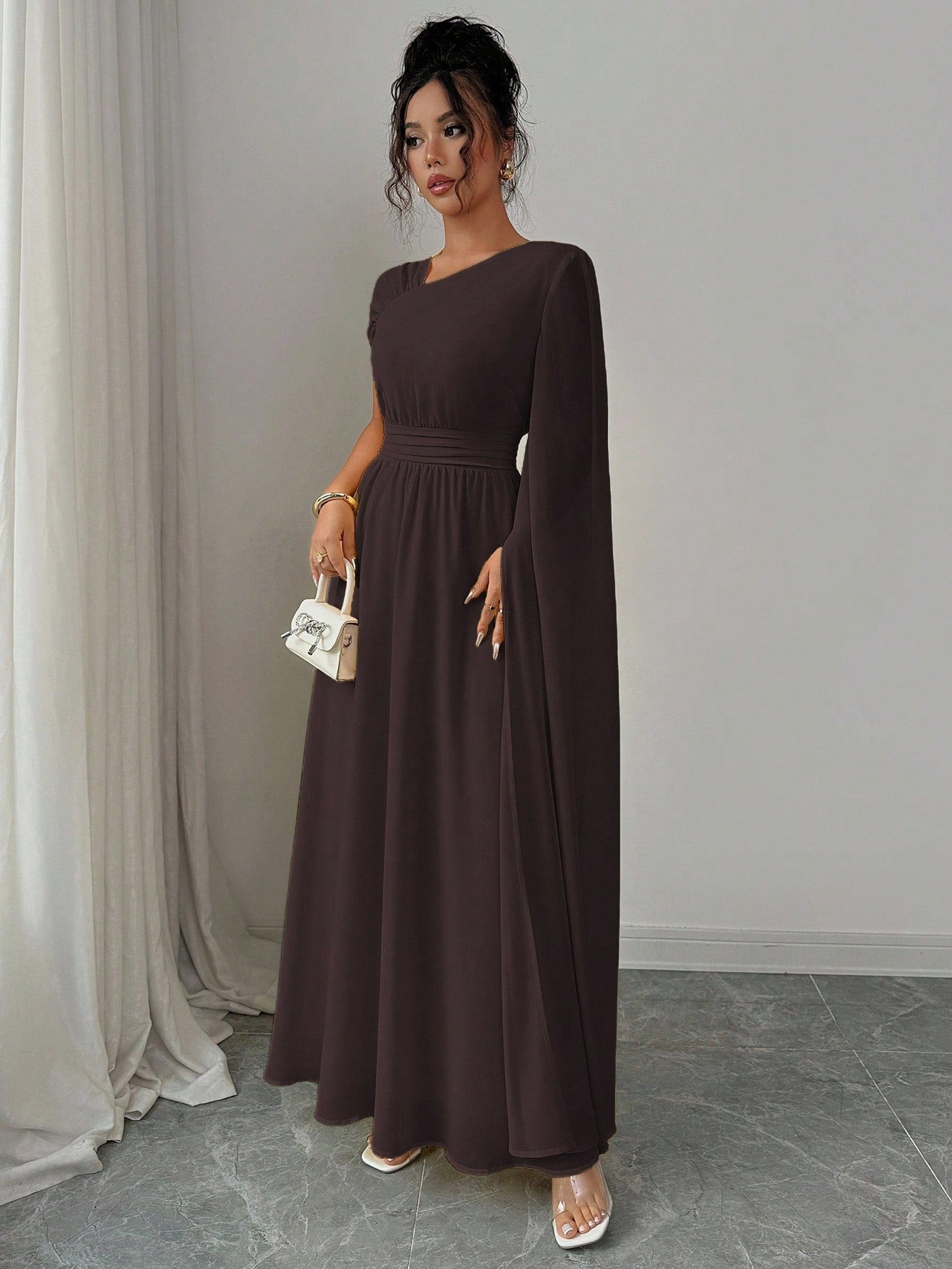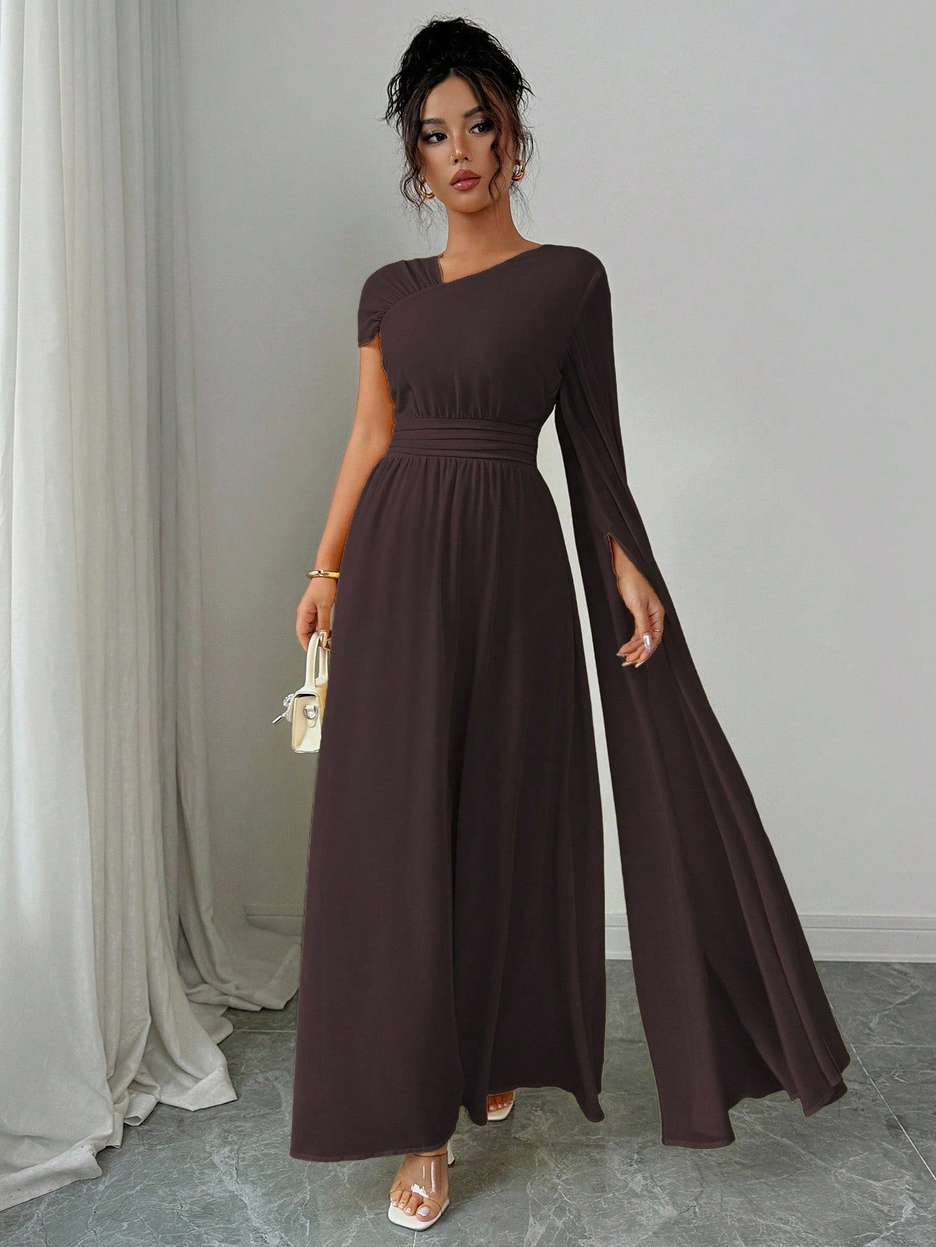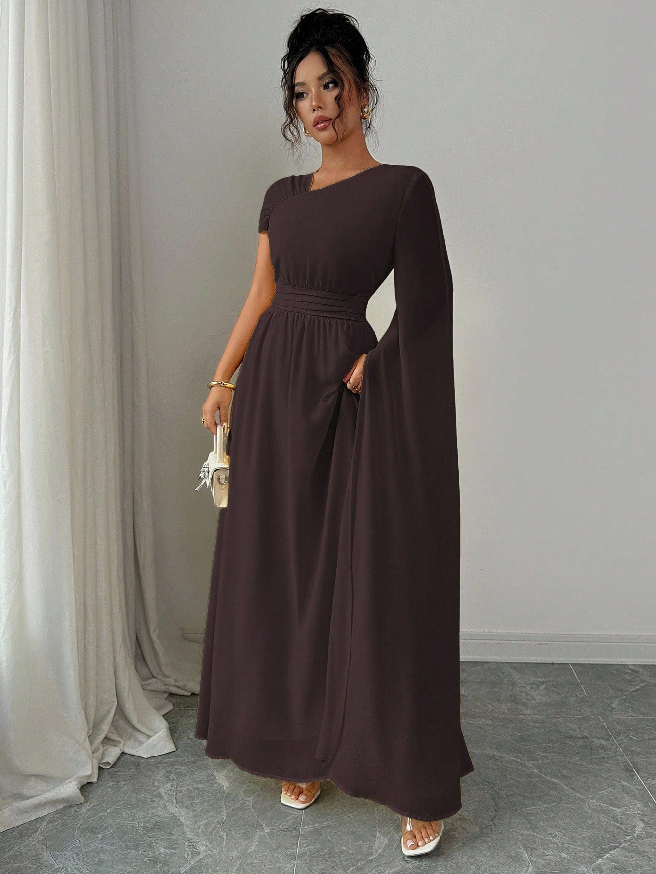 فستان نسائي من إيلينزغا مبطن بالشيفون بتصميم كتف غير متماثل أنيق