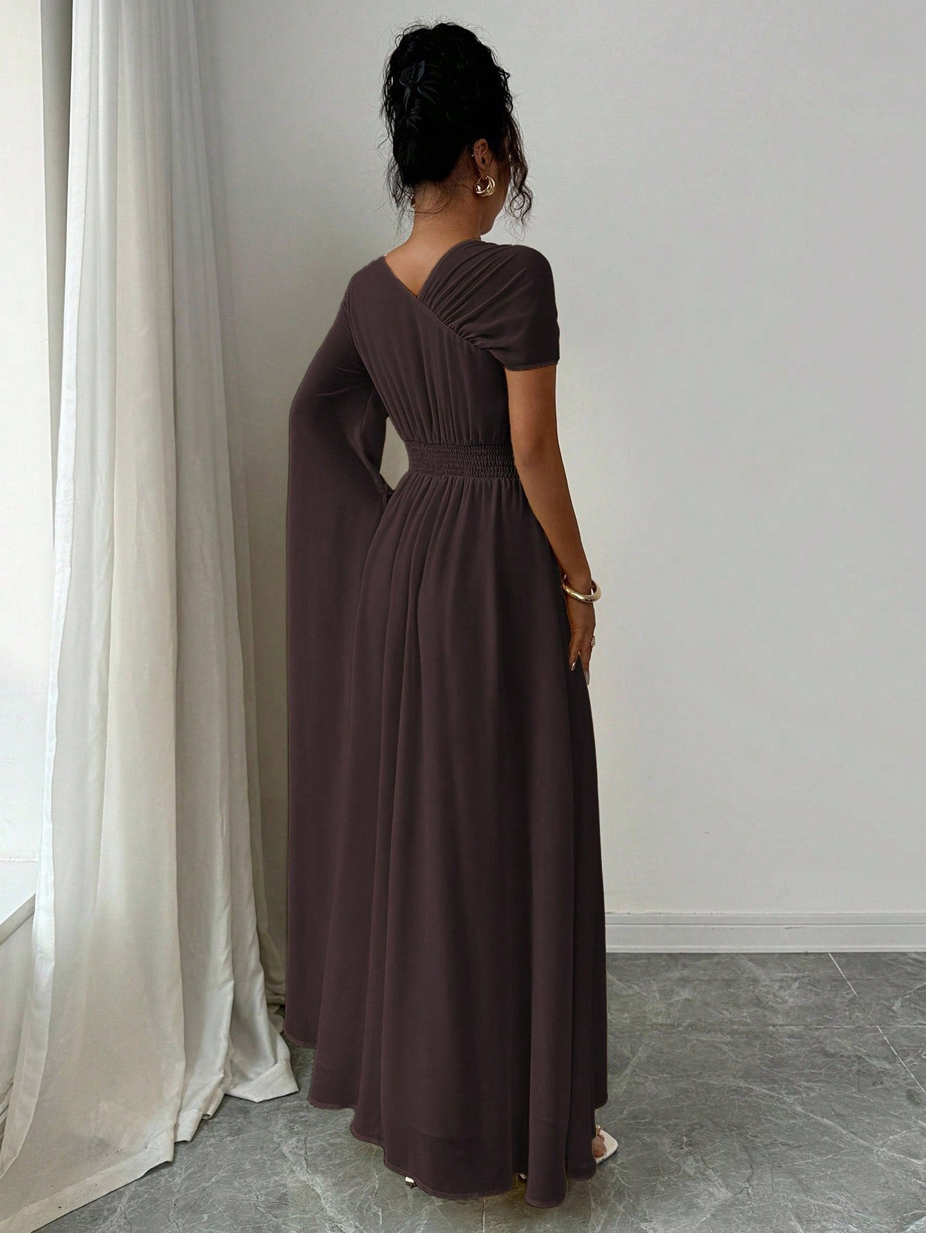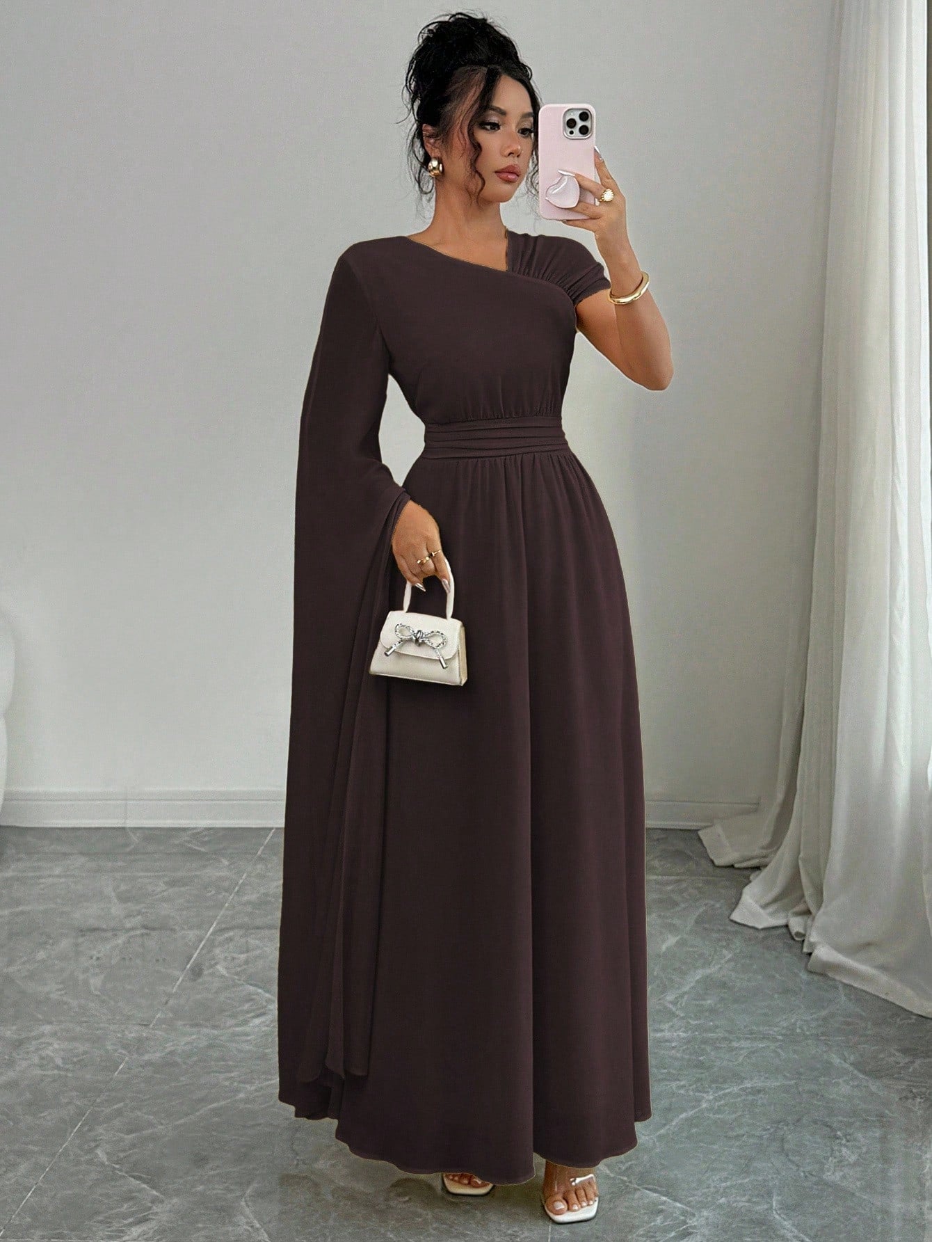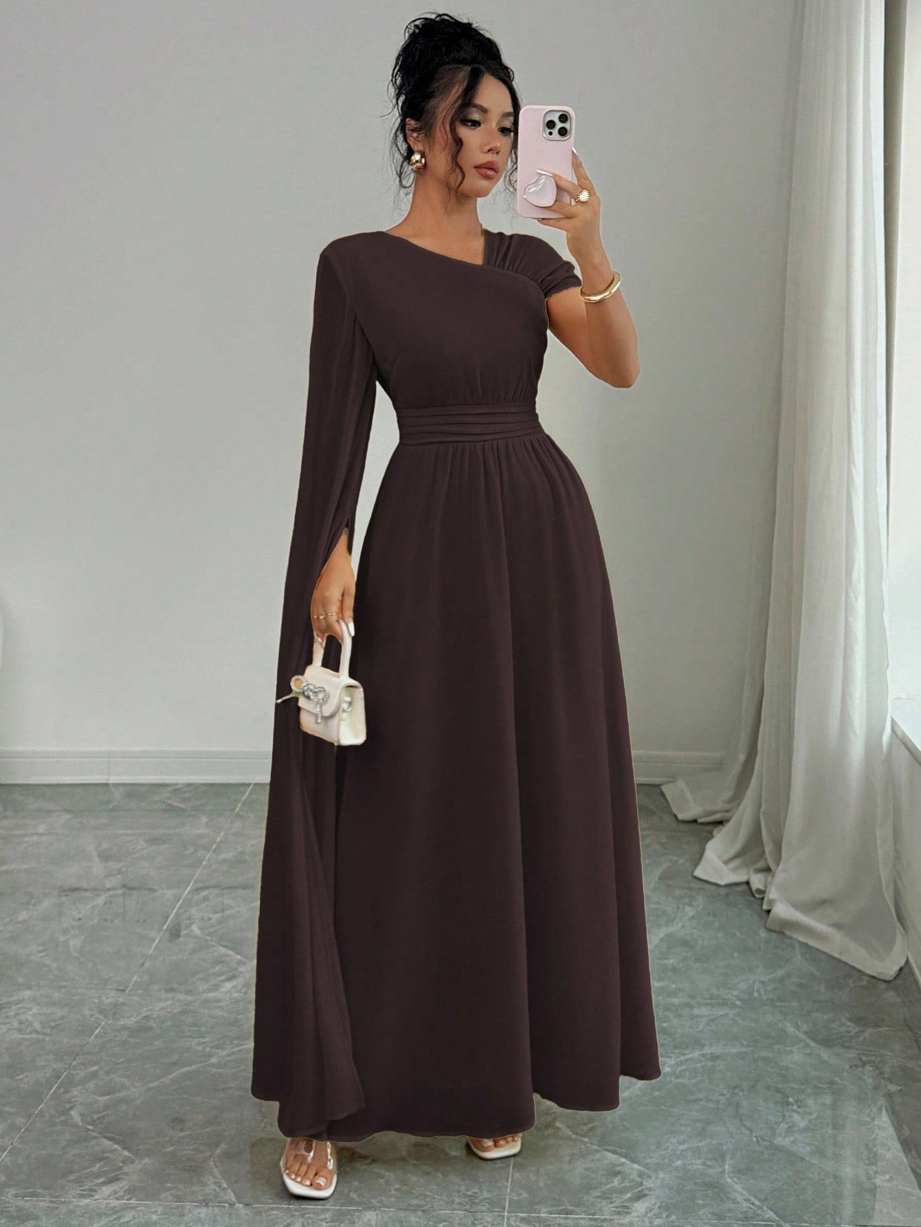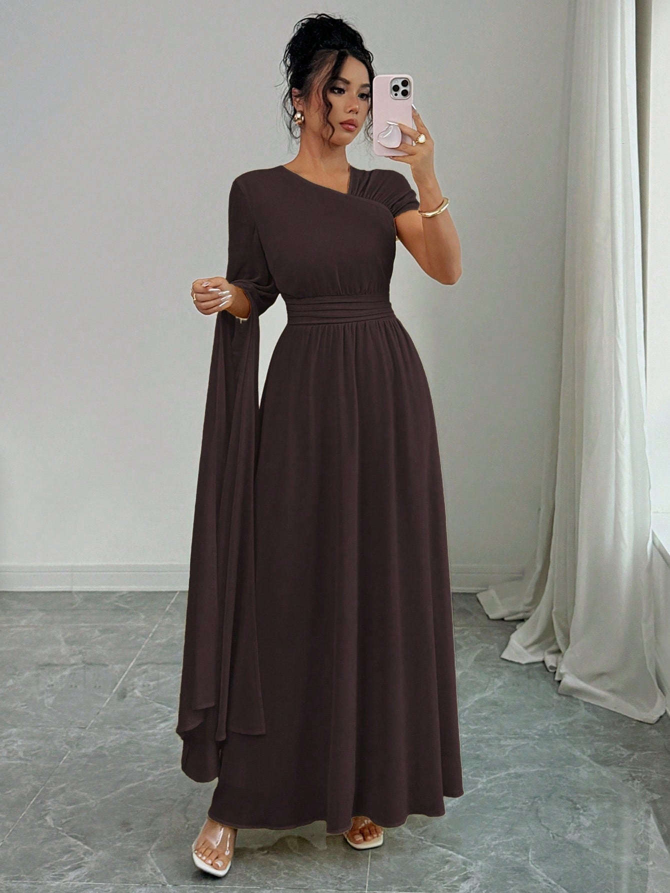 فستان نسائي من إيلينزغا مبطن بالشيفون بتصميم كتف غير متماثل أنيق