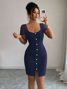 فستان أنيق ضيق من الشيفون المرقع بأكمام قصيرة مزين بأزرار من إيلينزغا للنساء