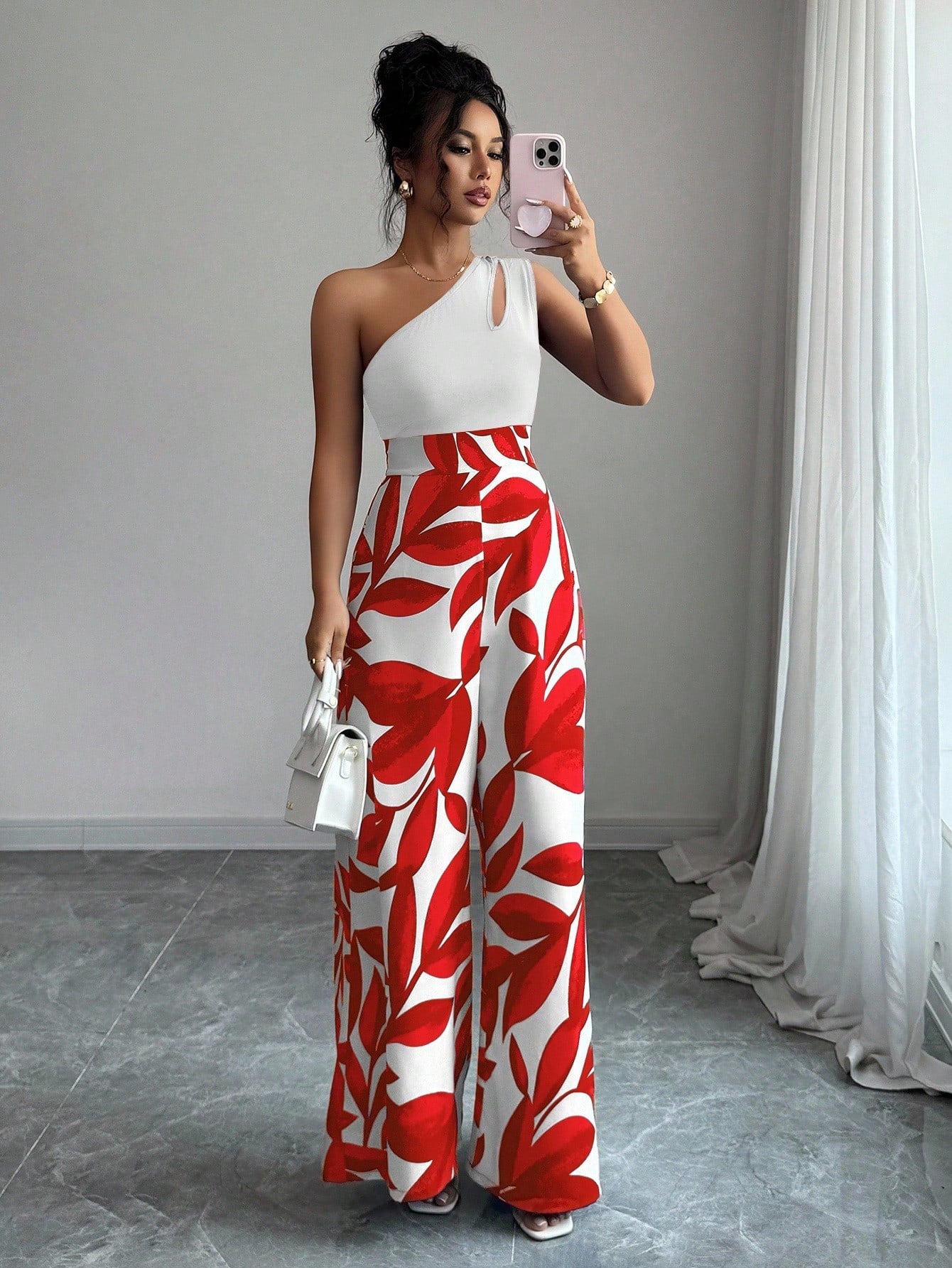 جمبسوت نسائي من إيلينزغا بكتف مائل وطبعة مرقعة وساق مستقيمة