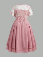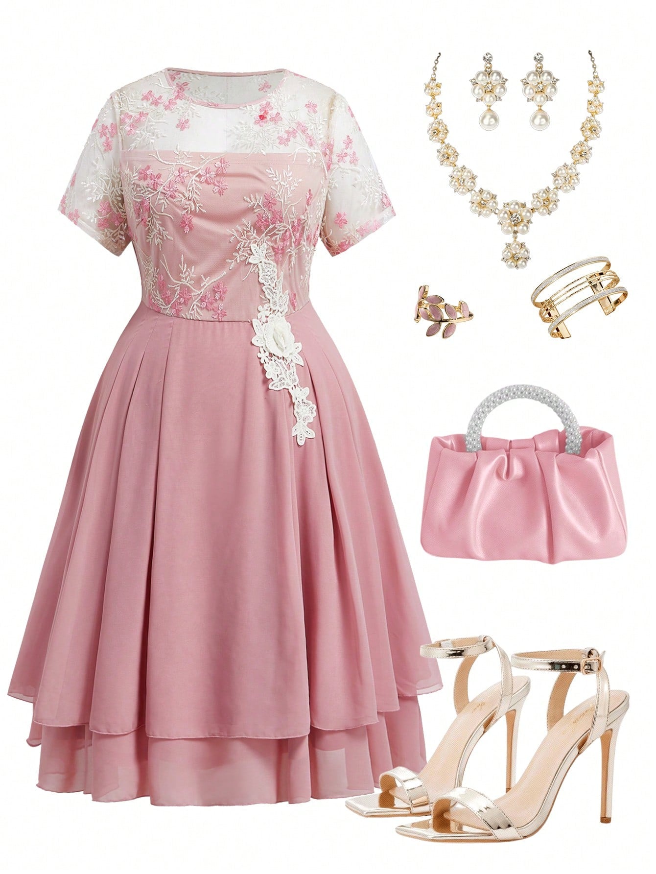 Ellevyn Women Plus Size Navy Blue Mesh & Solid Layered Chiffon Dress, Elegant For Weddings, Parties,Spring/Summer