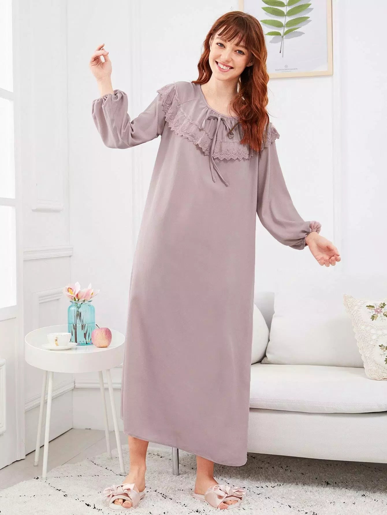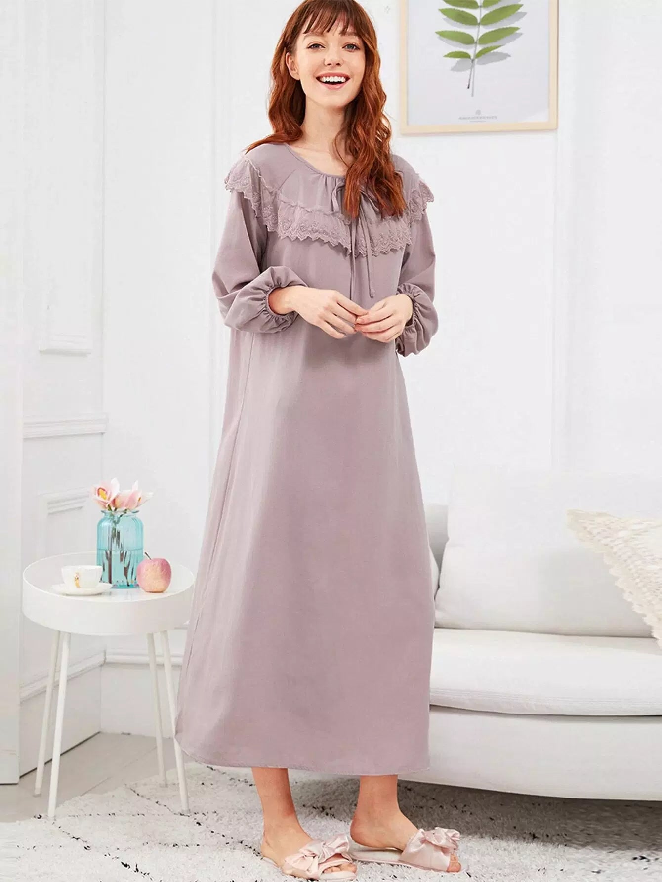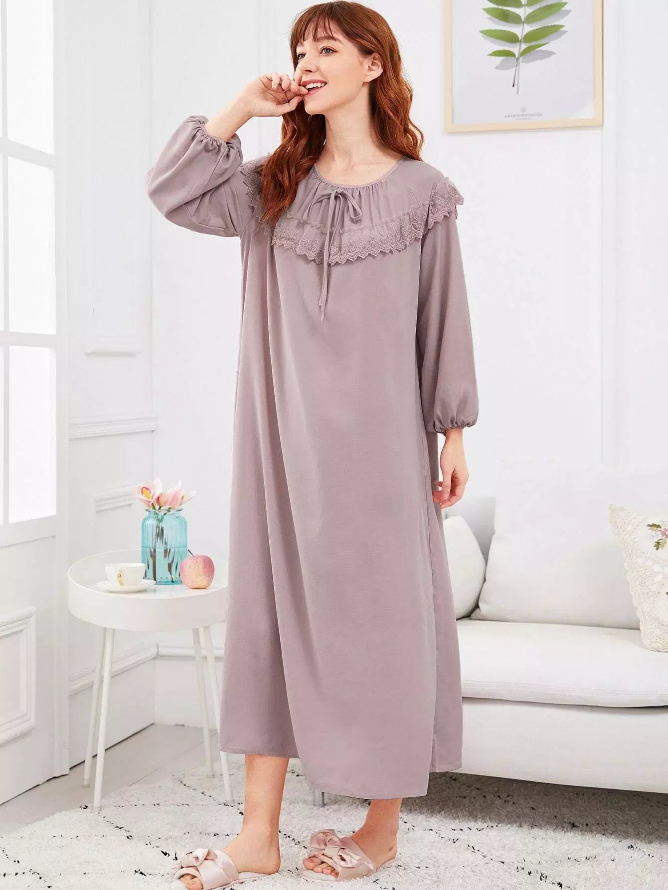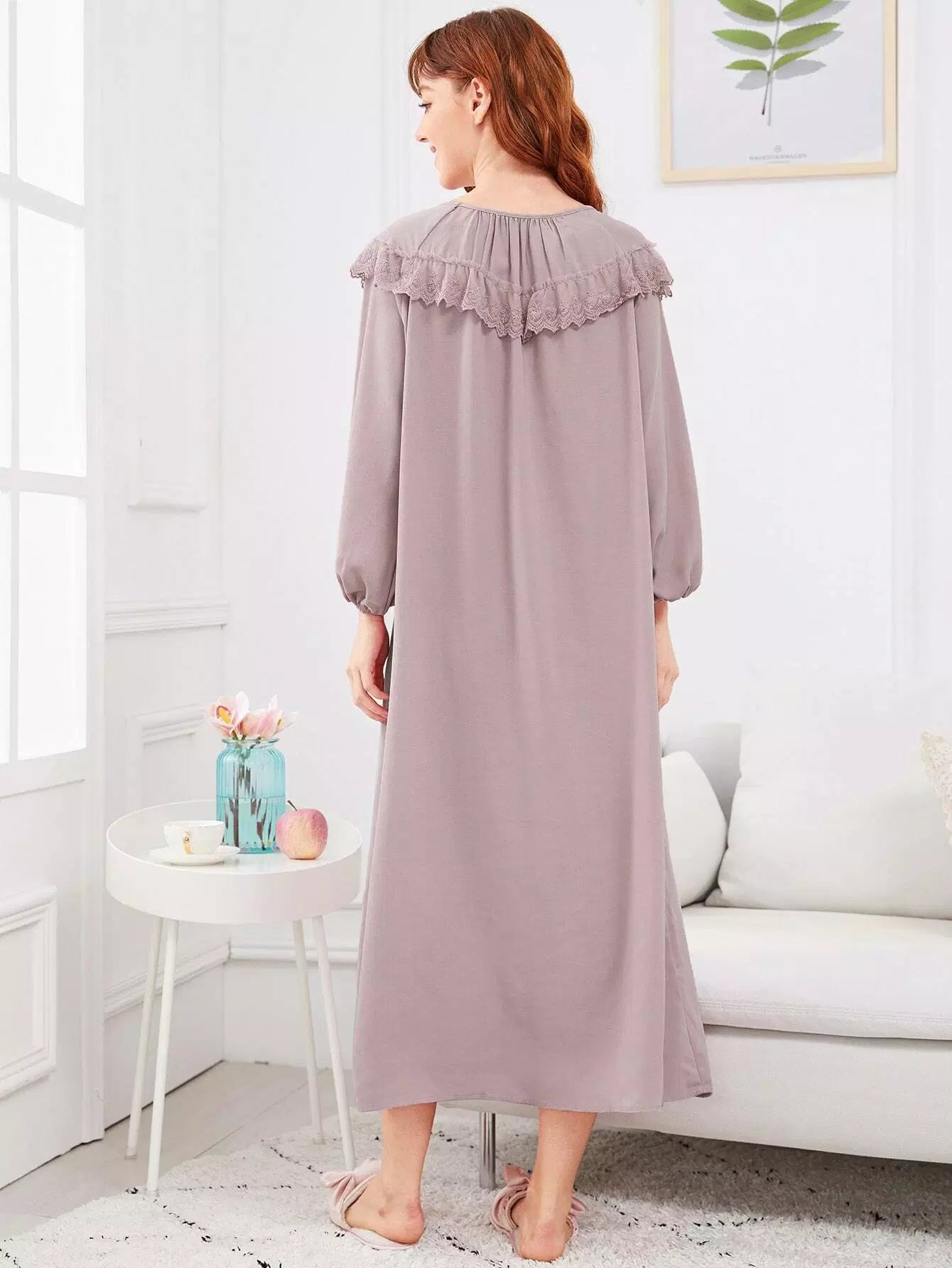 فستان نوم مطرز برقبة مطرزة بأكمام أسقفية