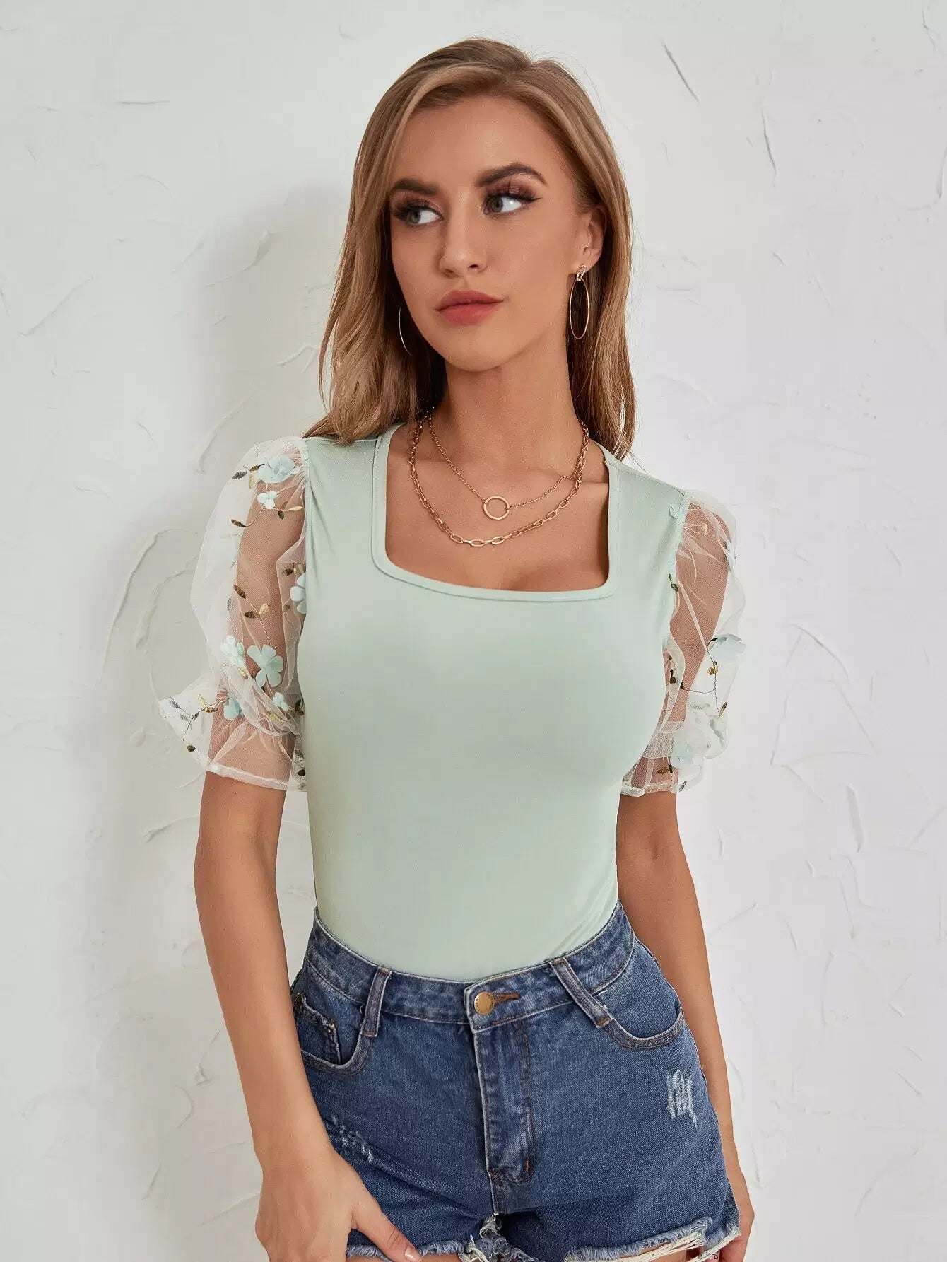 بذلة بأكمام شبكية مطرزة بأكمام منتفخة