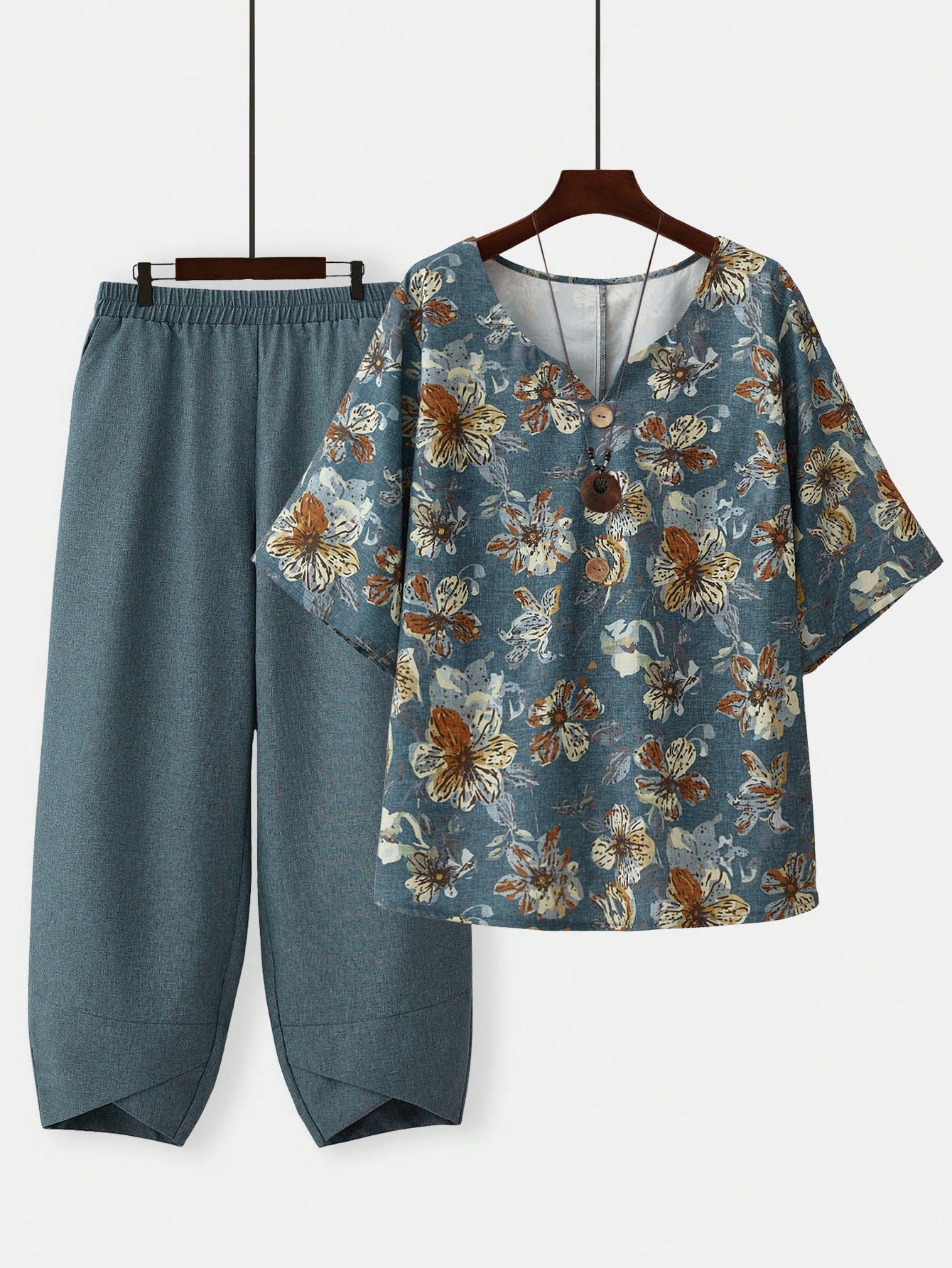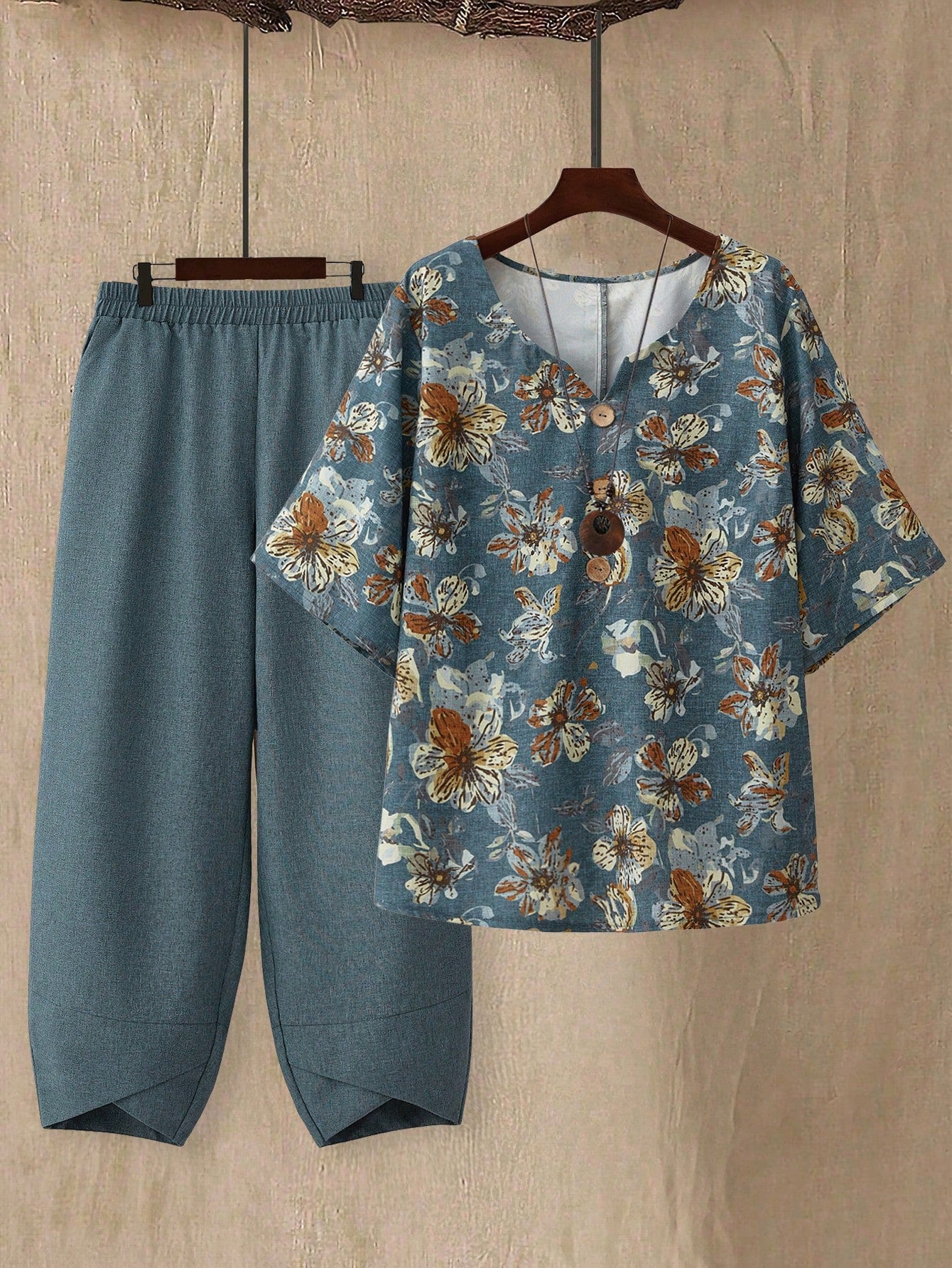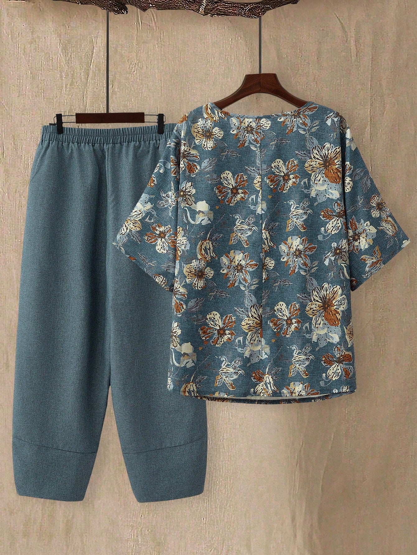 طقم قميص وبنطال مطبوع بلون كاكي مناسب للعطلات في أوائل الربيع من إيمري روز، قطعتين، مقاس كبير للنساء