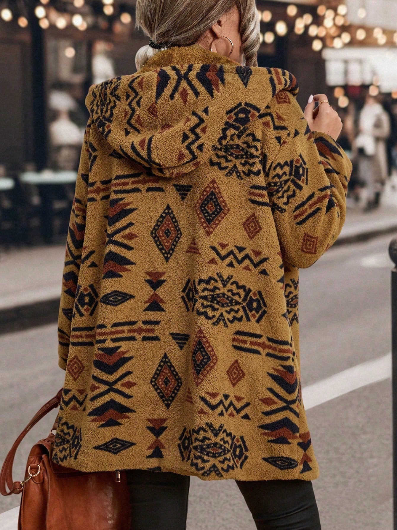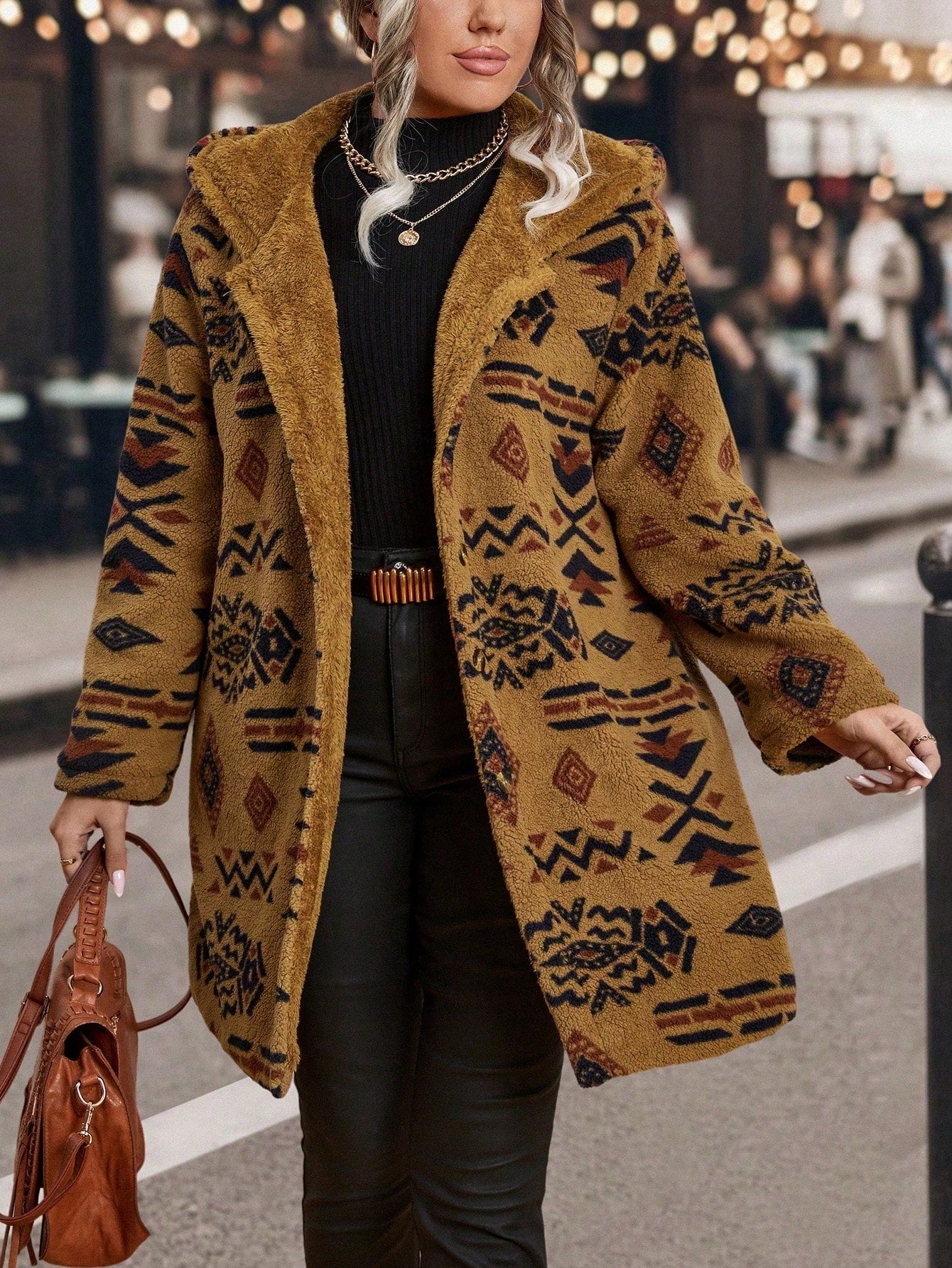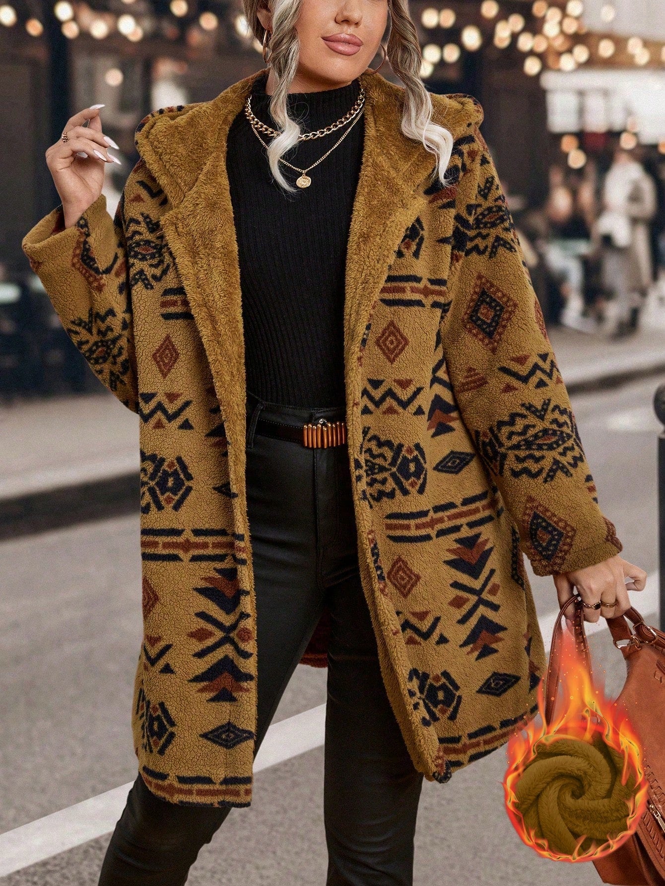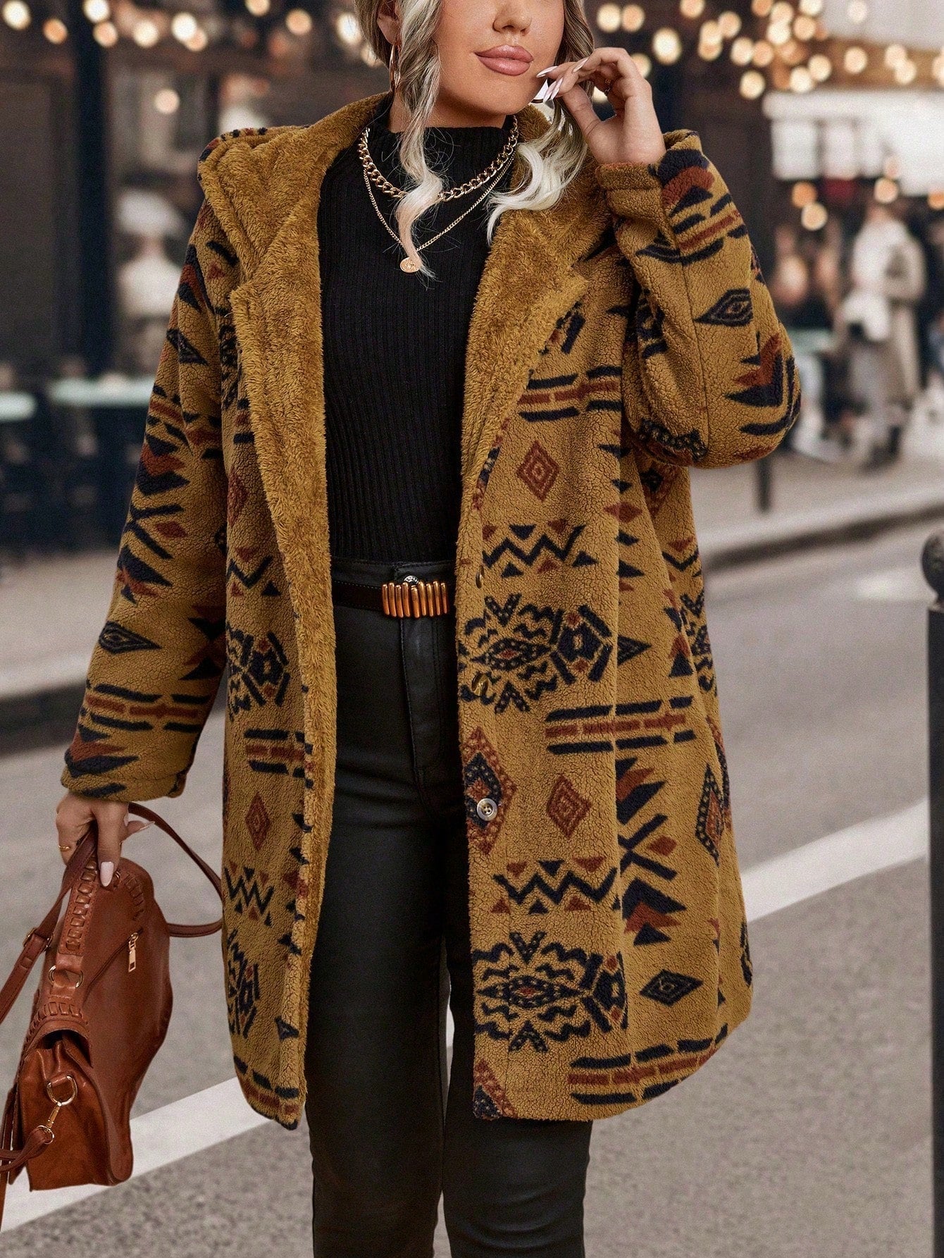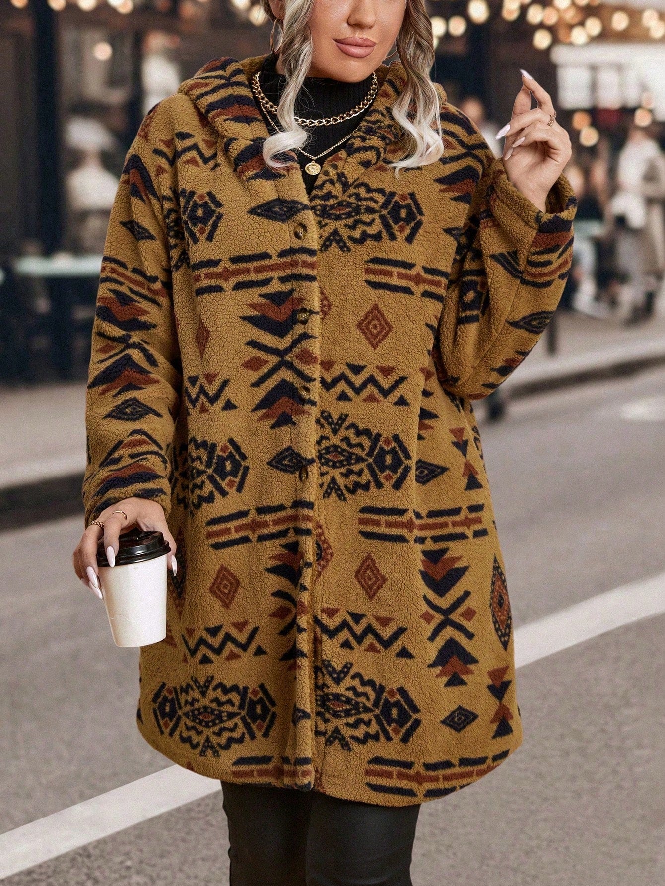 EMERY ROSE Plus Geo Print Drop Shoulder Curved Hem Button Front Padded Coat Thermal, For Winter Clothes
