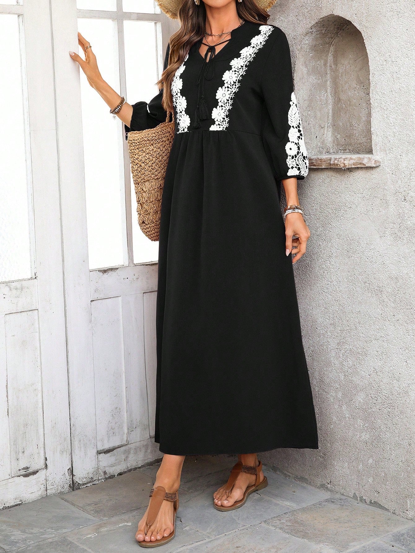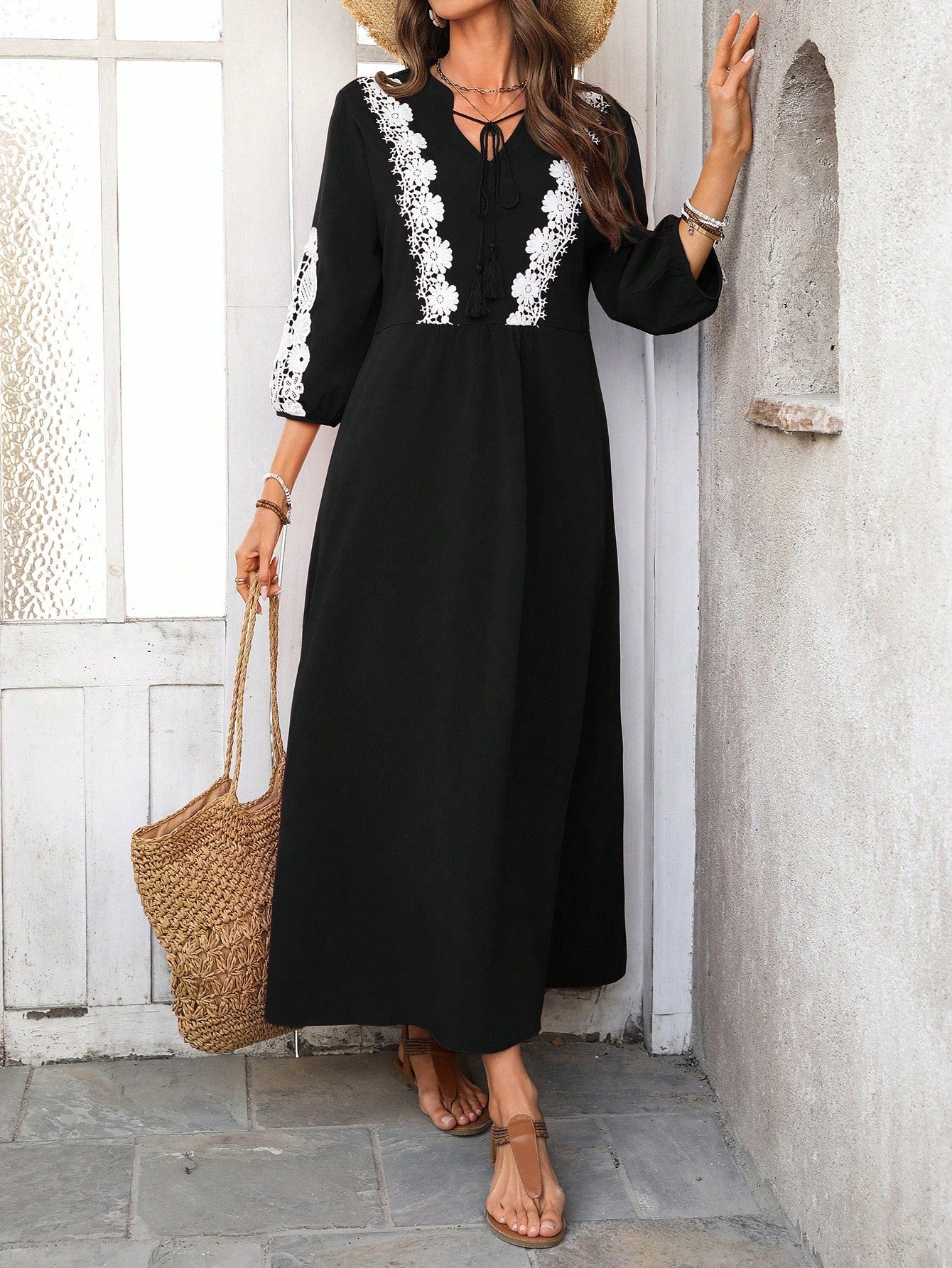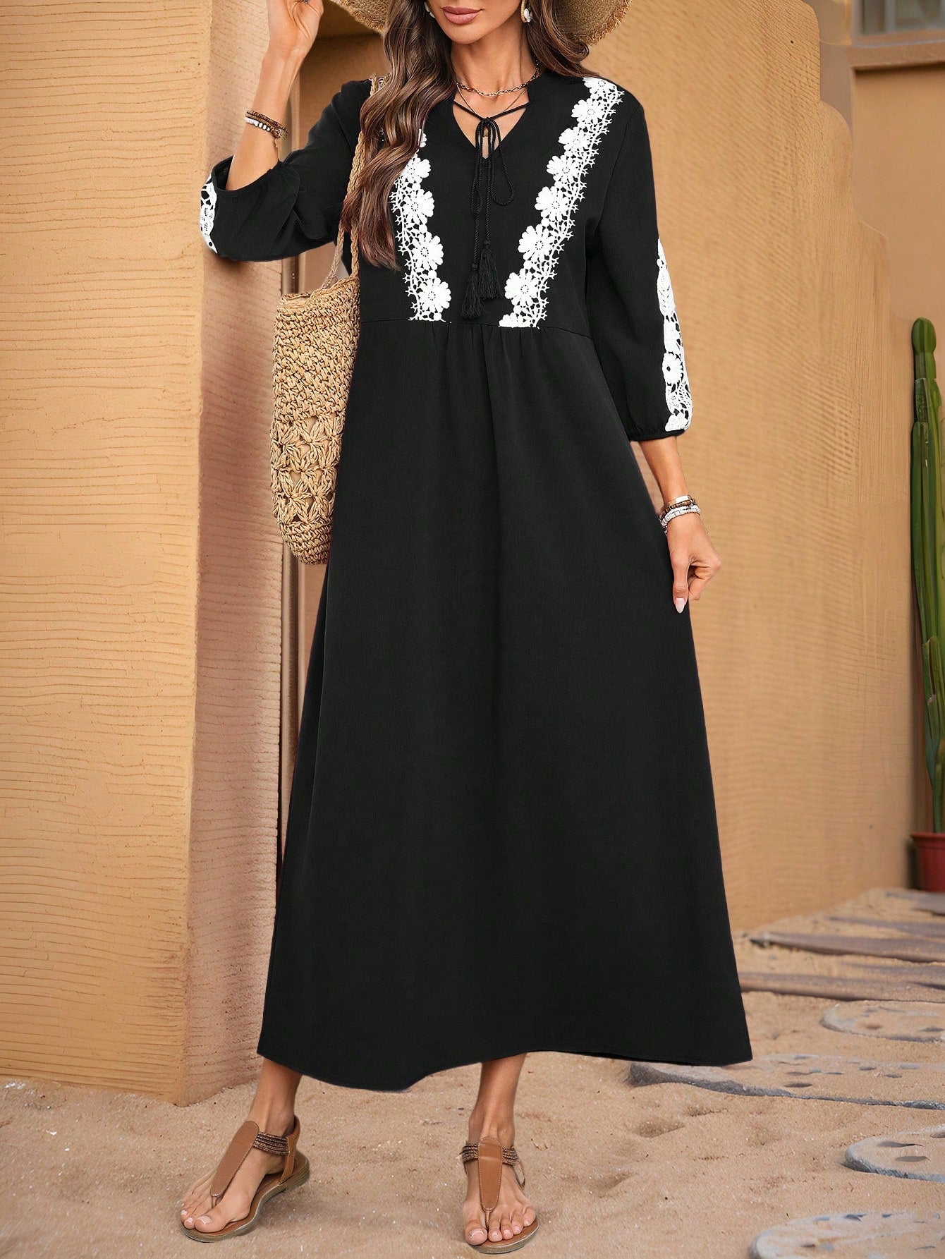 EMERY ROSE Women's Modest Black Woven Fabric Long Dress With Three Quarter Length Sleeves And Notched