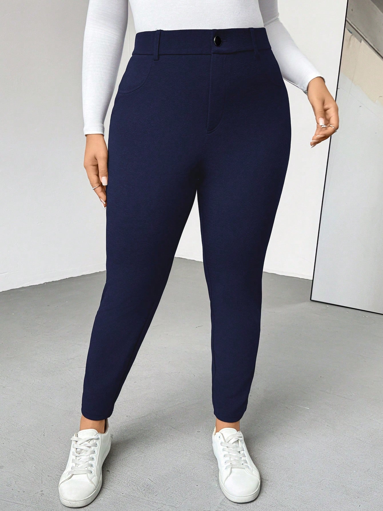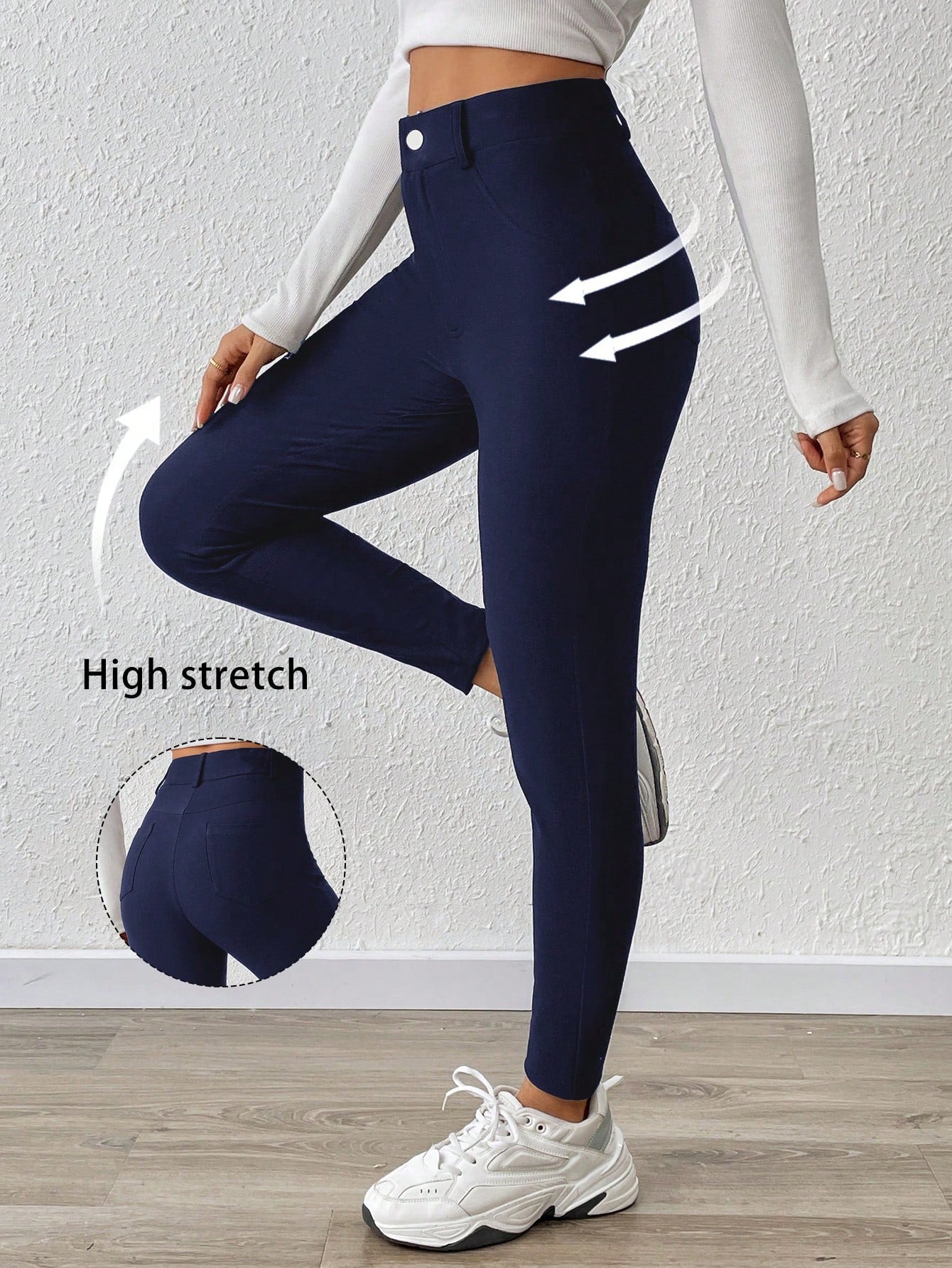 بنطلون نسائي من إيسنس بمقاسات كبيرة، مناسب لفصلي الربيع والصيف، بتصميم عصري مريح وعملي، بقصة ضيقة، باللون الأزرق الداكن، وقصة عالية المرونة.