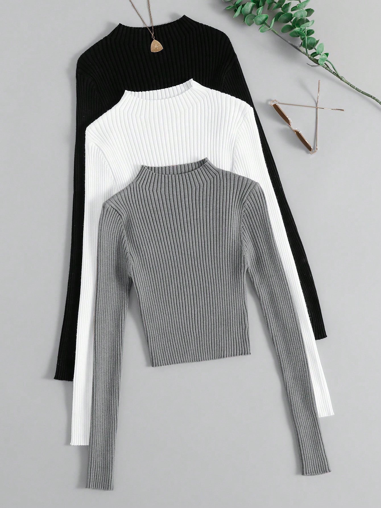 مجموعة من ثلاث كنزات صوفية كاجوال بلون موحد، بياقة واقفة وقصة ضيقة من EURMUSE