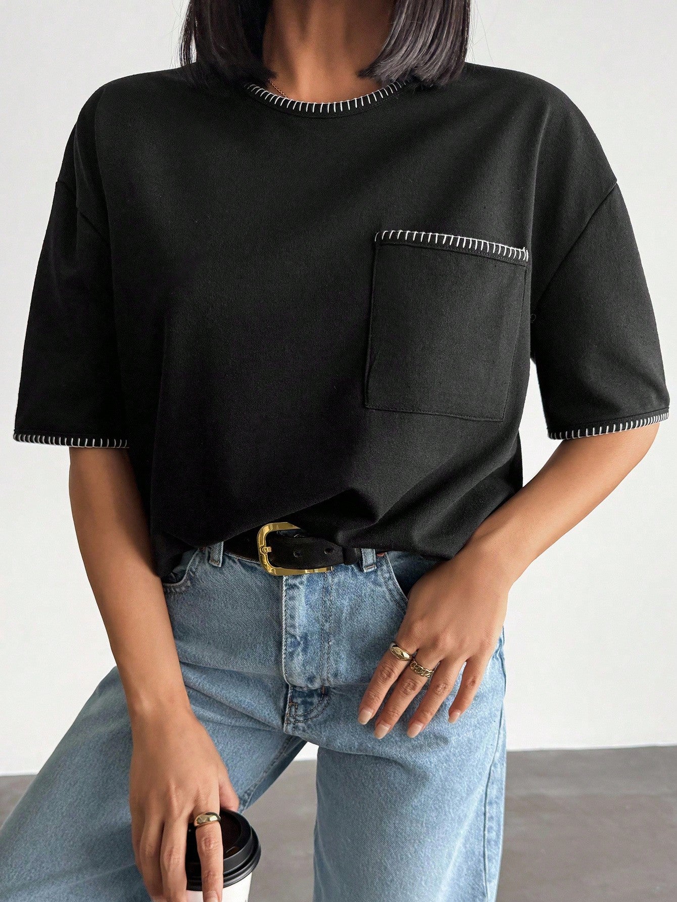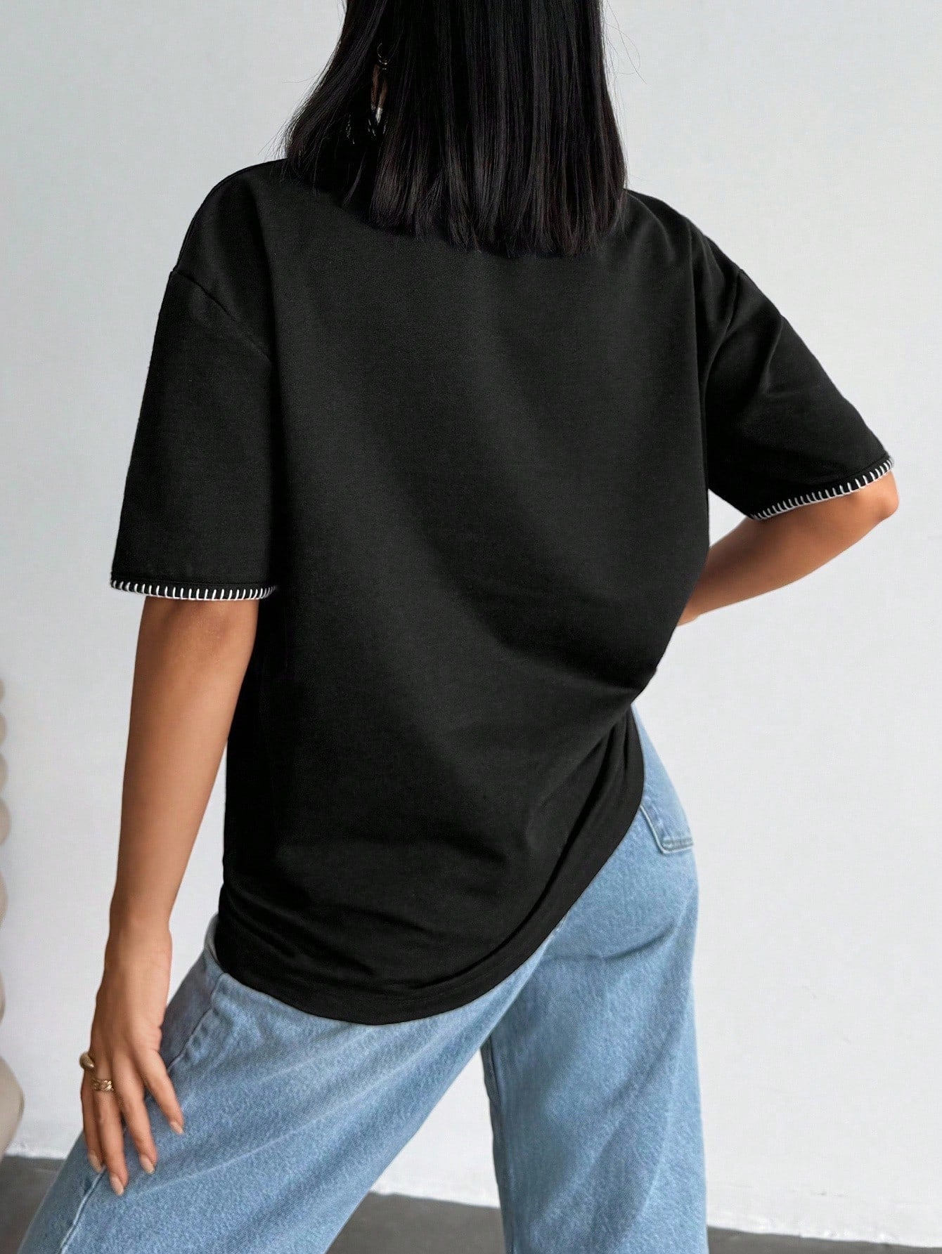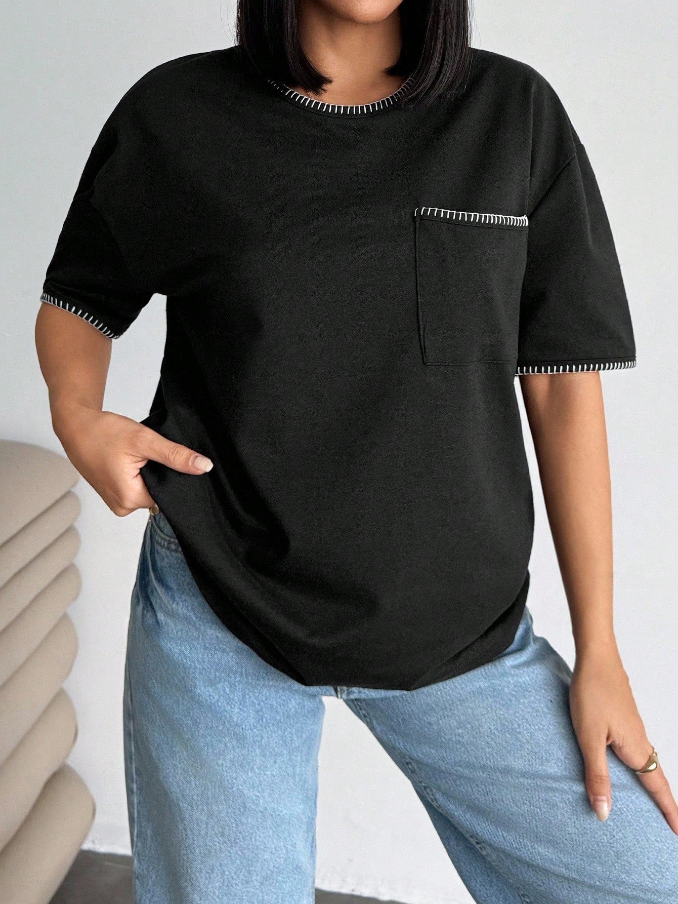 تيشيرت نسائي كبير الحجم من EURMUSE، أسود اللون، مزين بتفاصيل متباينة وجيوب