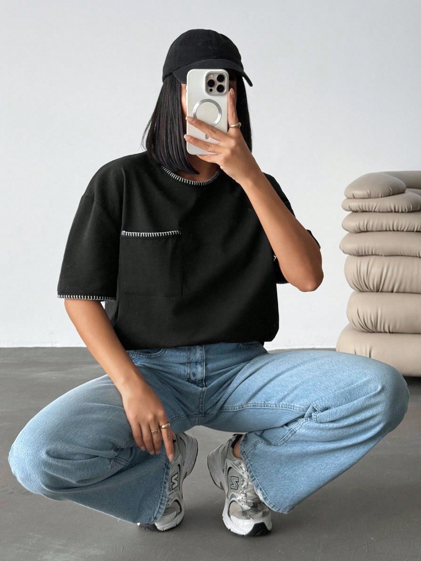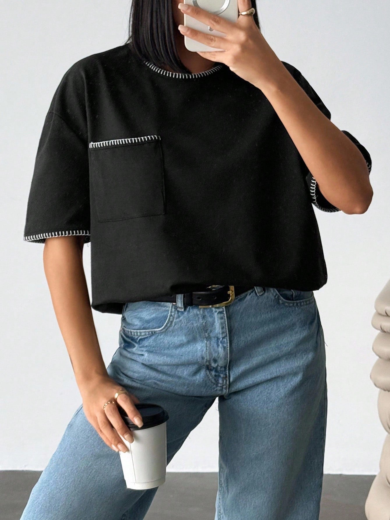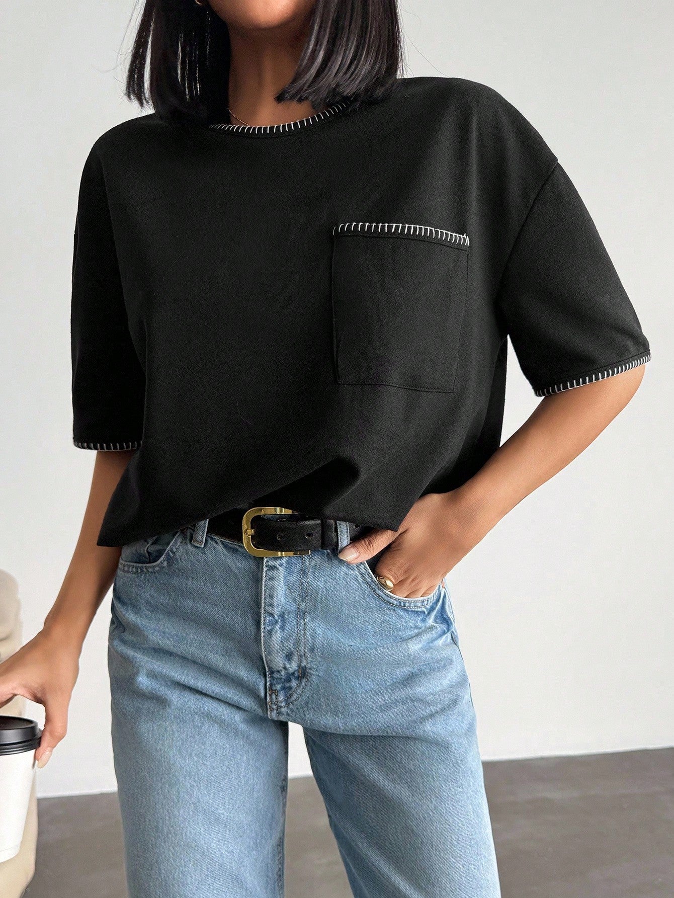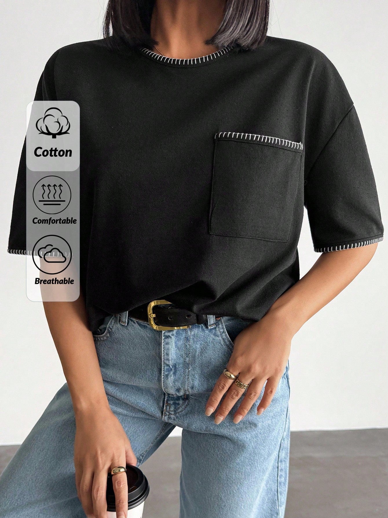 تيشيرت نسائي كبير الحجم من EURMUSE، أسود اللون، مزين بتفاصيل متباينة وجيوب