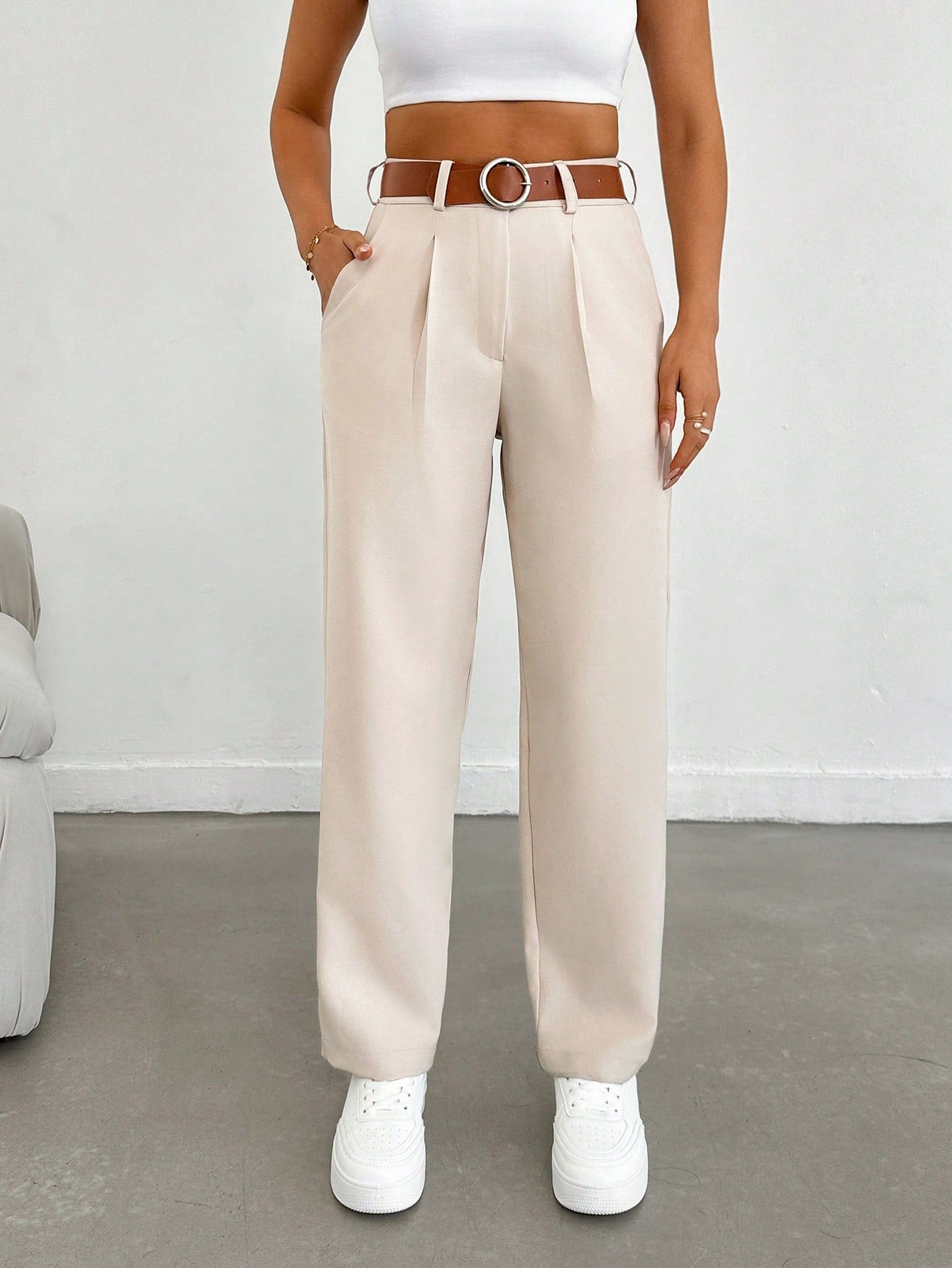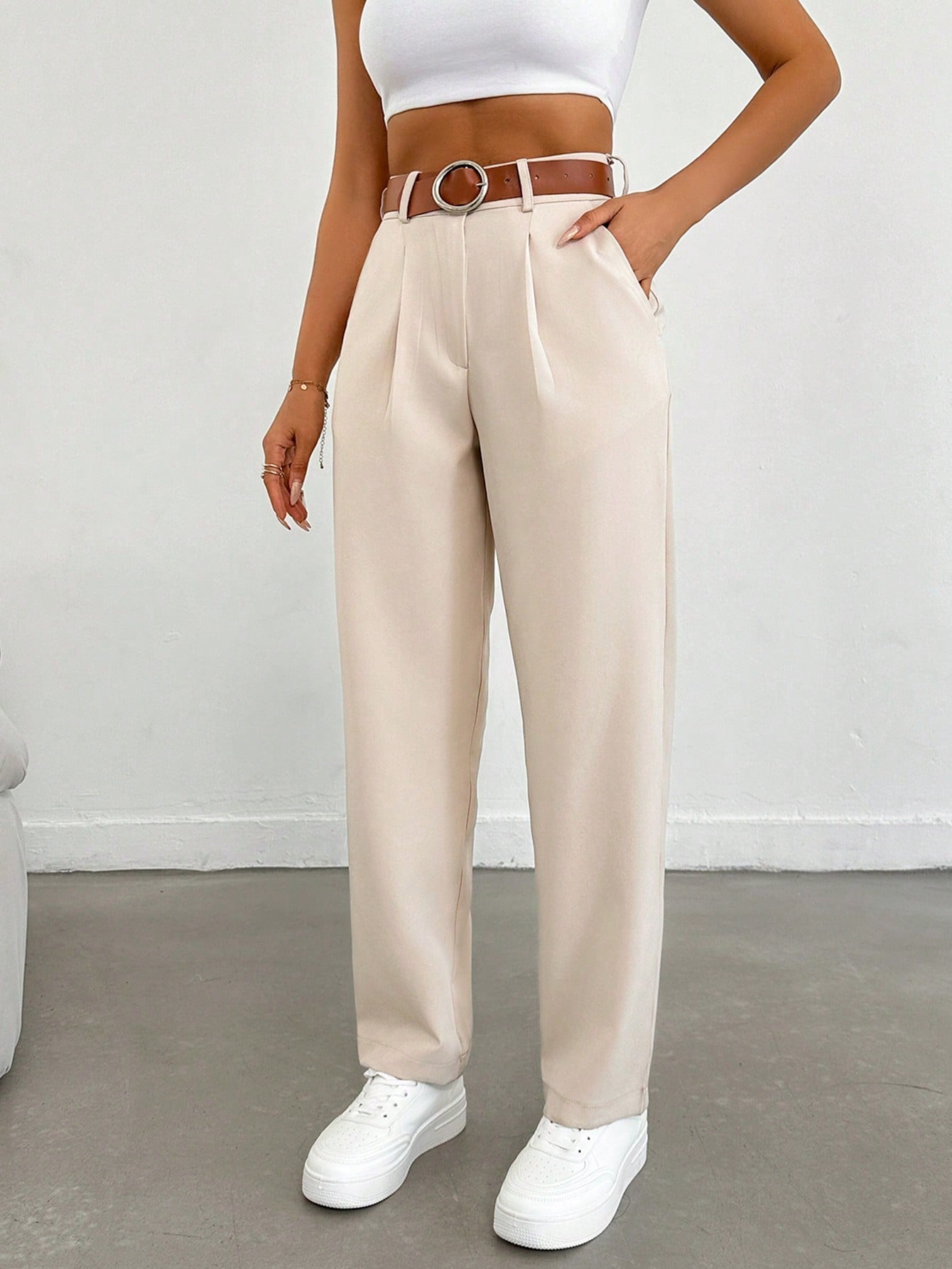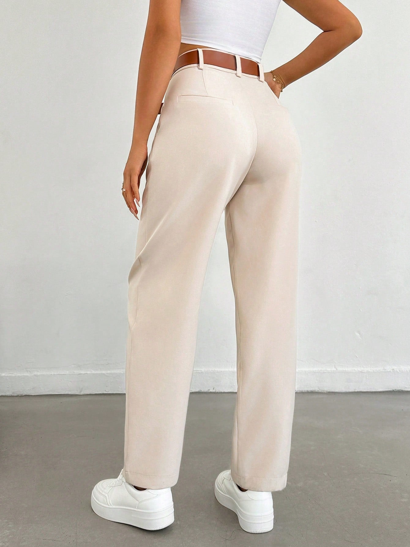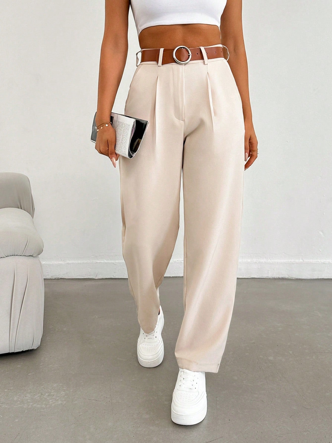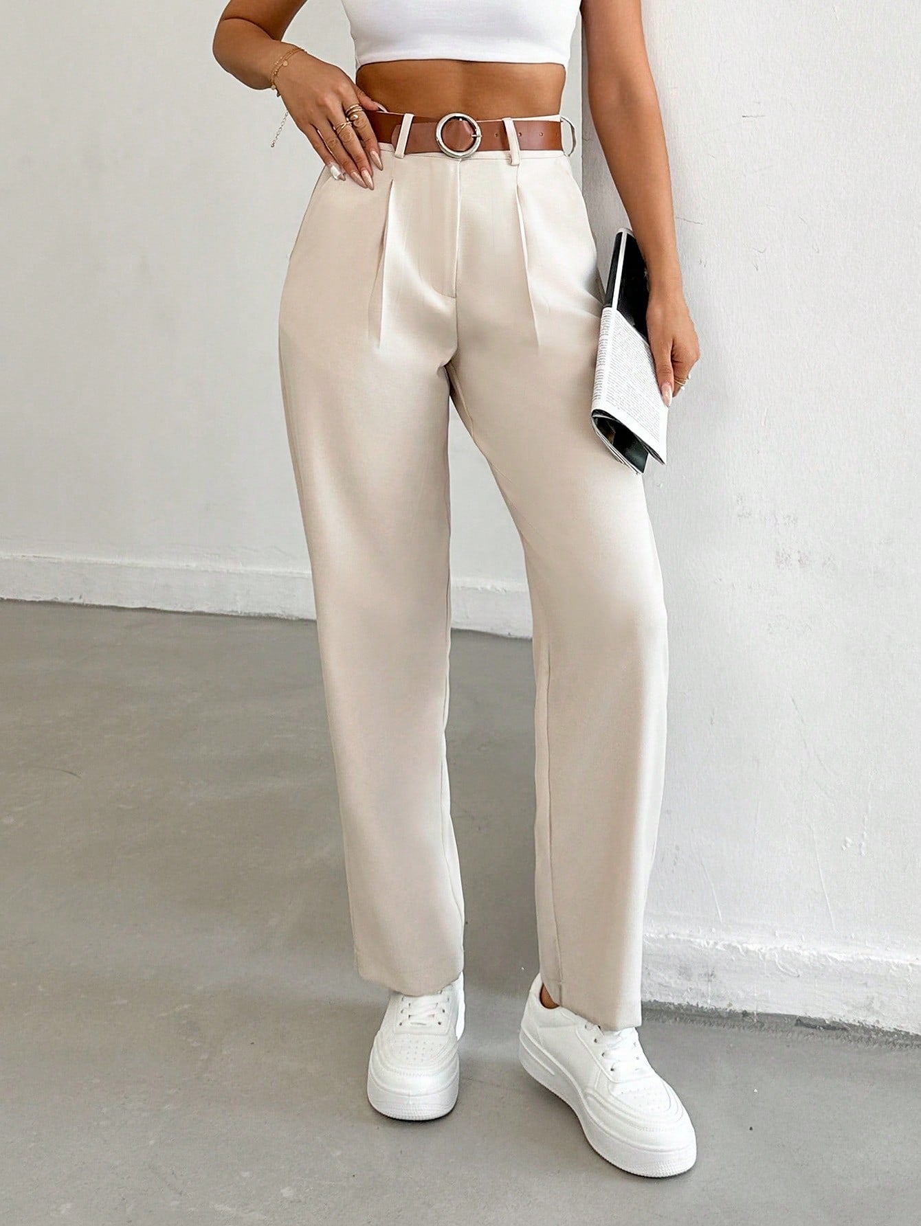 بنطلون طويل نسائي من EURMUSE بلون موحد، بقصة مستقيمة فضفاضة وكسرات، مناسب للارتداء اليومي والتنقلات غير الرسمية.