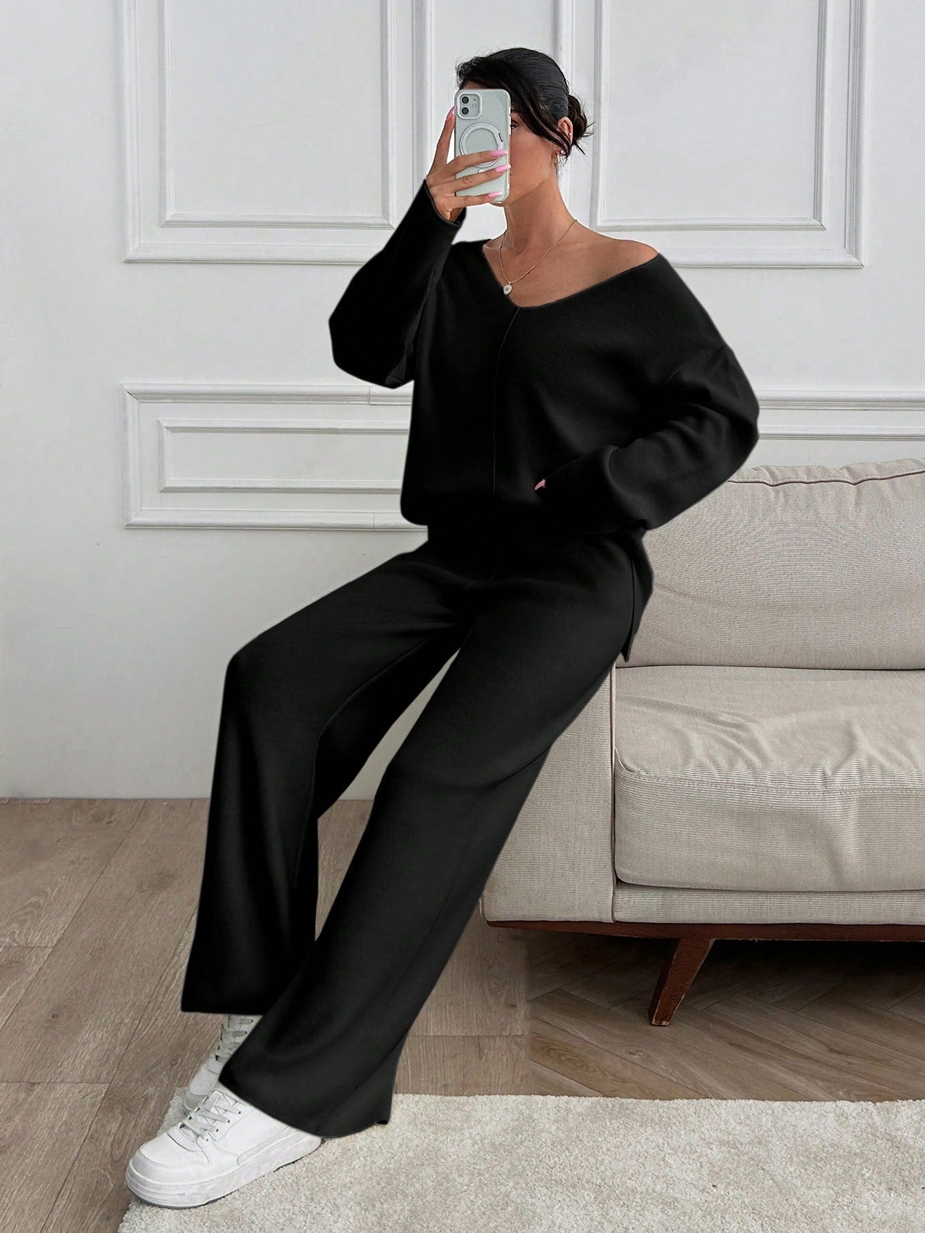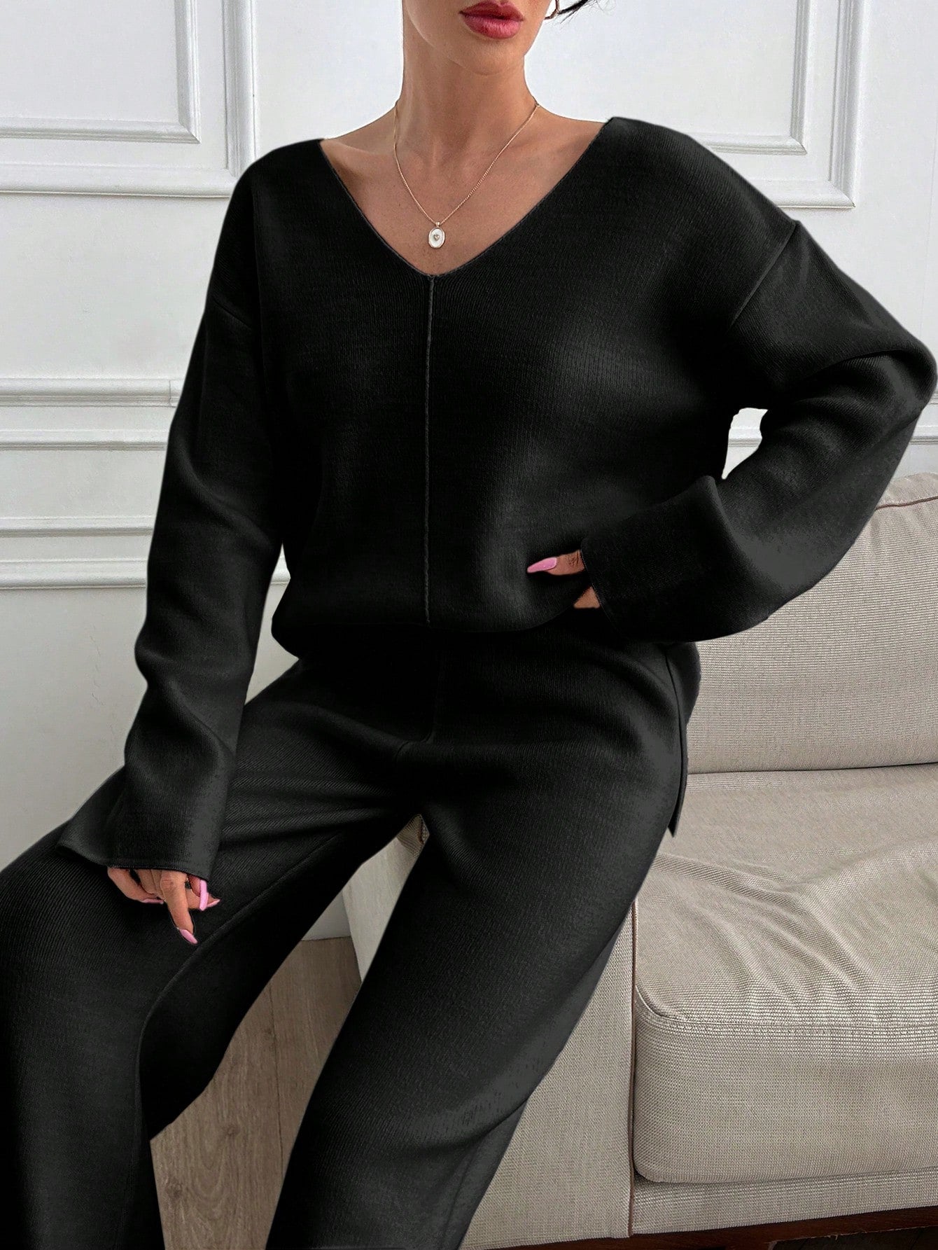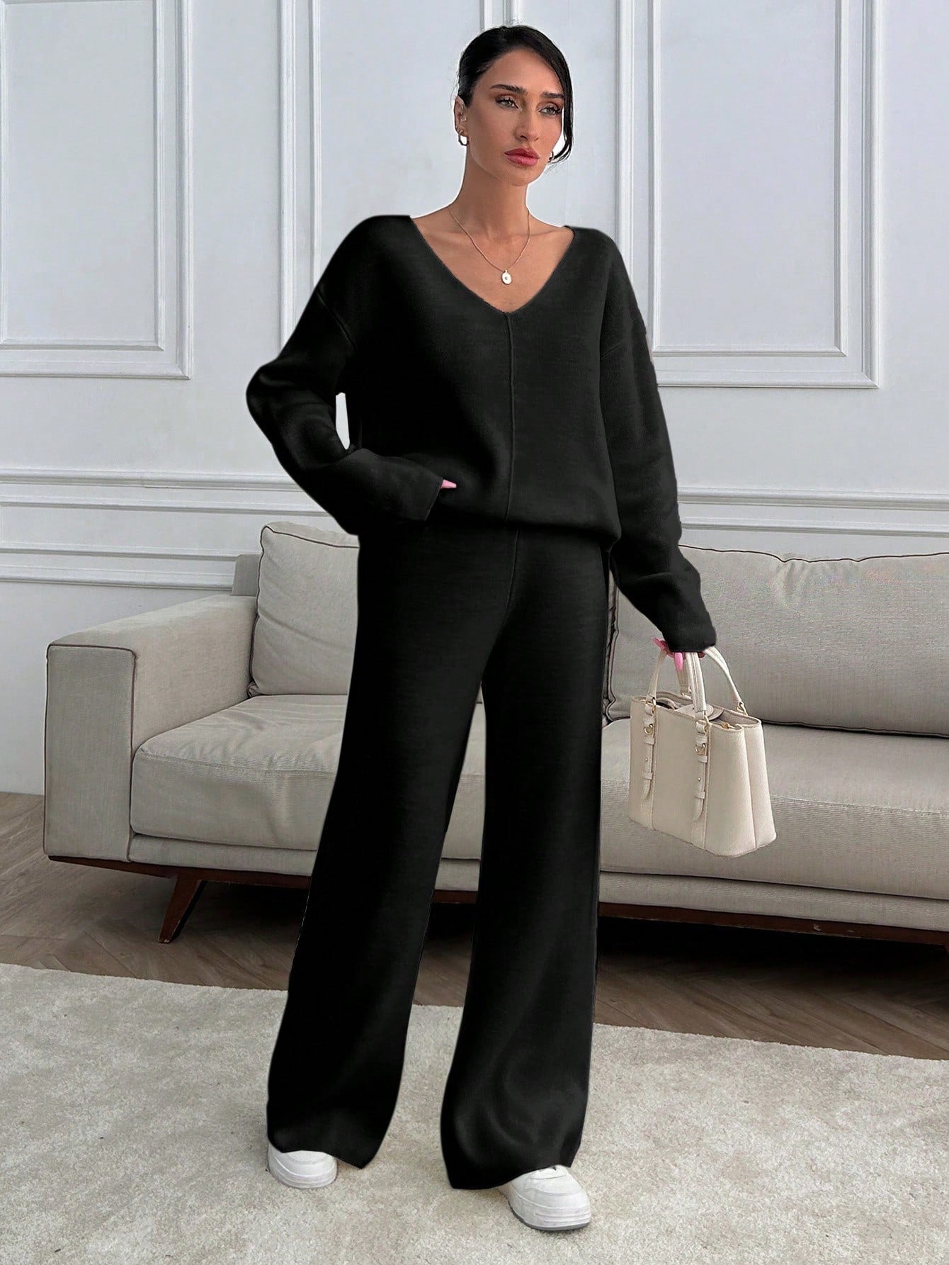 طقم نسائي من EURMUSE مكون من كنزة صوفية واسعة برقبة على شكل حرف V وبنطال محبوك