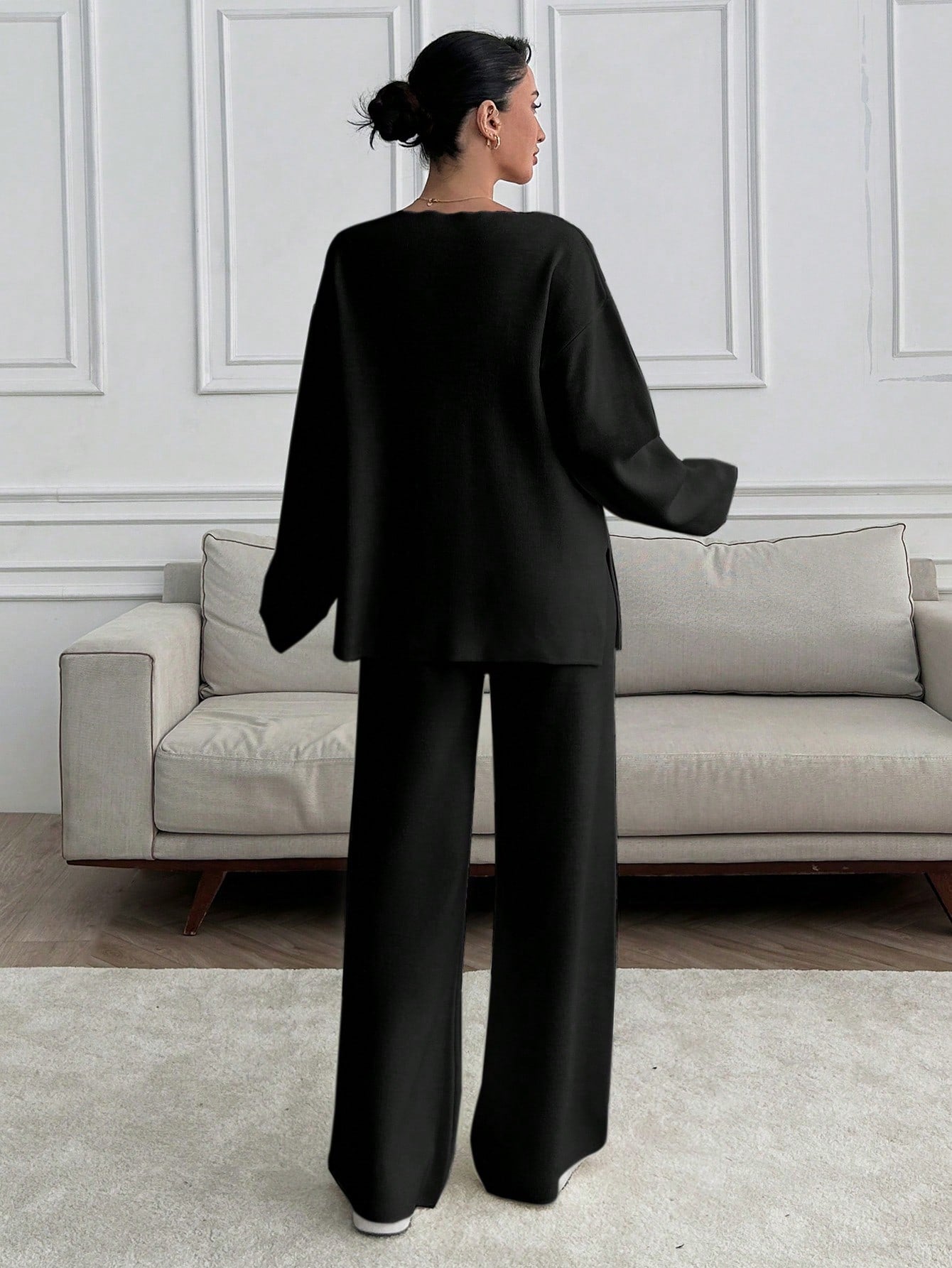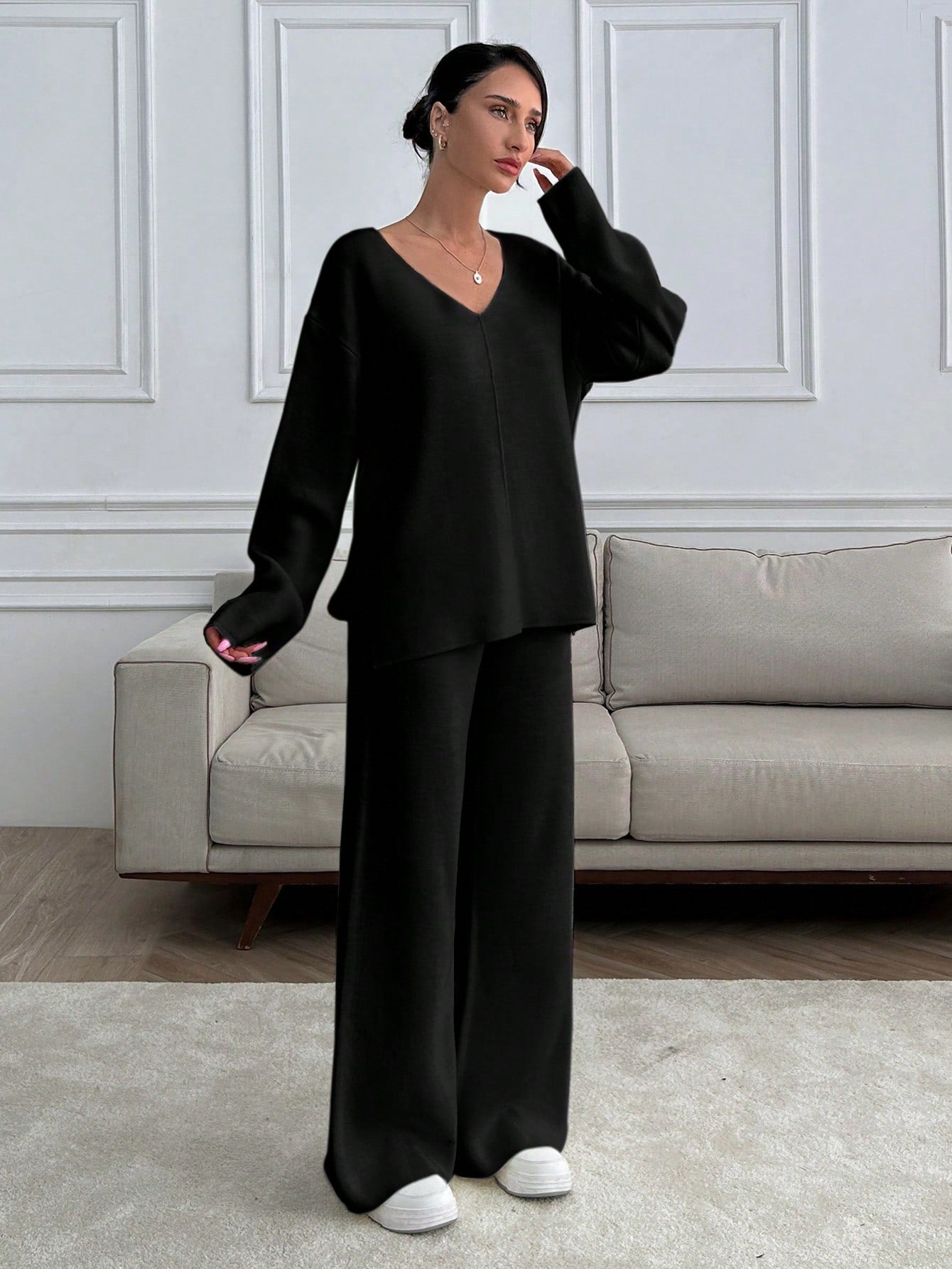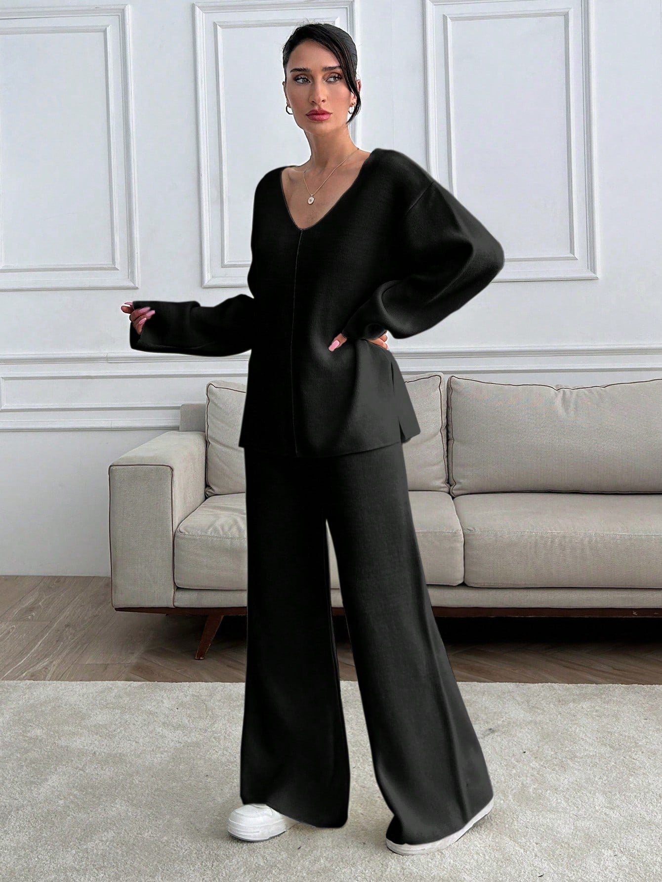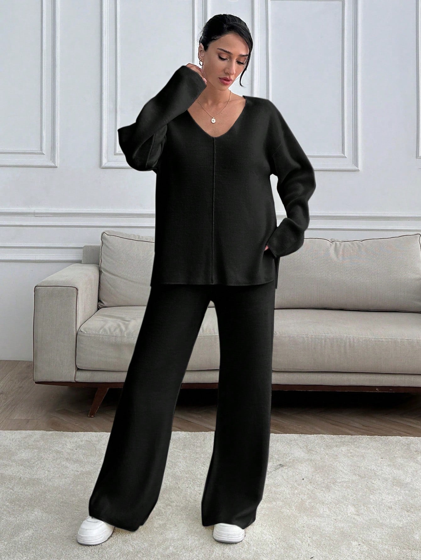 طقم نسائي من EURMUSE مكون من كنزة صوفية واسعة برقبة على شكل حرف V وبنطال محبوك