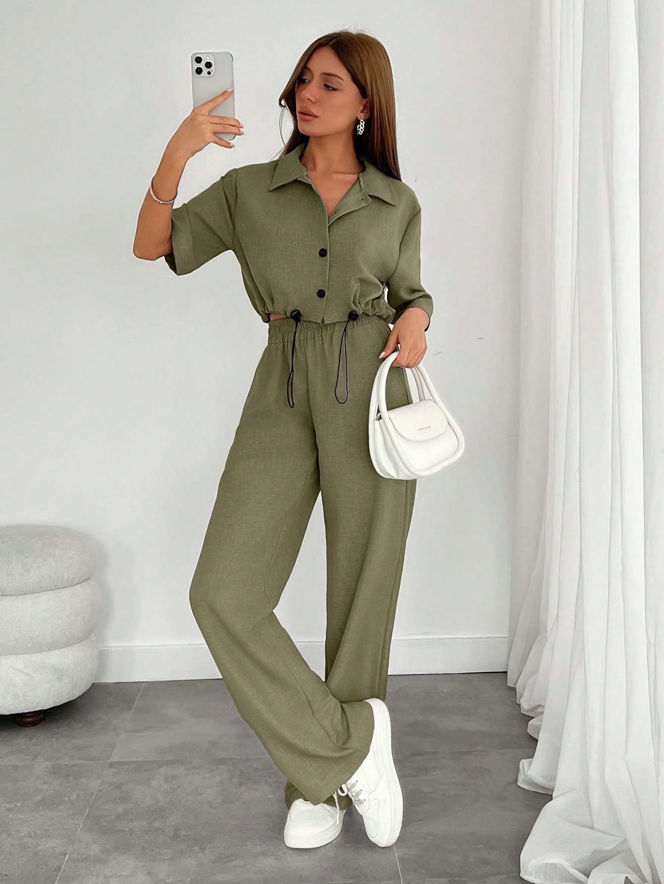 طقم نسائي من قطعتين من EURMUSE: قميص وبنطال واسع الساقين برباط