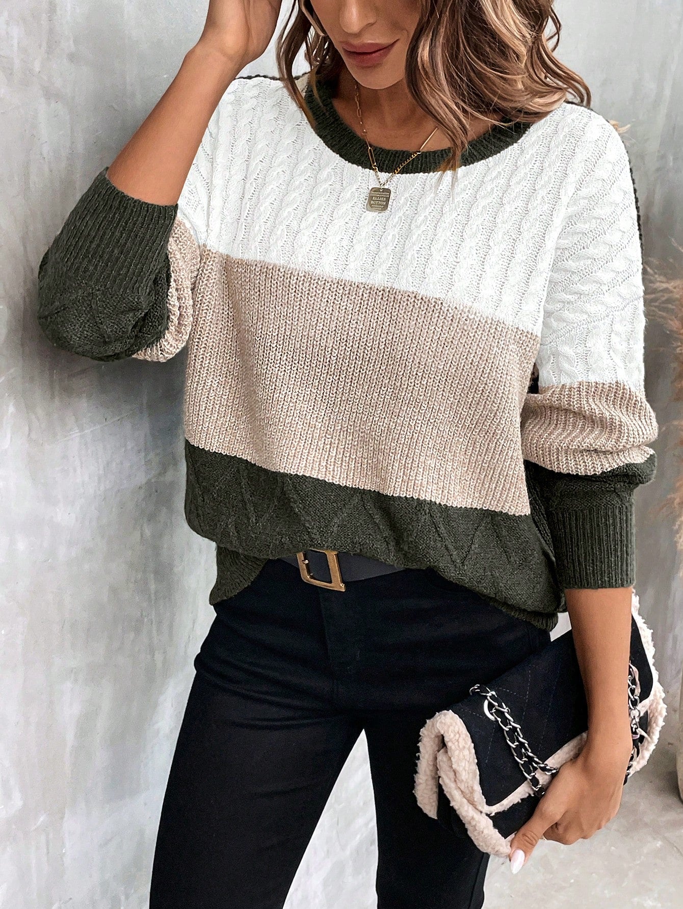 كنزة نسائية من EURMUSE بياقة دائرية وأكمام طويلة بتصميم عصري بألوان متداخلة