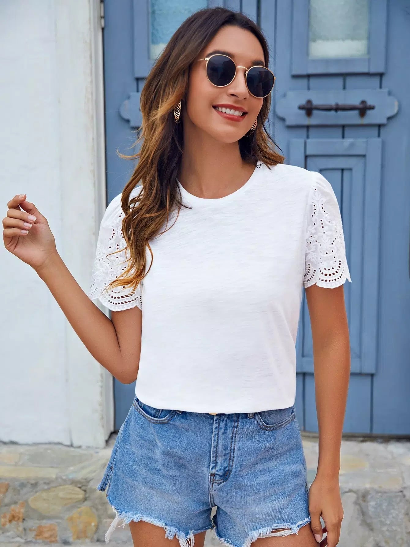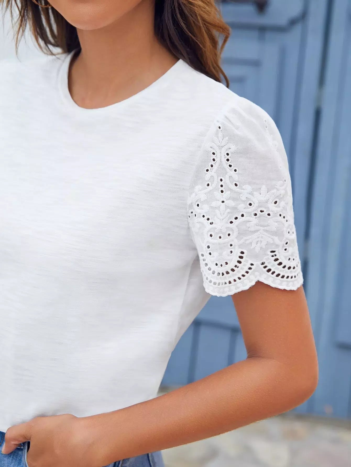 تي شيرت سادة مطرز بعروق على شكل عيينة