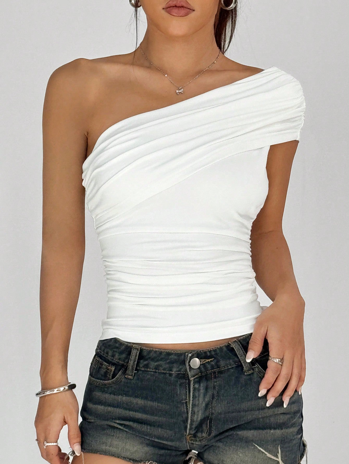 EZwear Casual Minimalist White Tube Top Ruched One Shoulder Backless Top Blouse