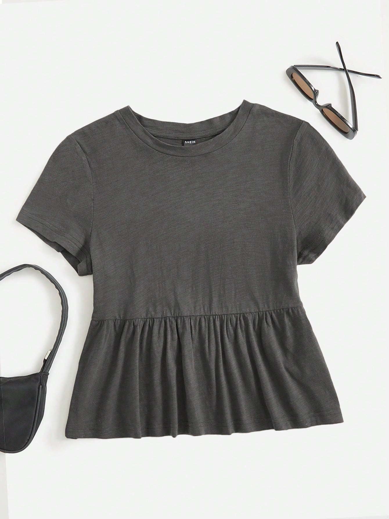 تيشيرت نسائي رمادي محبوك من إيزيوير، بياقة دائرية وأكمام قصيرة وحافة مكشكشة
