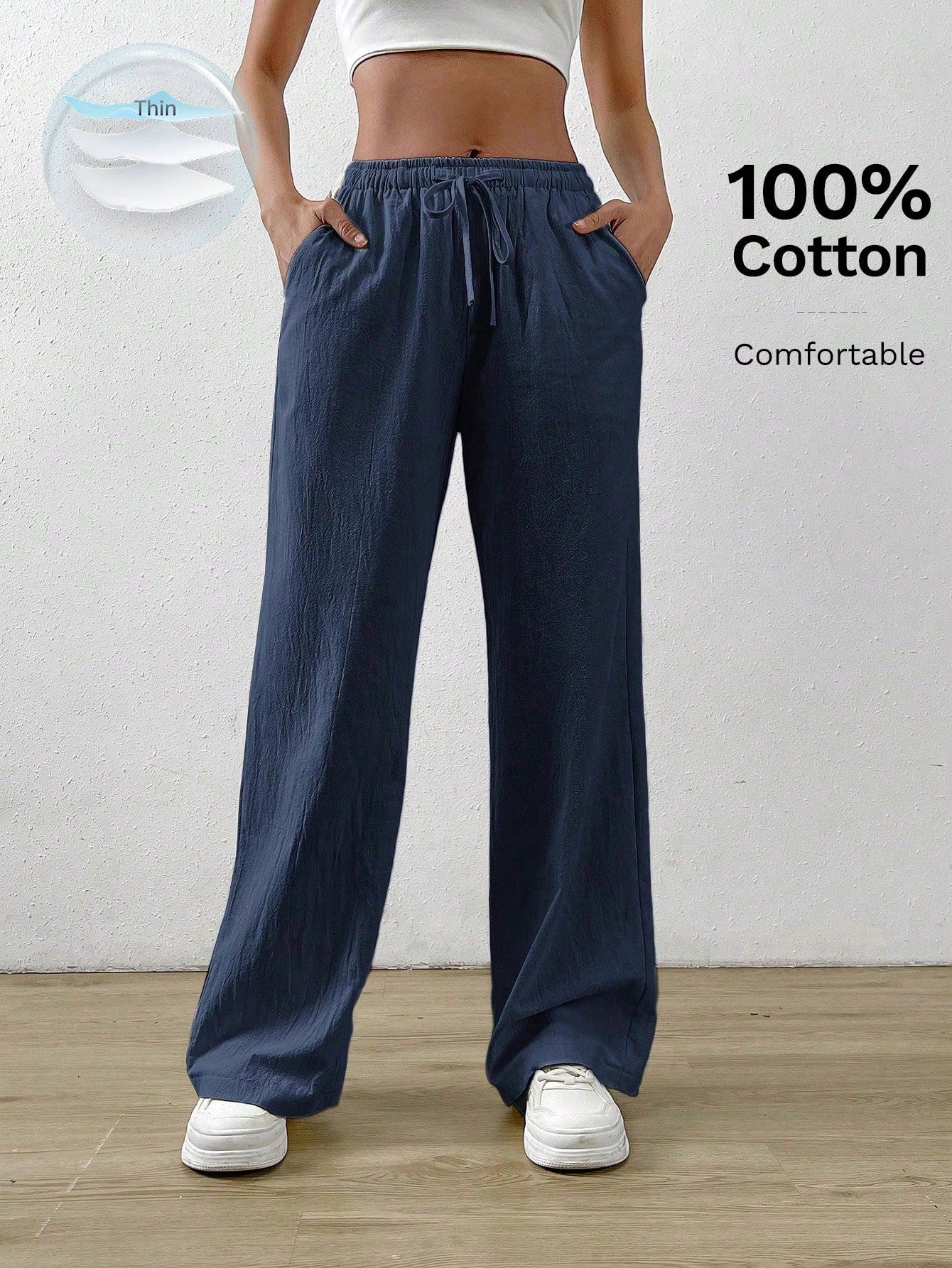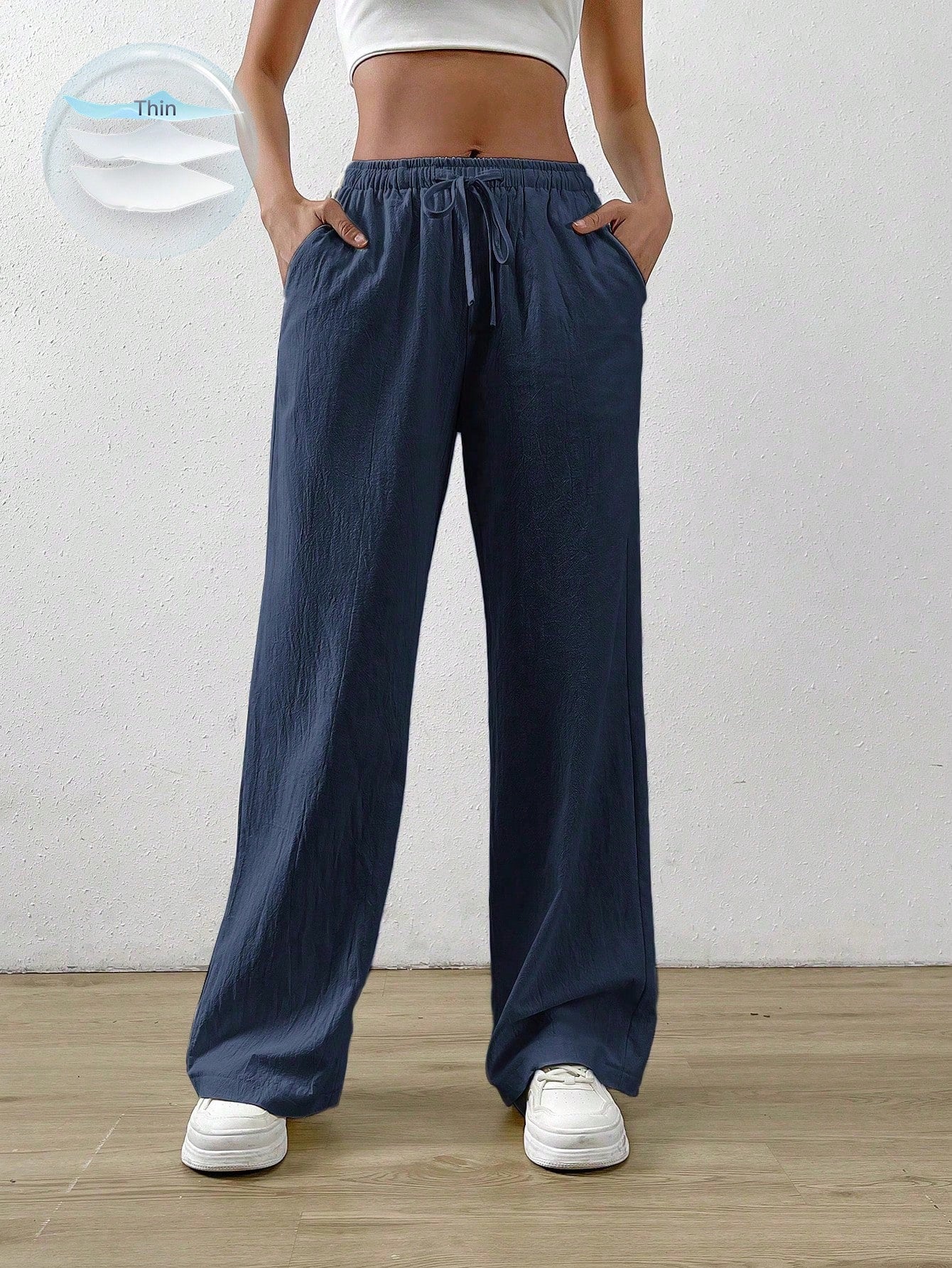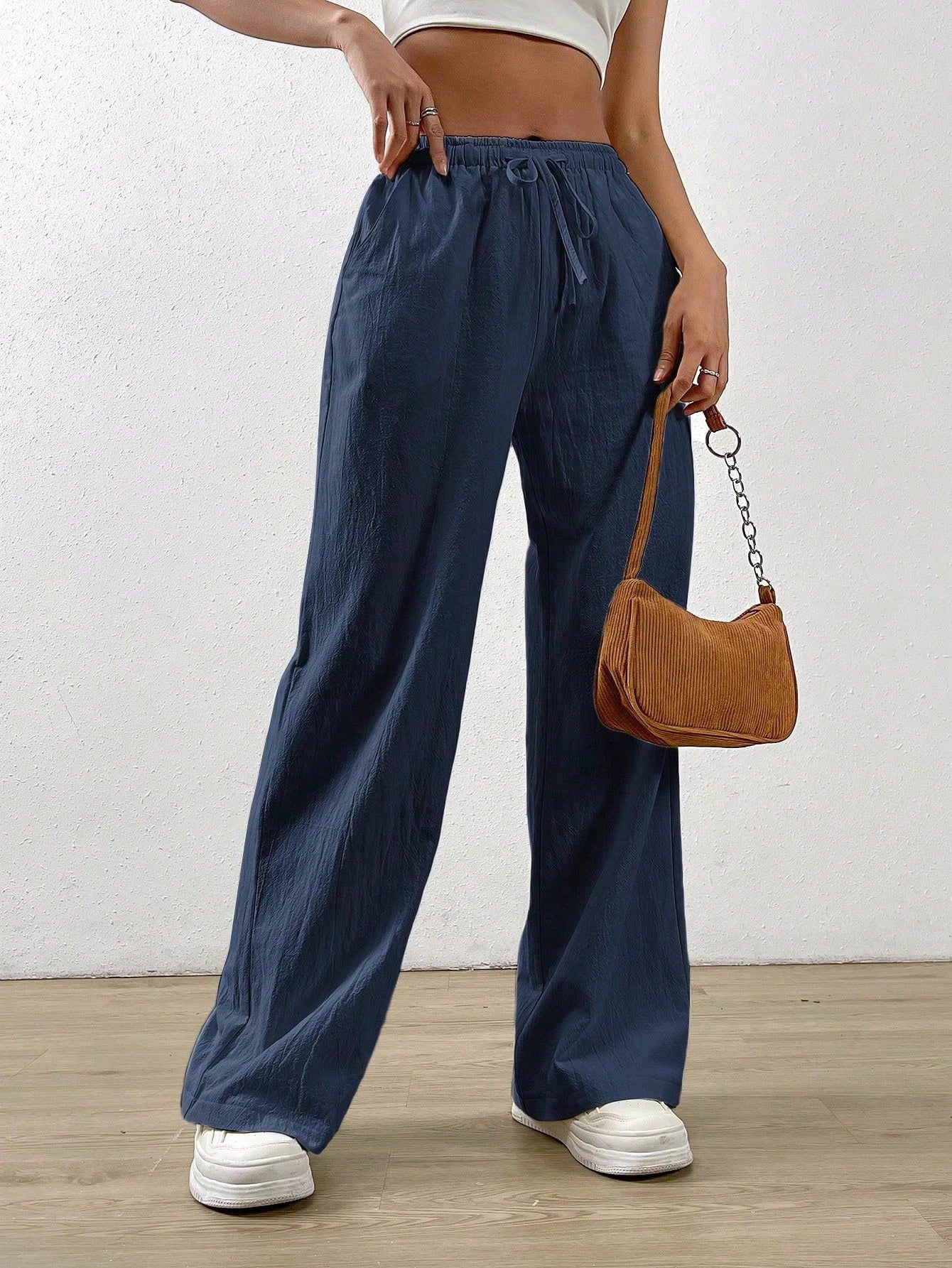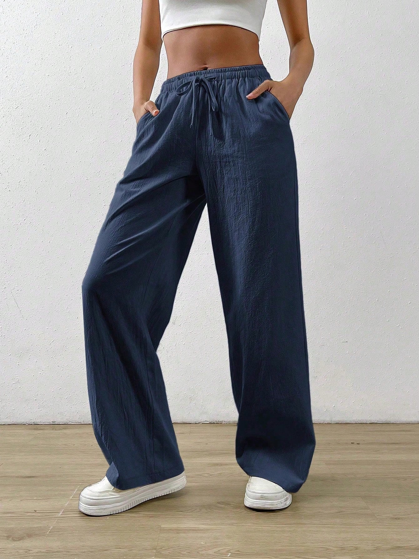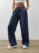 بنطال واسع الساقين من القطن والكتان باللون الأزرق الداكن من إيزيوير، بخصر برباط وجيب مائل.