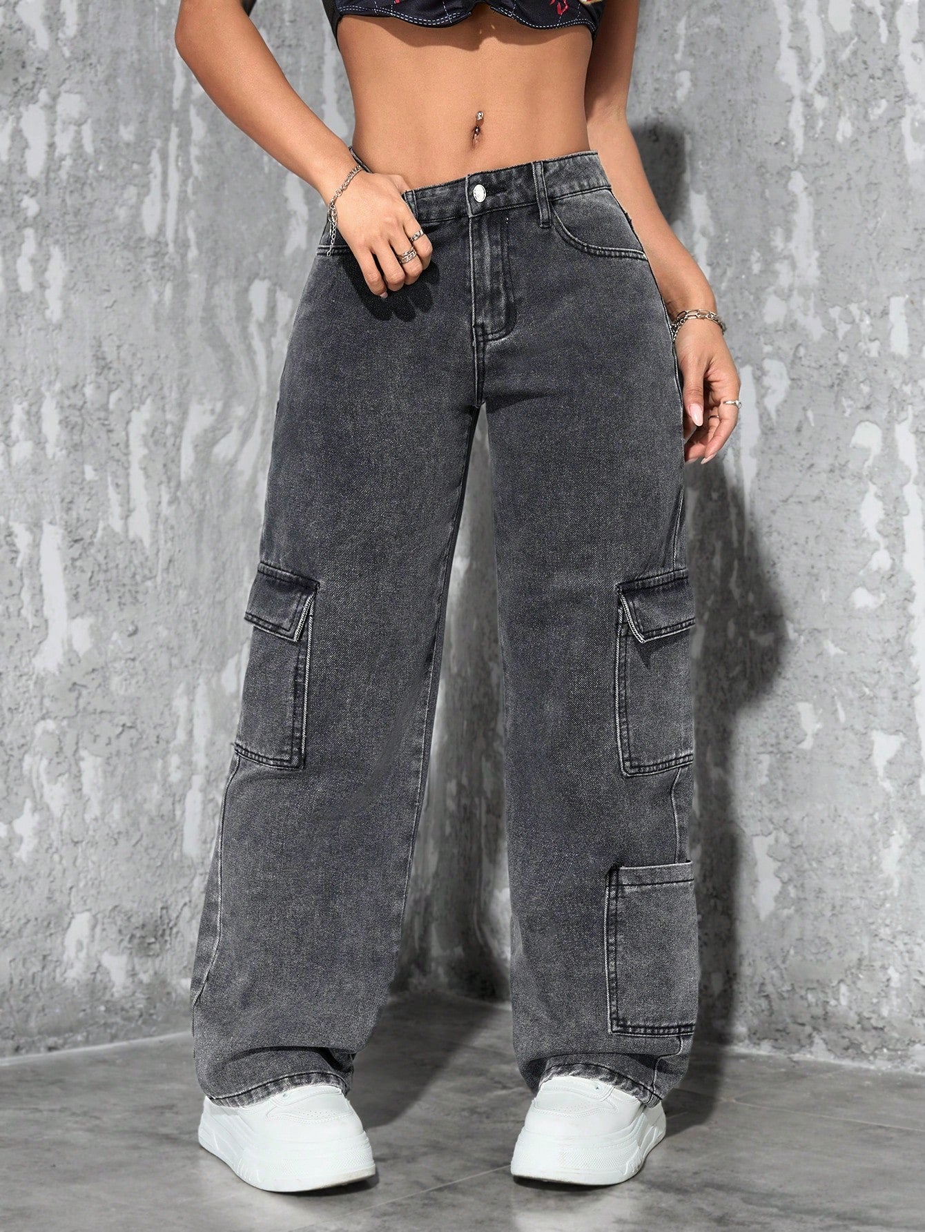 EZwear Women's Cargo Pocket Wide Leg Casual Jeans