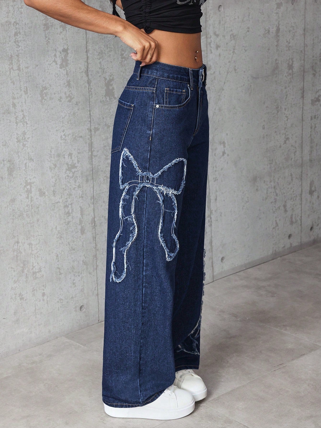EZwear Women's Front Button Pocket Bow Decor Fringe Trim Relaxed Fit Jeans