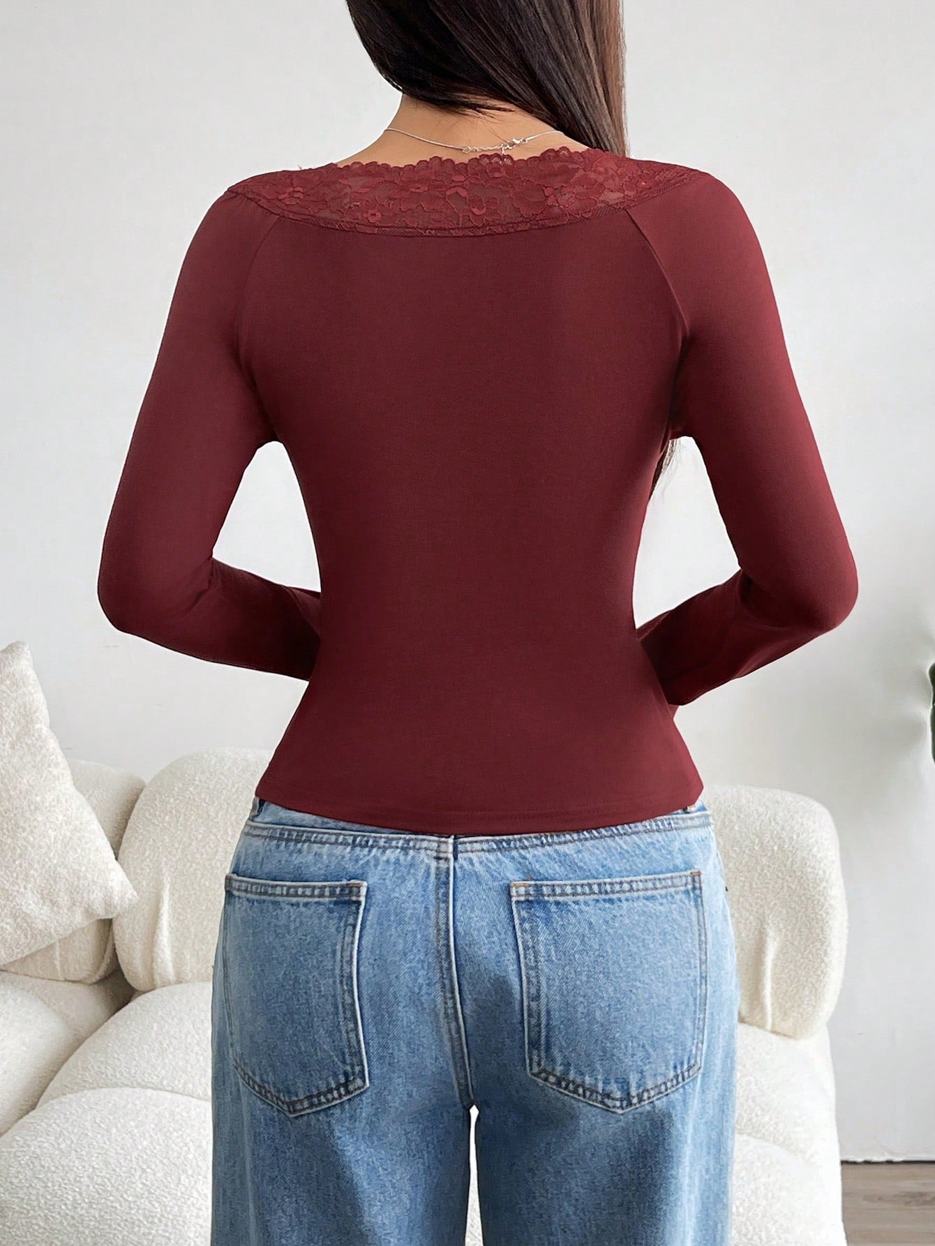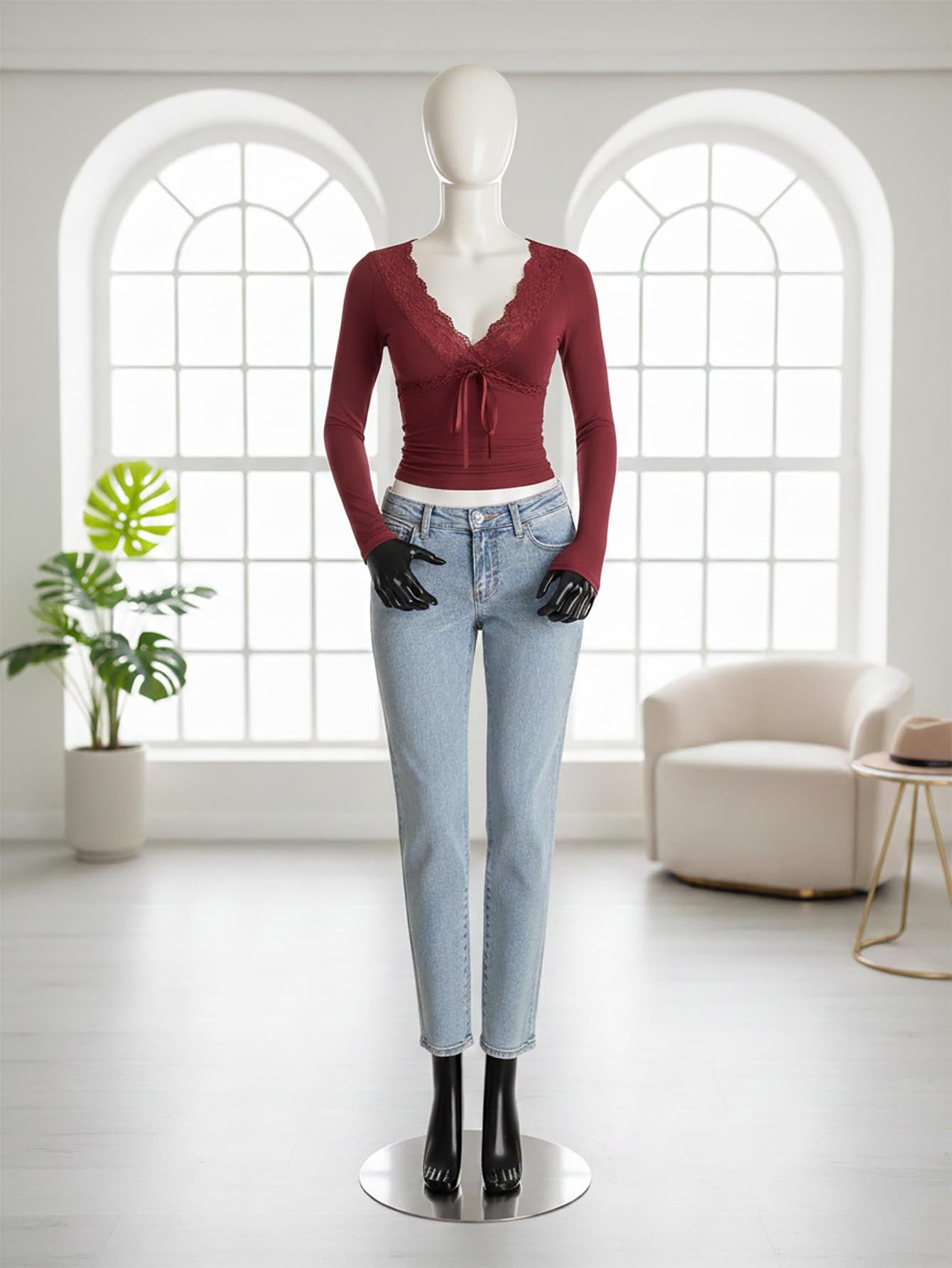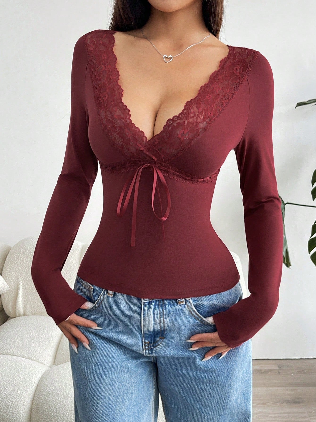 بلوزة نسائية من إيزيوير، مزينة برباط دانتيل، بياقة على شكل حرف V وأكمام طويلة.
