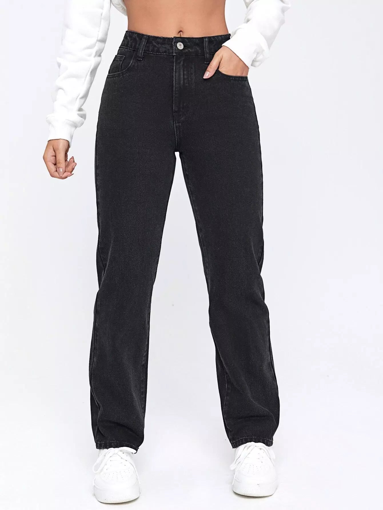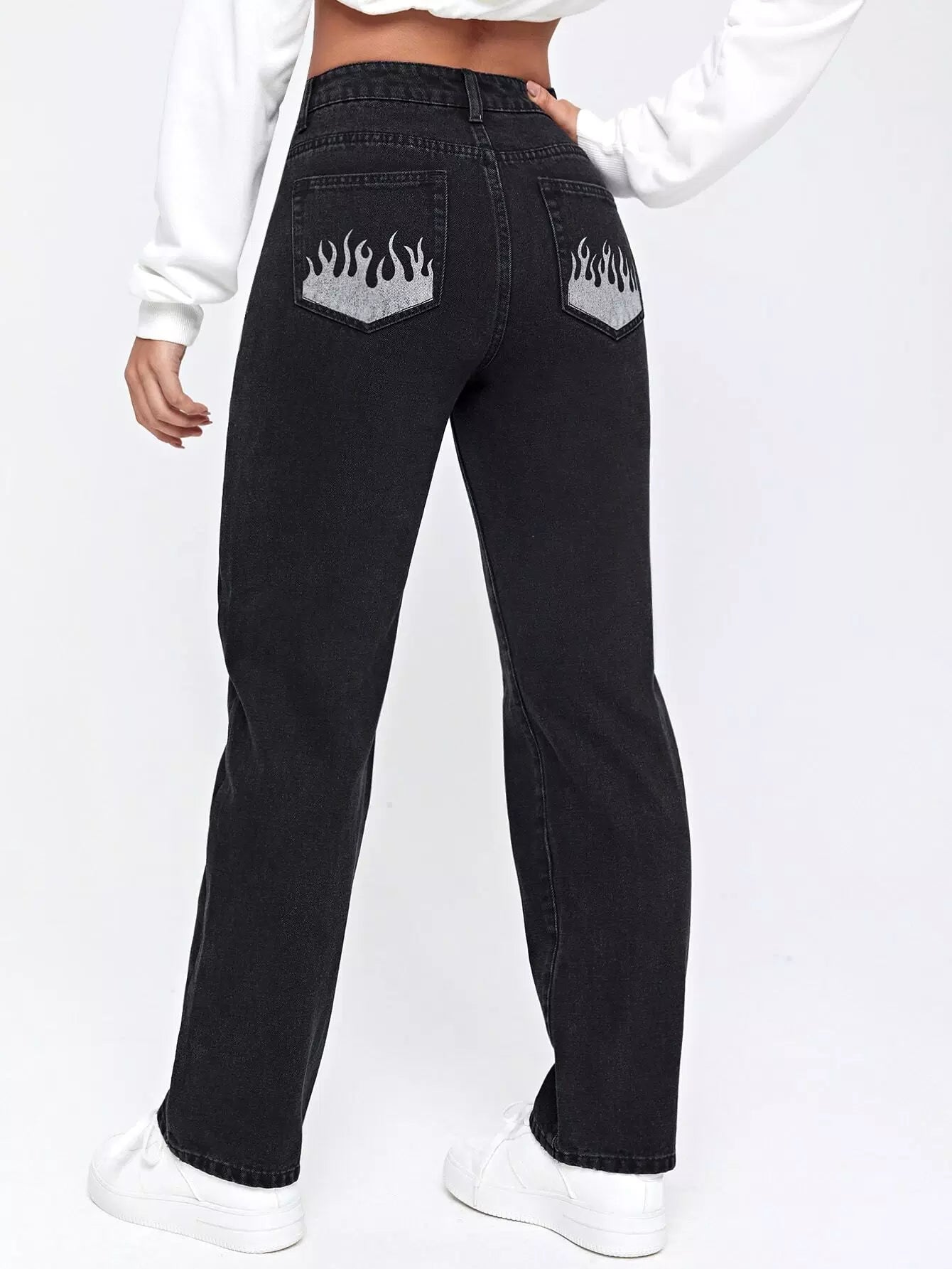 بنطلون جينز جينز مستقيم بجيب مستقيم بطبعة نار